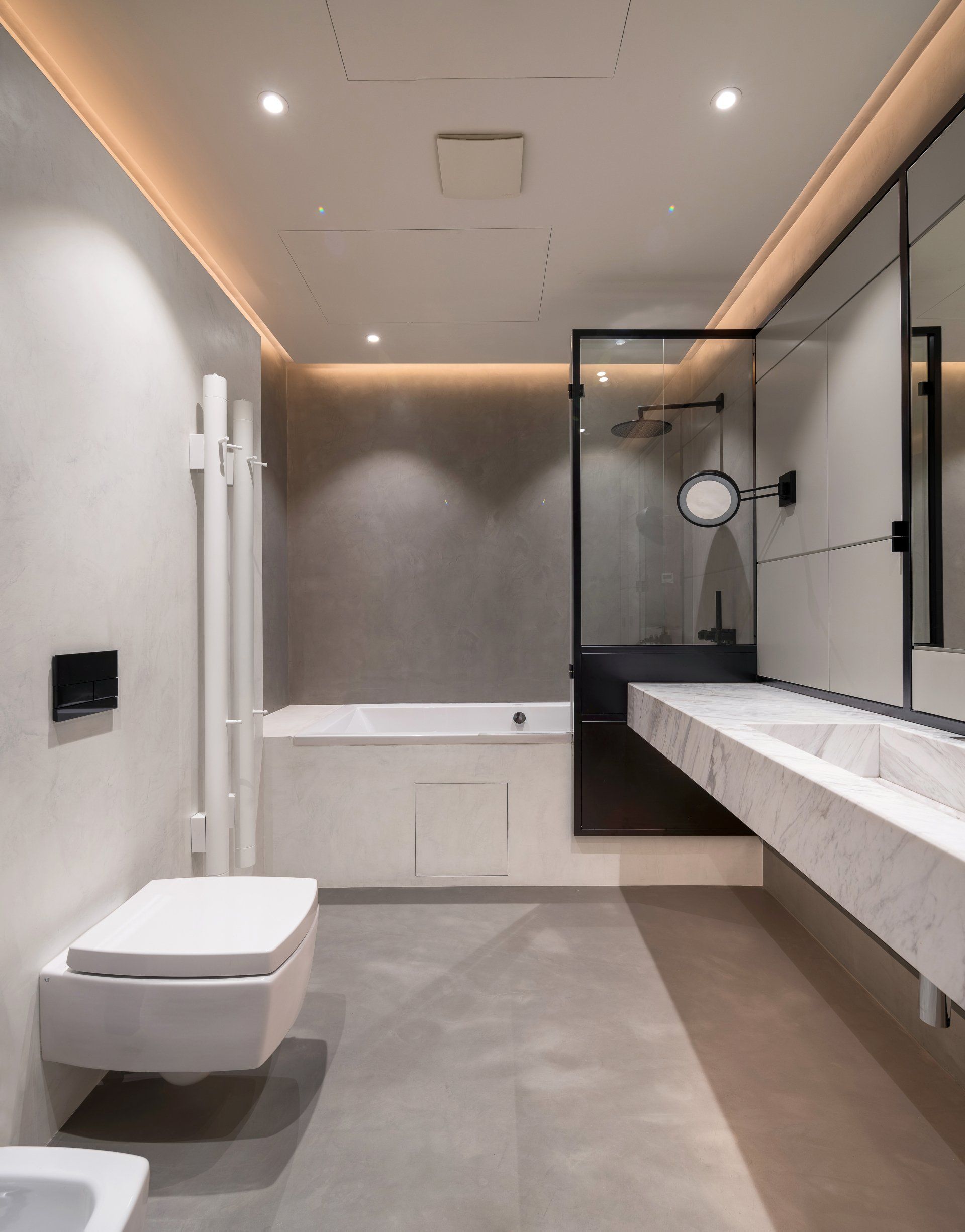 The attic is a modern loft devoid of historic features, but thanks to the same monochrome palette it feels like a natural extension of the ground floor. Walking through the apartment one cannot help but notice the vibrancy of muted tones reflected in the harmony of distinct textures. The floor is divided into three zones – master bedroom with master bathroom, office and a large walk-in closet, guest bedroom and bathroom and a laundry room.