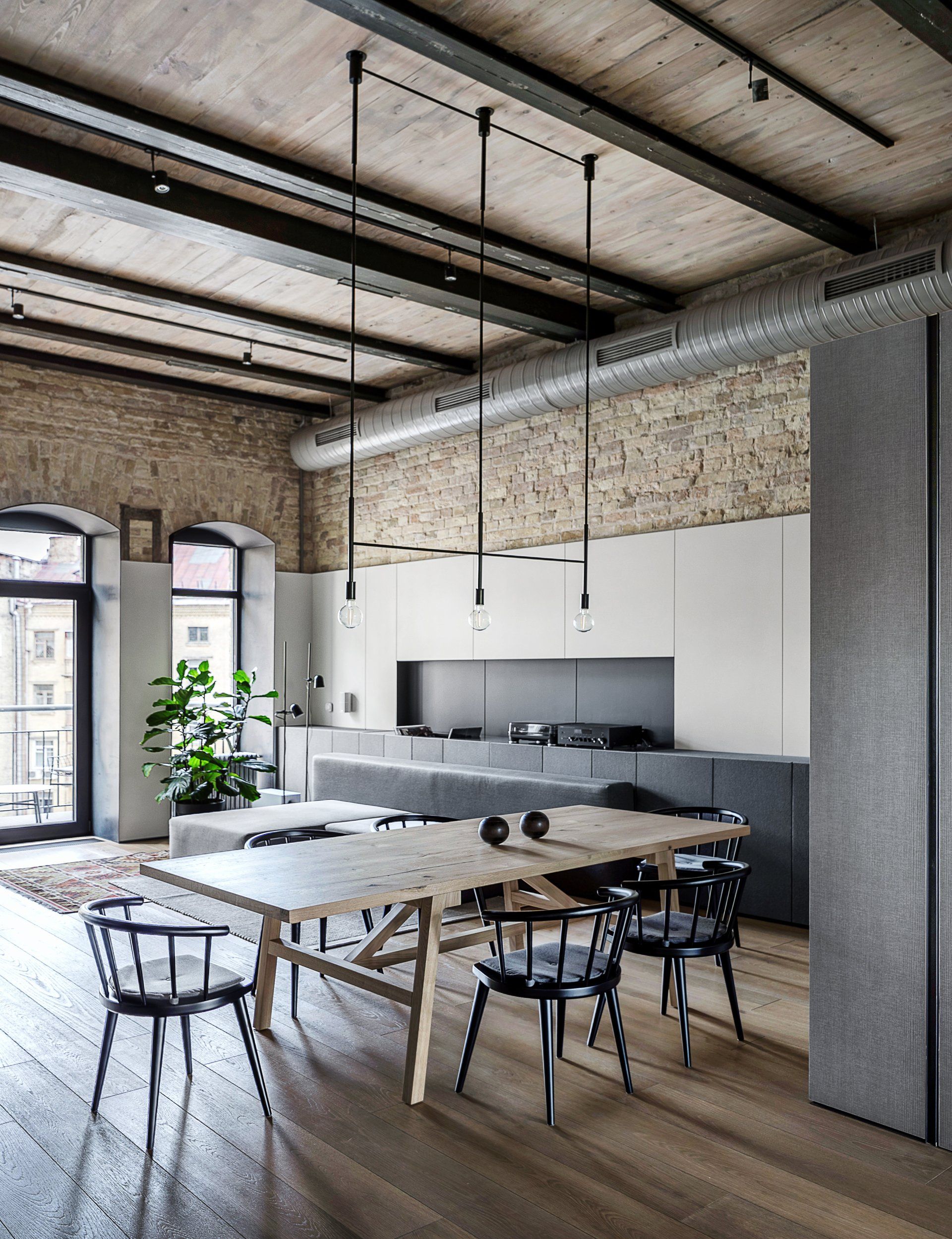 Preliminary assessment of a two-level, 180-sq.m space in a listed building revealed an original brickwork hidden under layers of plaster, old timber ceiling joists and sloped walls in the attic. Balbek studio has preserved and restored it creating a right balance between the old and the modern.