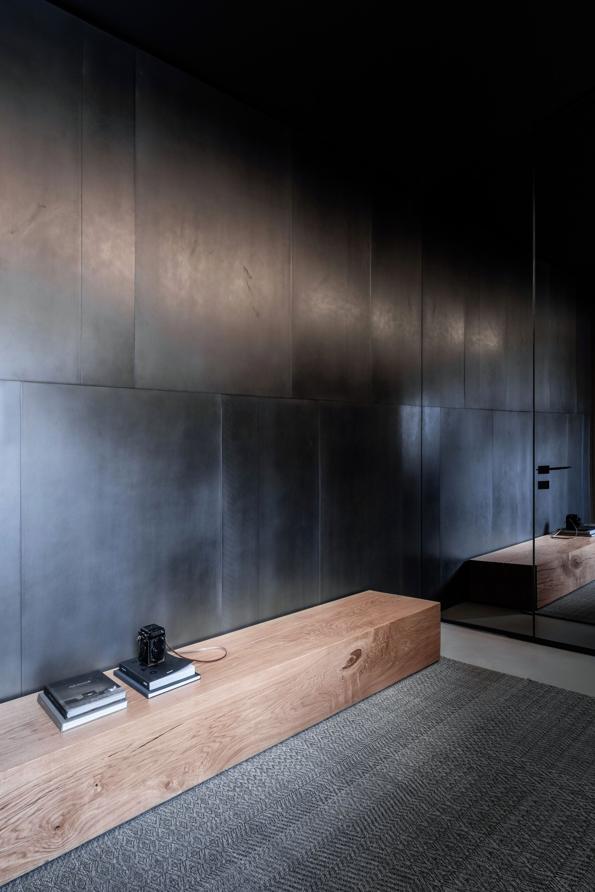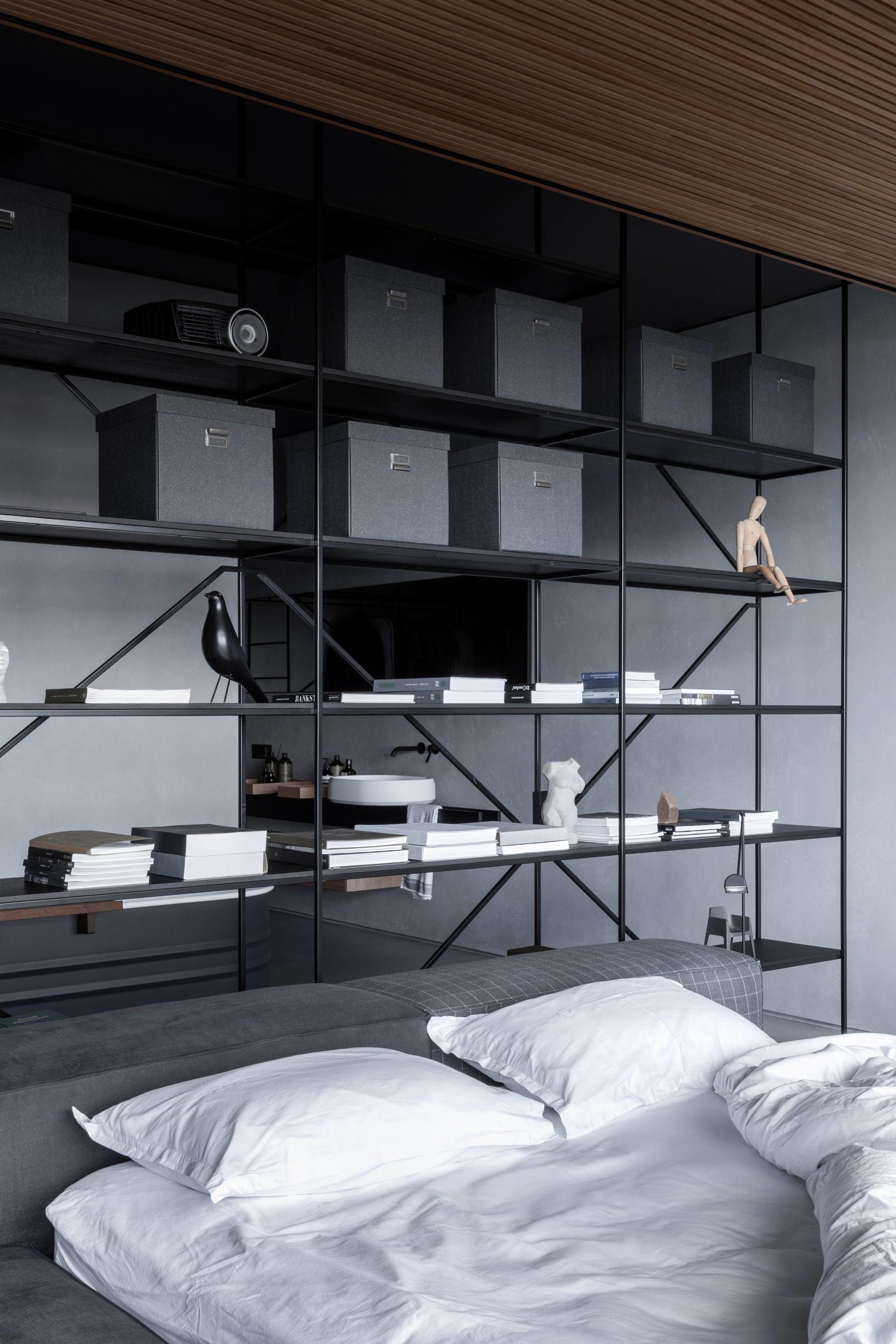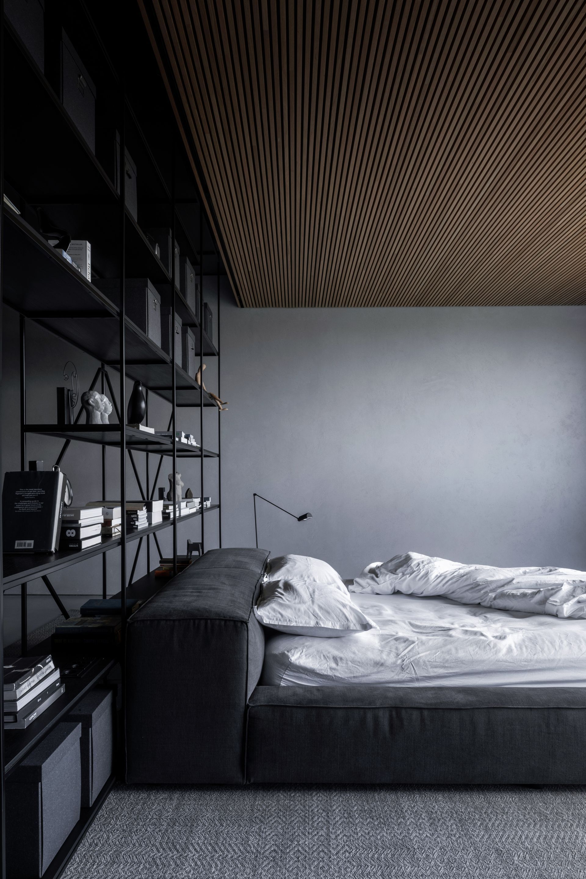 The master bedroom and bathroom are combined into a single space, separated by shelving. Halftones and raw, unprocessed materials create the atmosphere and mood of this interior.