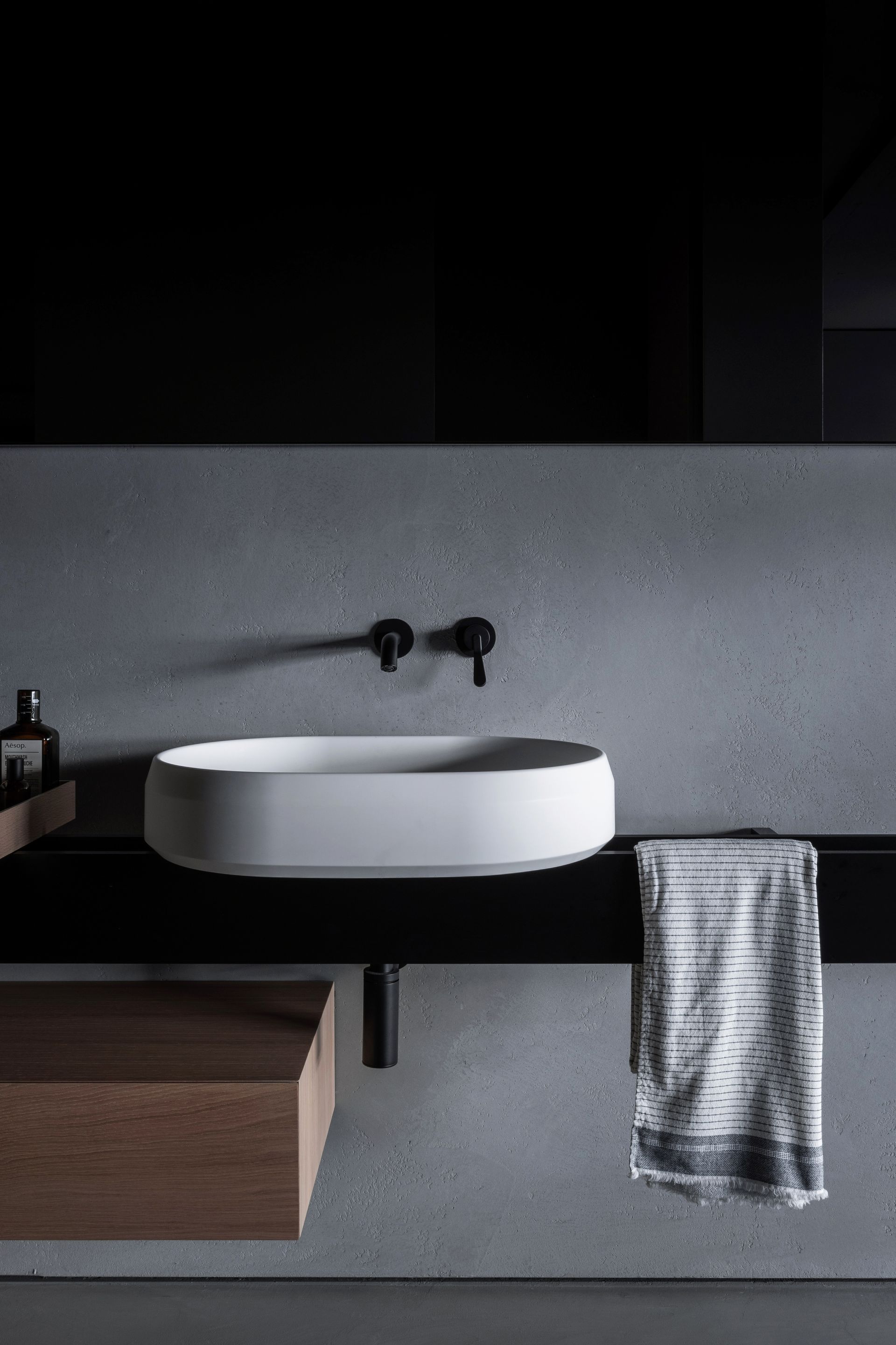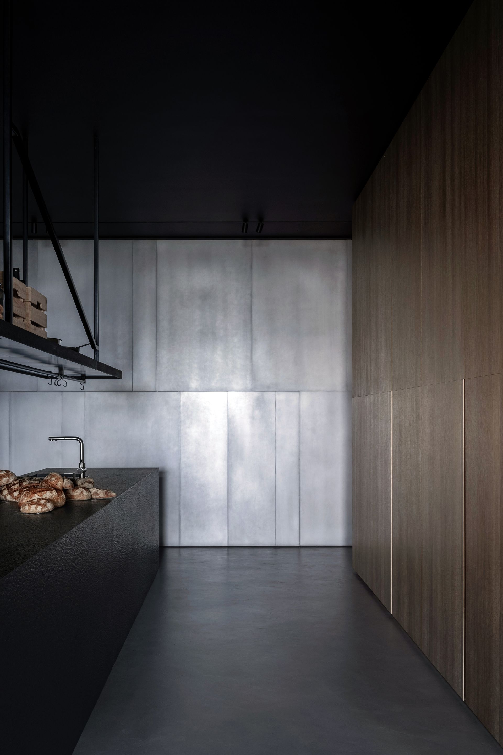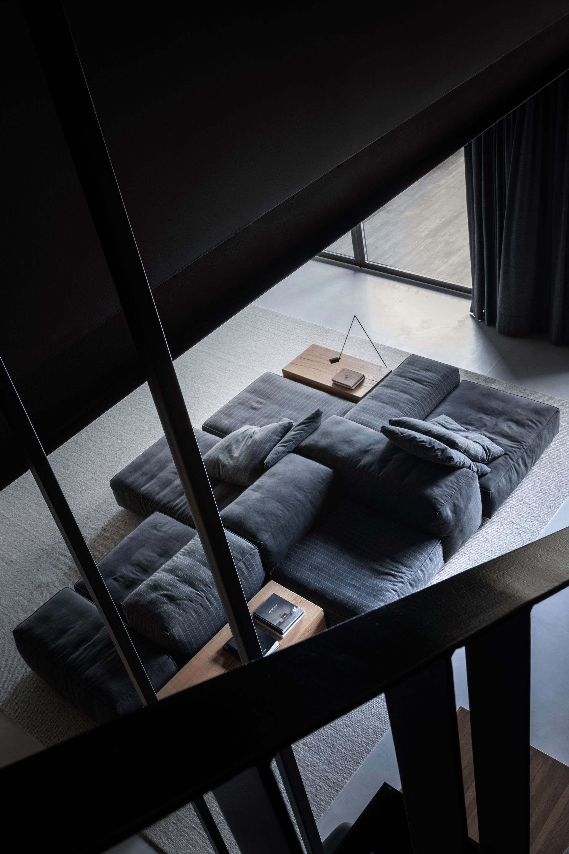 The master bedroom and bathroom are combined into a single space, separated by shelving. Halftones and raw, unprocessed materials create the atmosphere and mood of this interior.