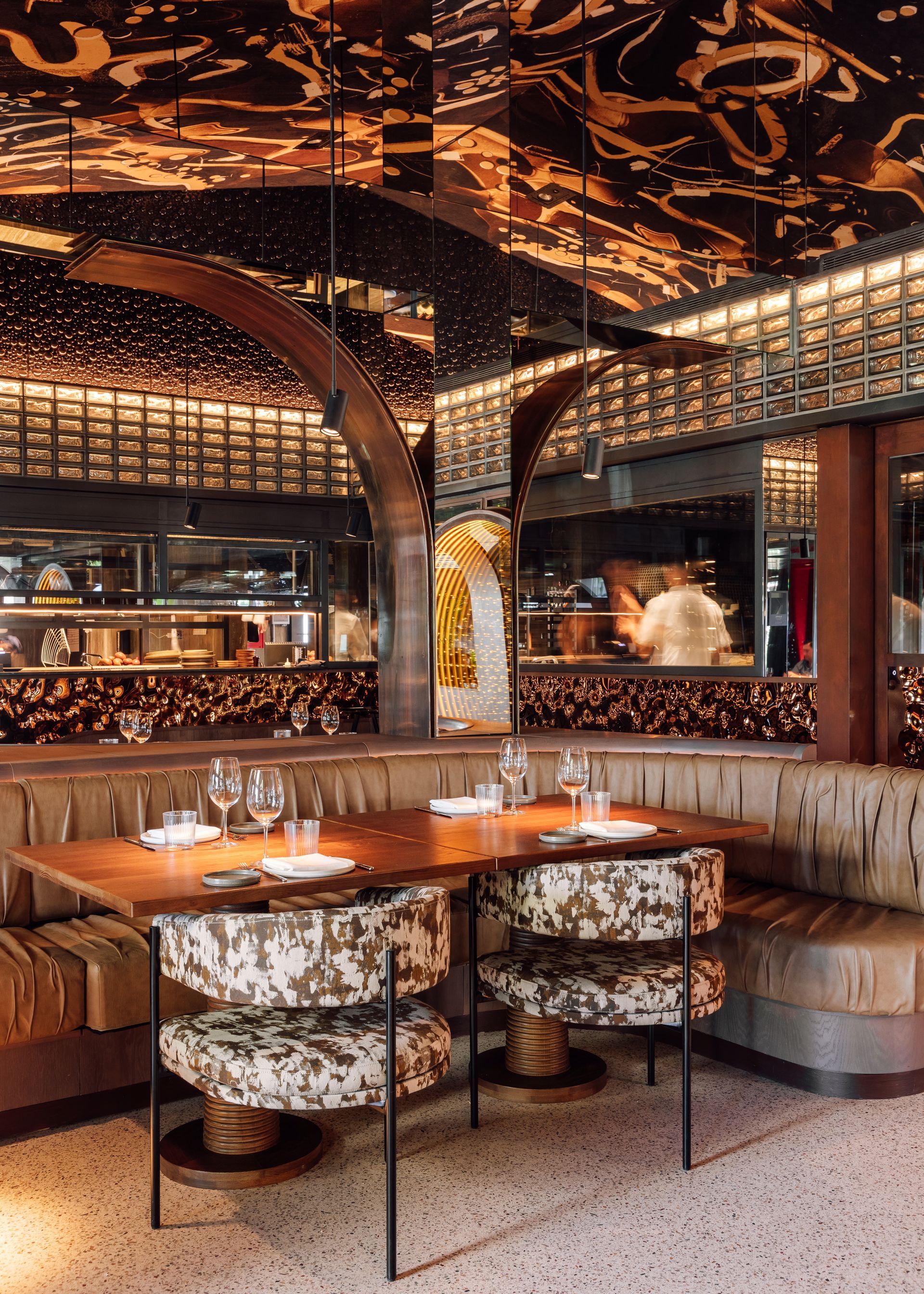 Another noteworthy aspect of this interior design project is the perception of the rustic and the contemporary with personality that can be perceived in materials such as the weathered copper and the brick, with which they create reliefs and textures. In fact, these take on an essential role in the concept and aesthetic of Roostiq Marbella, its presence spreading not only to the walls but to all the elements that make up the interior. The sophistication of this idea can be perceived in soft materials such as velvets, textured glass and contrasting lights.