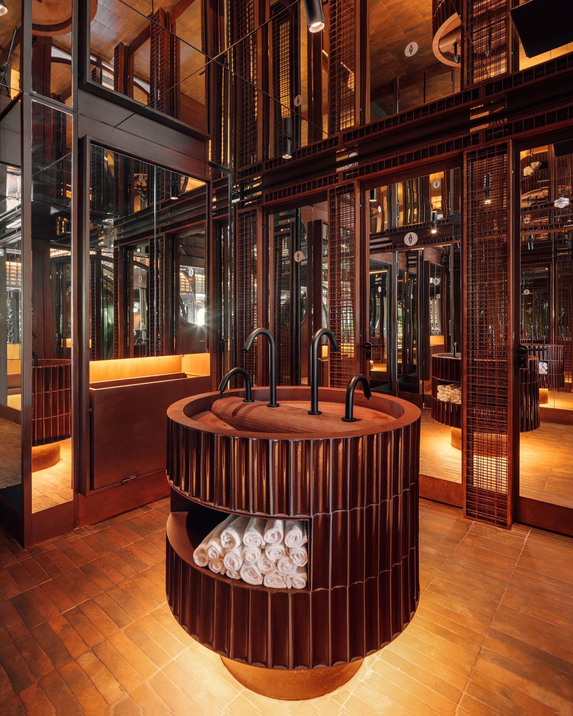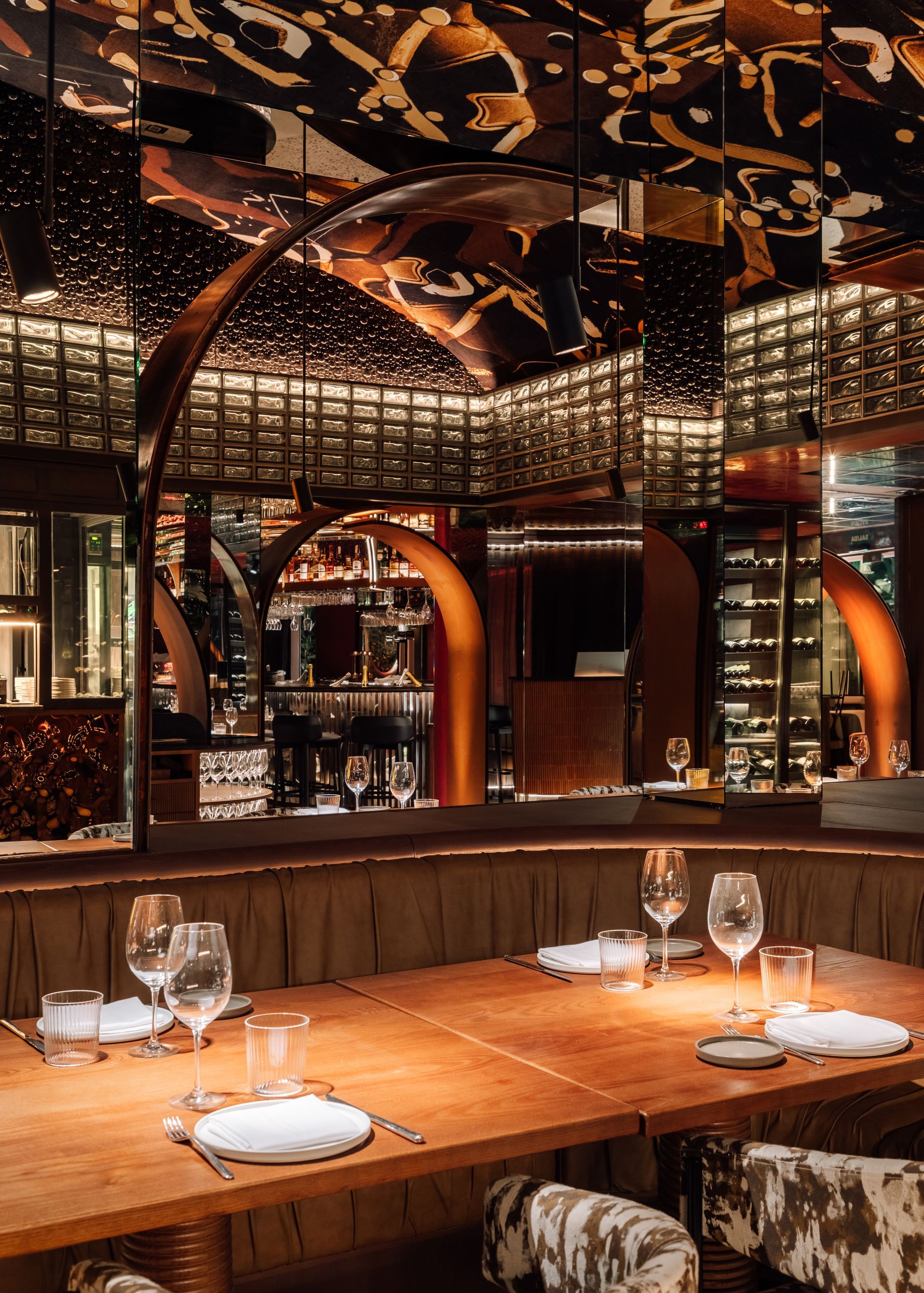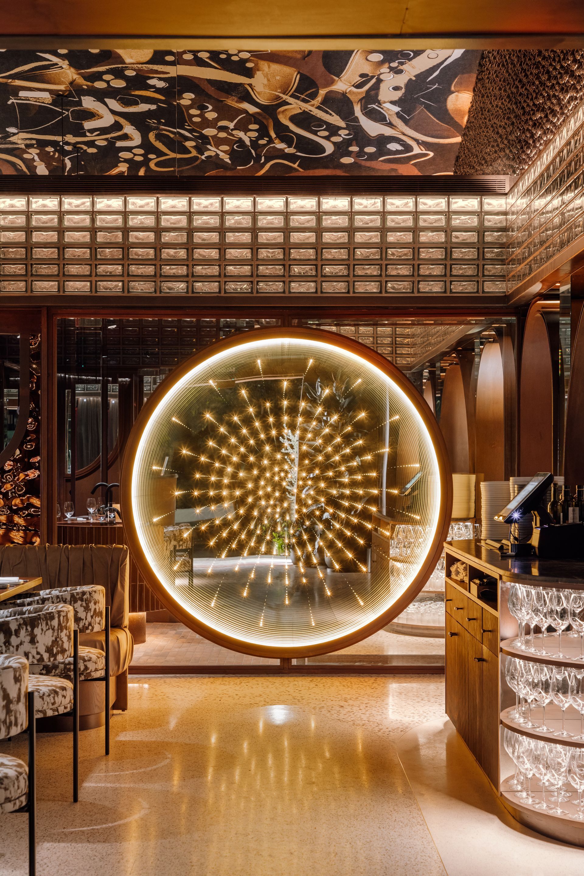 The bathrooms are spaces that also define the idiosyncrasy of interiors designed by Astet Studio. For the design team, they're an essential part and they need to reflect the concept that is present throughout the restaurant. That’s why in this instance, they have recreated two settings, daytime and nighttime, the same as in the restaurant. The main feature is the large mirror that is turned off during the day and reflects all the surroundings, and which lights up at night becoming an infinite mirror with points of warm lighting that represent the champagne bubbles. Behind it, the toilets, a box of mirrors with an industrial style wire mesh with a three-dimensional effect in brown tones. The washbasin is also an Astet Studio design and it plays with the idea of reflection. The insides of the cubicles stand out for their wooden domed ceilings.