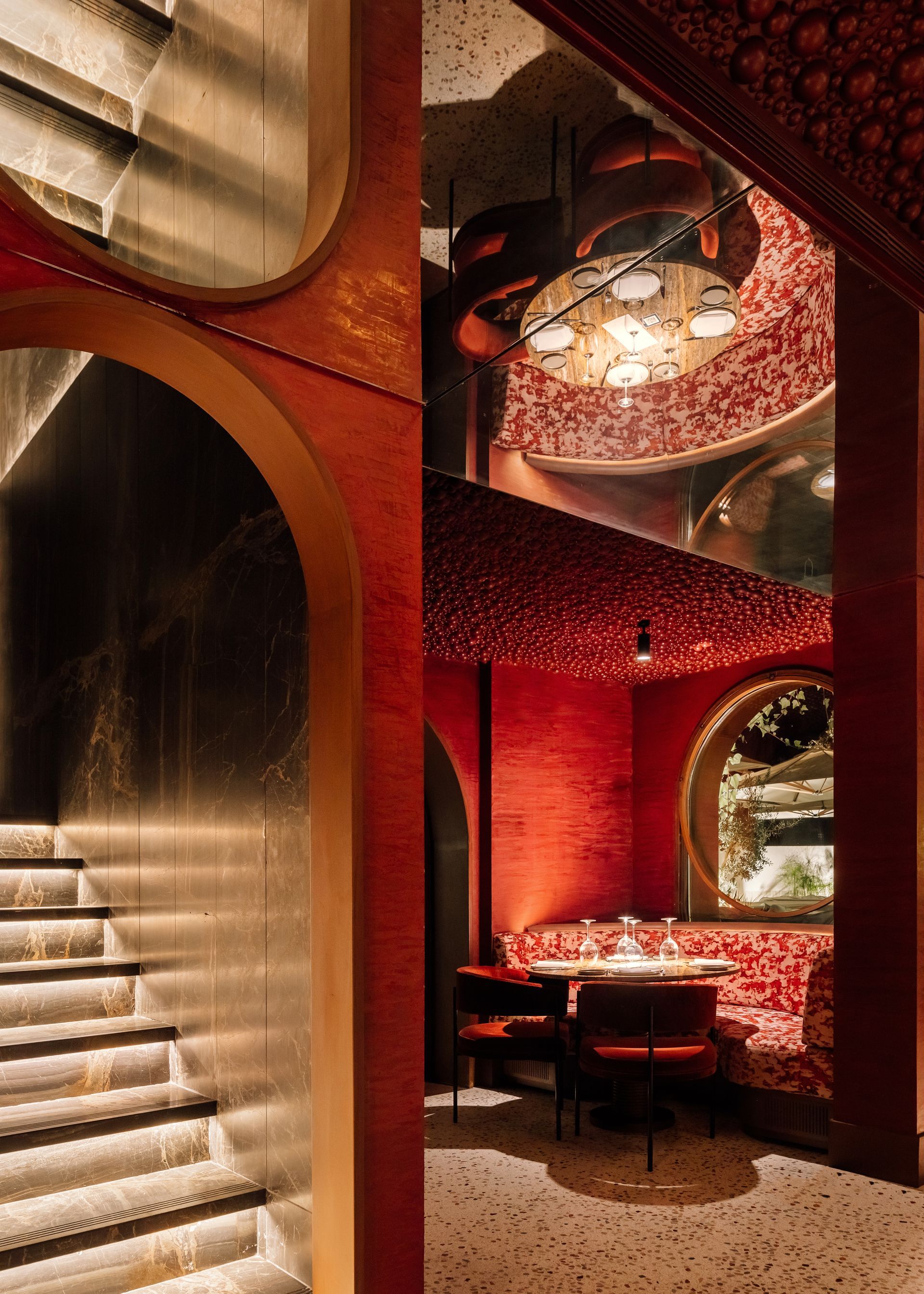 The main dining area is lined with mirrors. In this case, they decided to eliminate the original structure and chose to decorate the ceiling with a large carpet in bright colours, reds, yellows and russet tones. The design of this carpet is made up of circular psychedelic shapes, which in a way seeks to replicate the idea that the food is also above us. This central ornamental feature and the mirrors duplicate and promote a different perspective of this vibrant space. The material chosen for the flooring is terrazzo, and the walls of the interiors have combined wood and travertine in different tones.