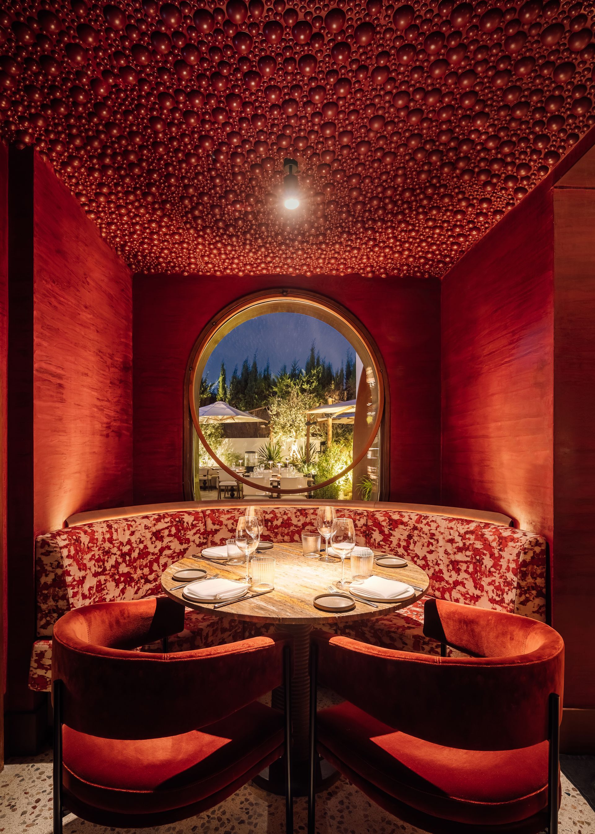 Another of the key elements of the Roostiq concept is its firm commitment to fine drinking, by means of a wine cellar that treasures hundreds of references including champagnes, burgundy wines, national wines and wines from different parts of the world. In total, Roostiq Marbella has two wine cellars, one in the private area and the other on the ground floor, as well as the Bubble Bar: a champagne bar where bubbles are the characteristic feature throughout the interior, as well as the textures with reliefs shaped as spheres in contrast to the dark blue, almost black, that transforms the perception of the area, creating a completely different atmosphere. This area has an arc-shaped bar, that is complemented with mirrors providing a sense of space and where copper plays an important part, with the aim of producing reflections and creating different perspectives. In fact, depending on the direction you are facing, it can produce a surprising kinetic effect. In this space, champagne bubbles are the main feature, that’s why they are also present on the ceiling where, through an acrylic material which also absorbs sound, they have created these burgundy-coloured textures that simulate bubbles in 3D format. An original idea by Astet Studio, who also designed the fixed furniture, the ornamental light fixtures, the tables and the patterns on the carpets.