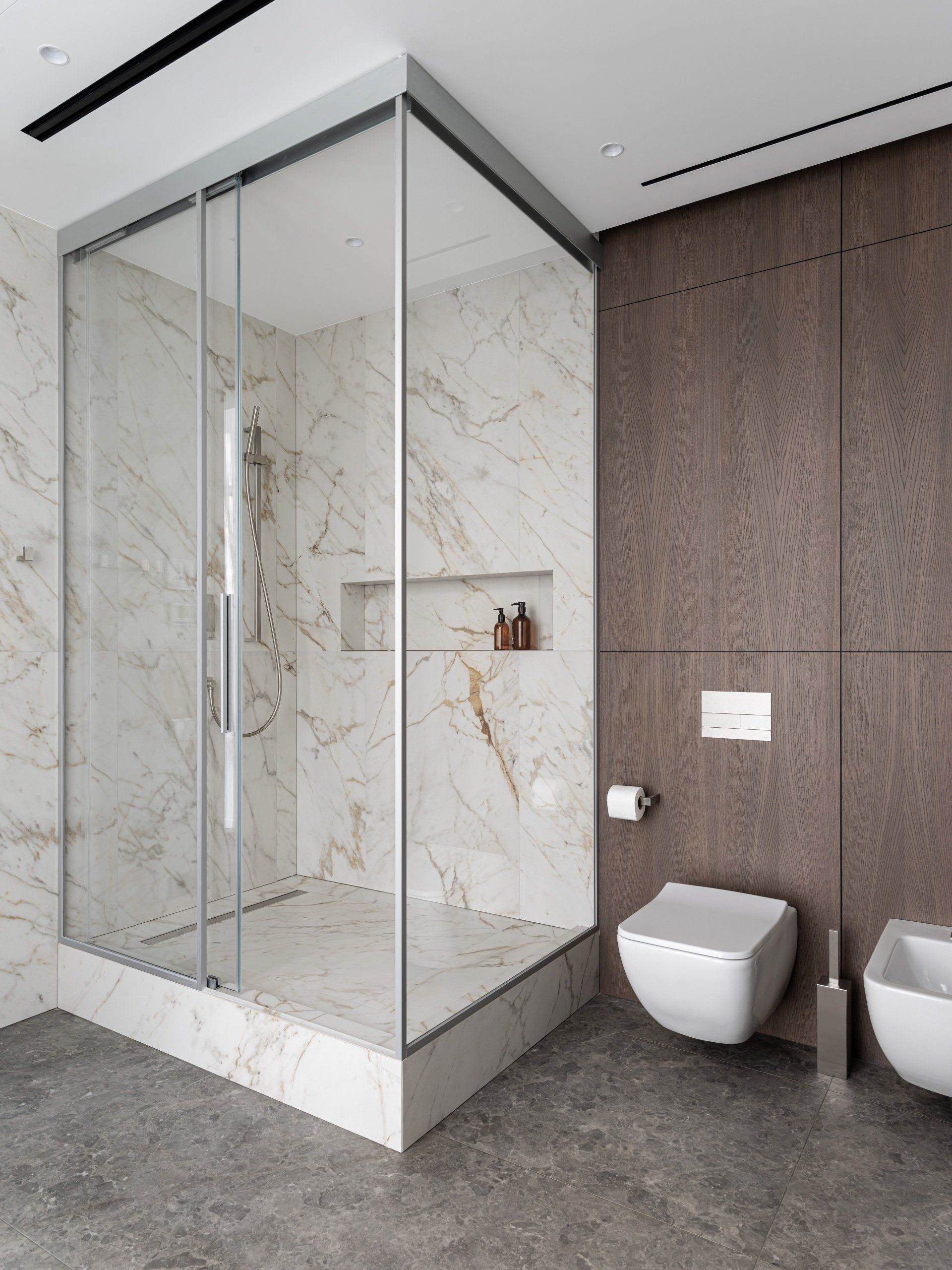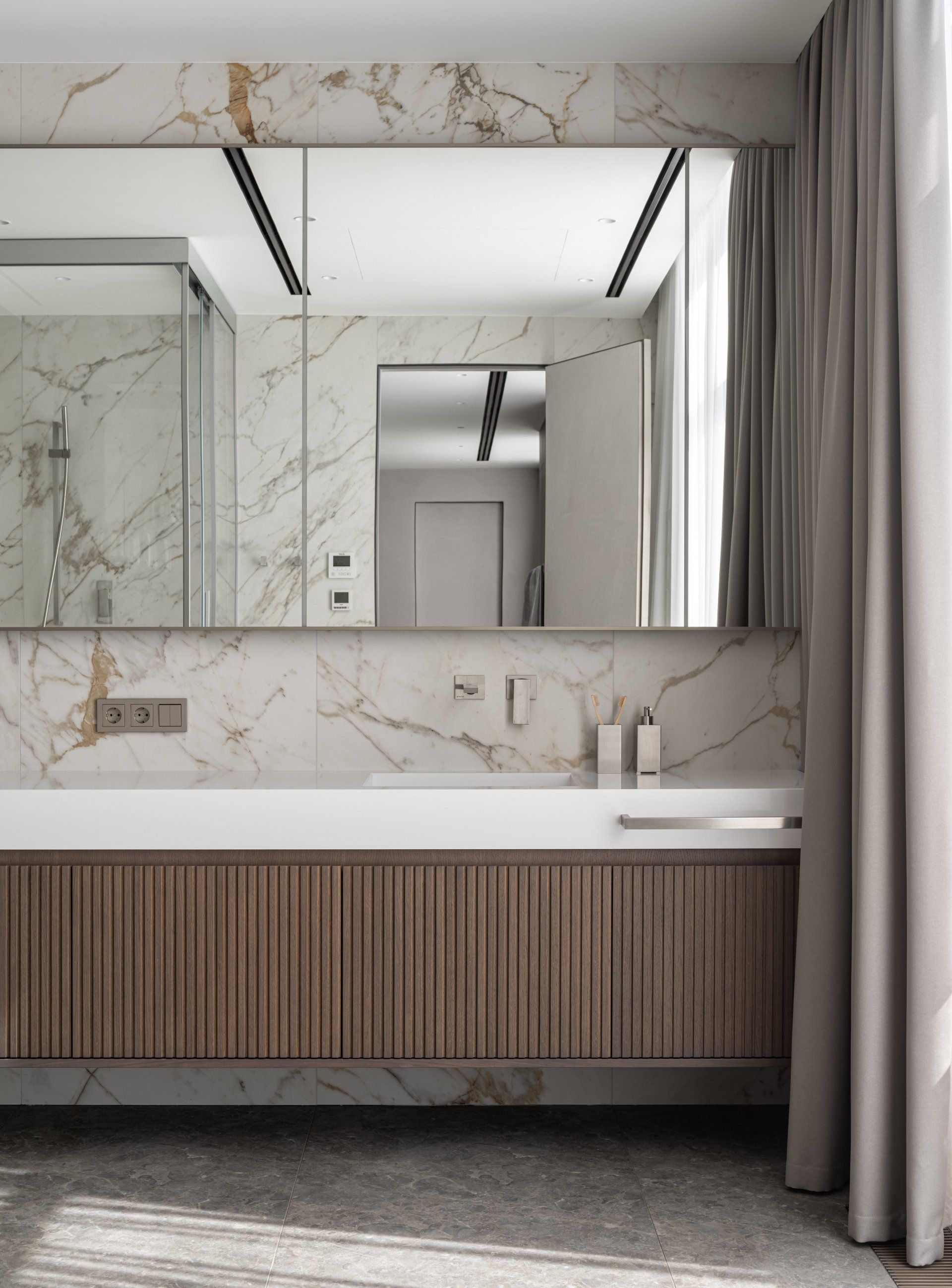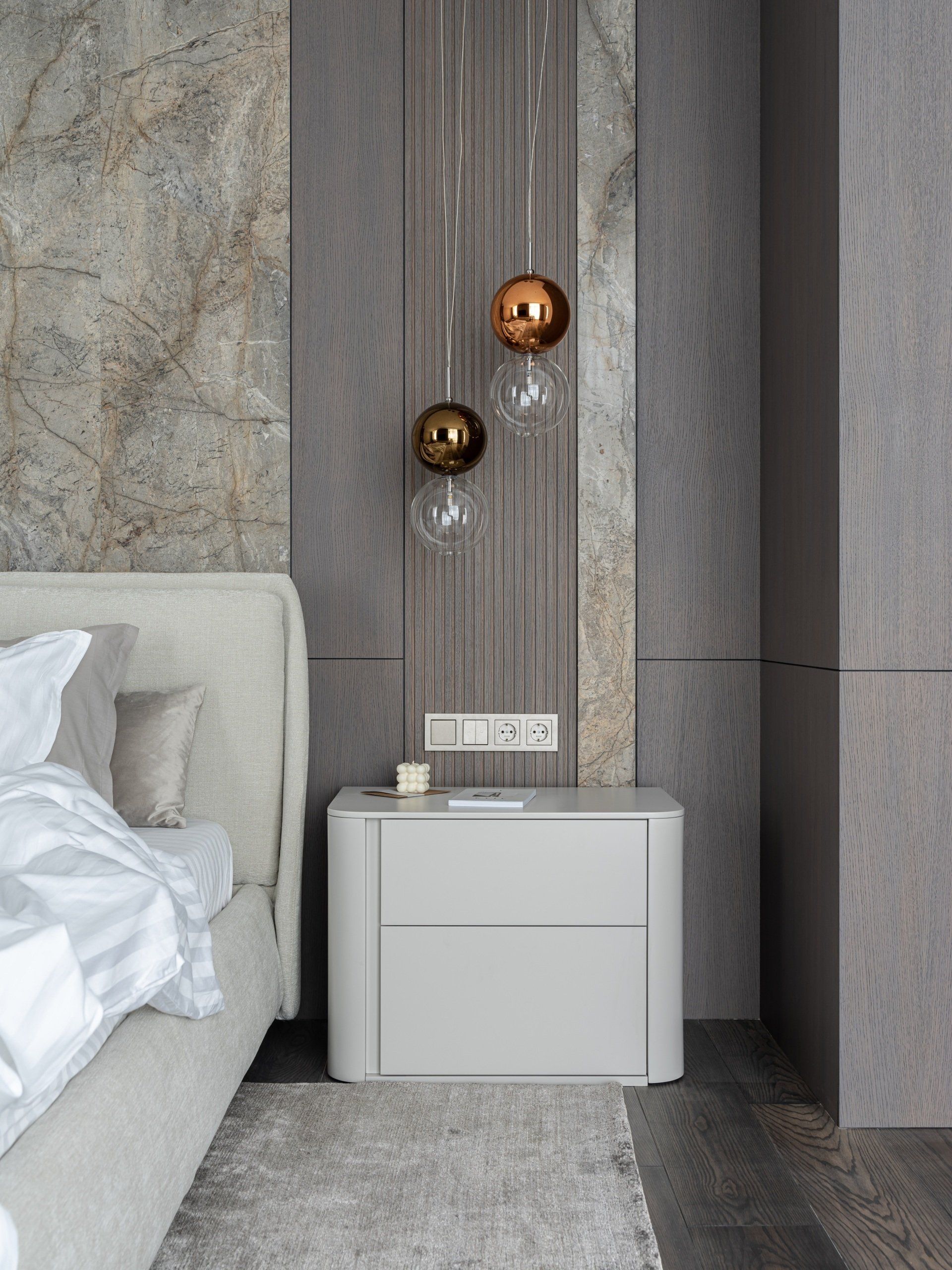 In the master bedroom, veneered panels in composition with Silver Root marble are used on the wall. Veneered panels, accent bedside light and custom-made furniture in neutral colors set the perfect mood for relaxation. From the master bedroom there are exits to separate bathrooms, visually combined with the same materials, but different in color.