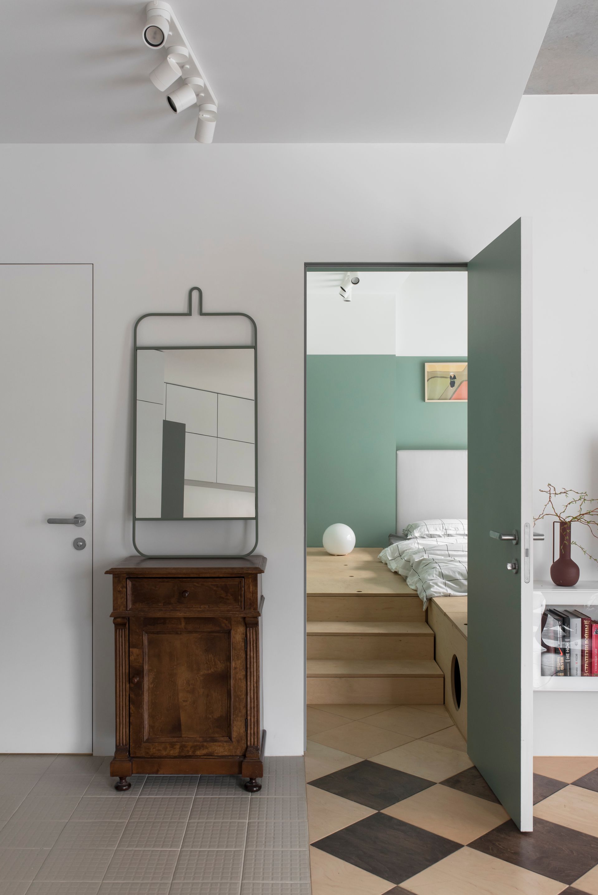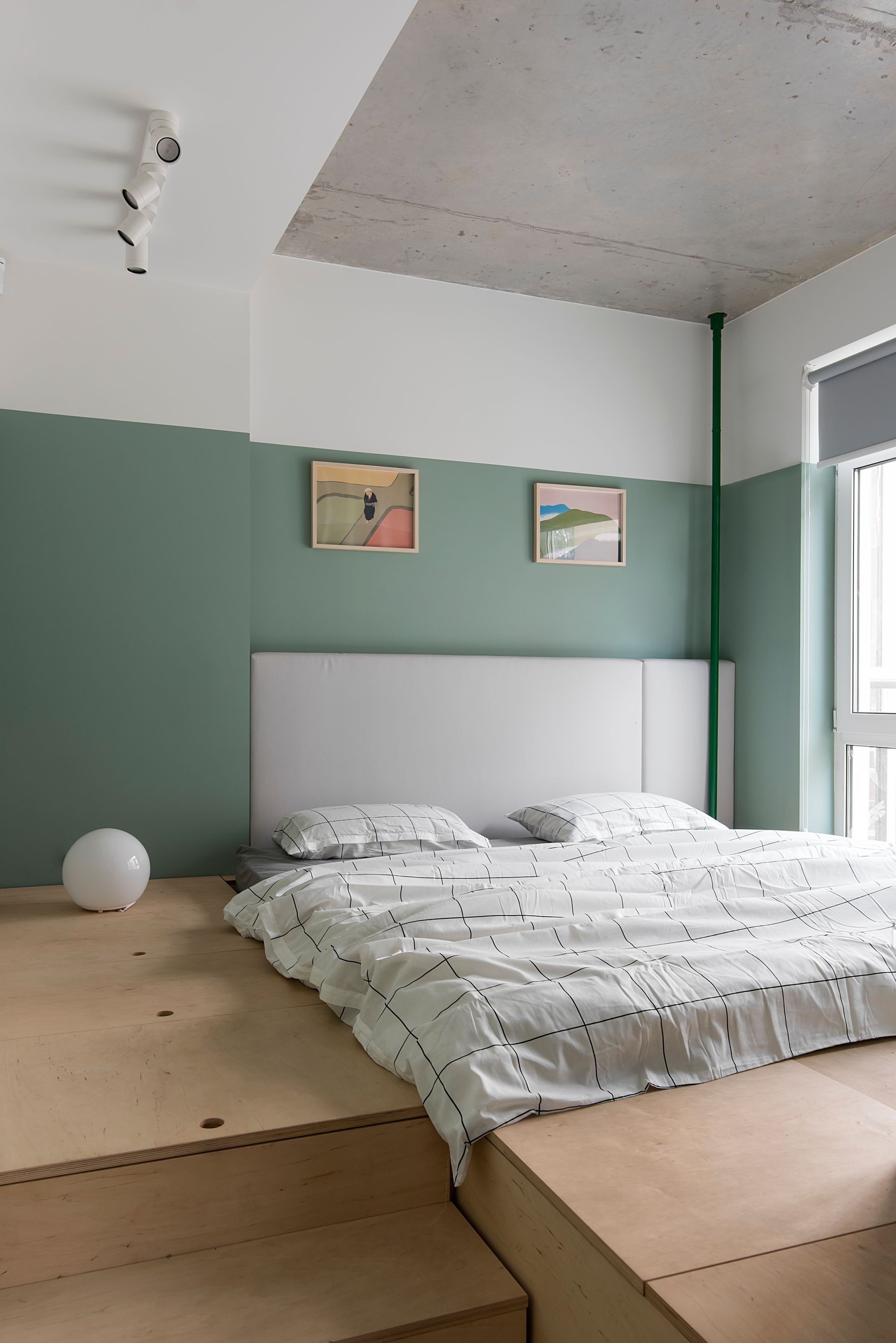 The interior is dominated by natural materials: stone, tiles and a lot of plywood on the floor and in the bedroom. By the way, there is a podium in the bedroom, part of which is reserved for storage, and part for a cat tunnel. Since the apartment is located next to a forest and Victoria and her husband lead an active lifestyle, the layout provides a lot of storage space for sports equipment.