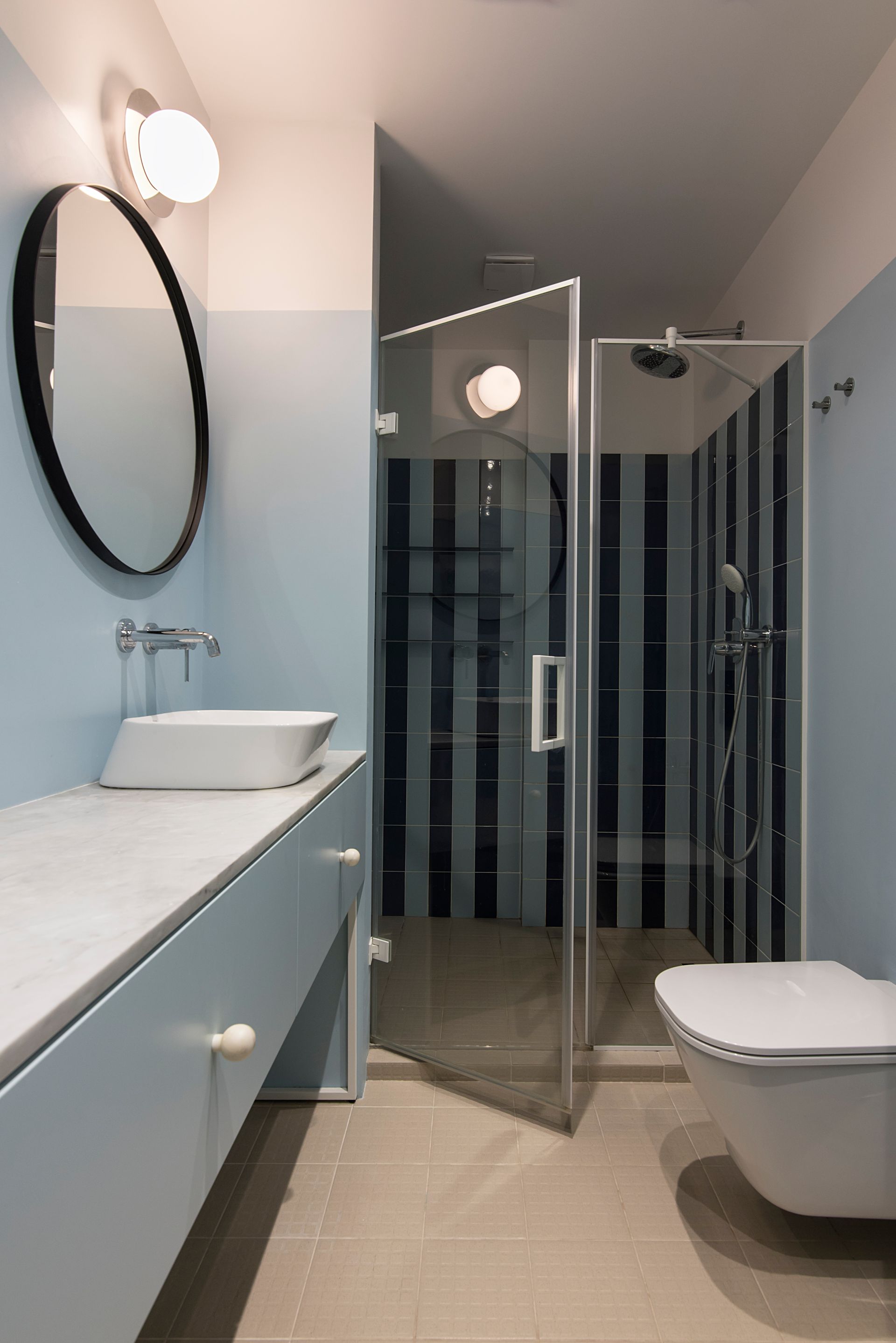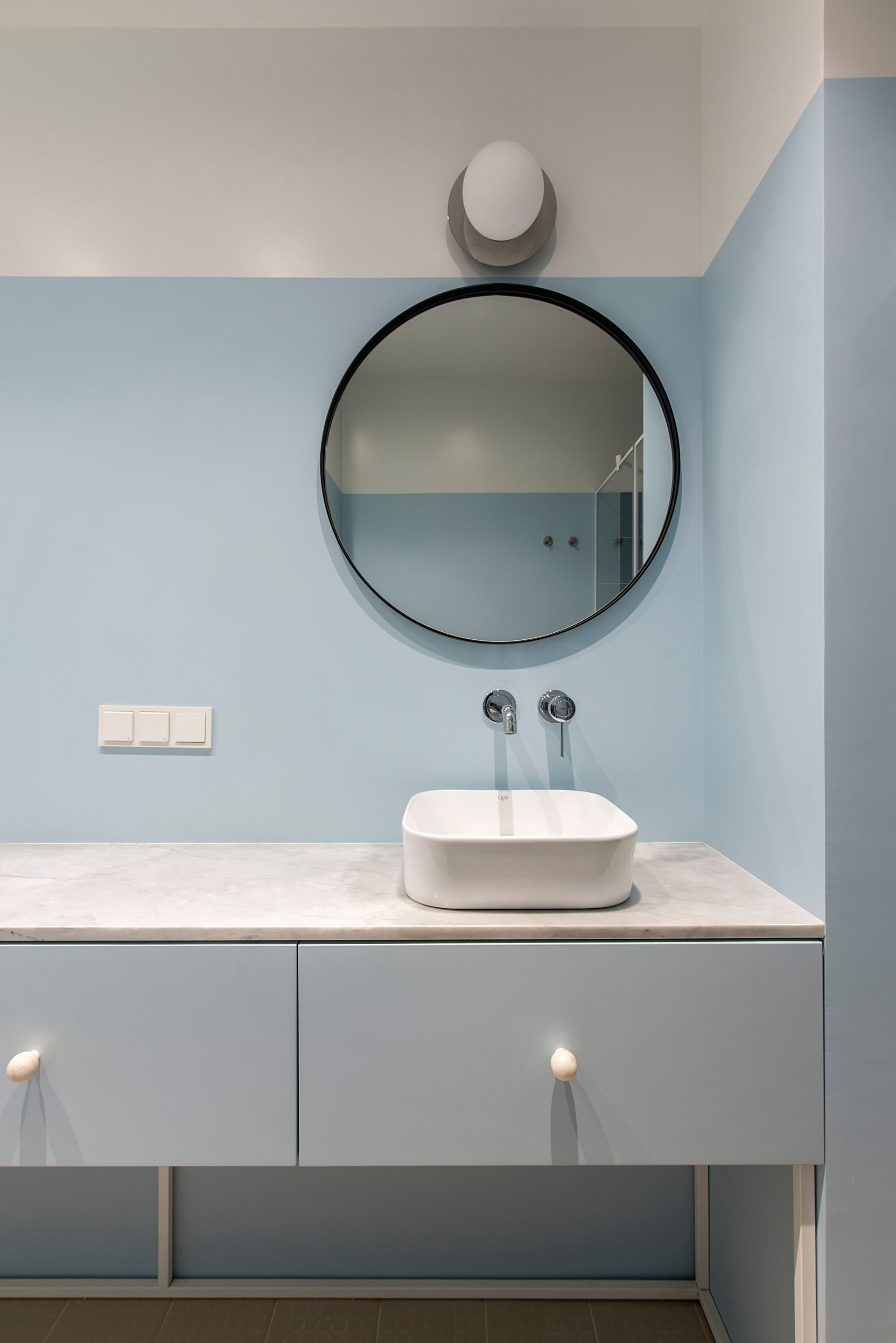 The color scheme of the bathroom is dictated by the choice of Italian Vogue tiles. In addition, Victoria really liked the combination of ultramarine and sky blue shades.