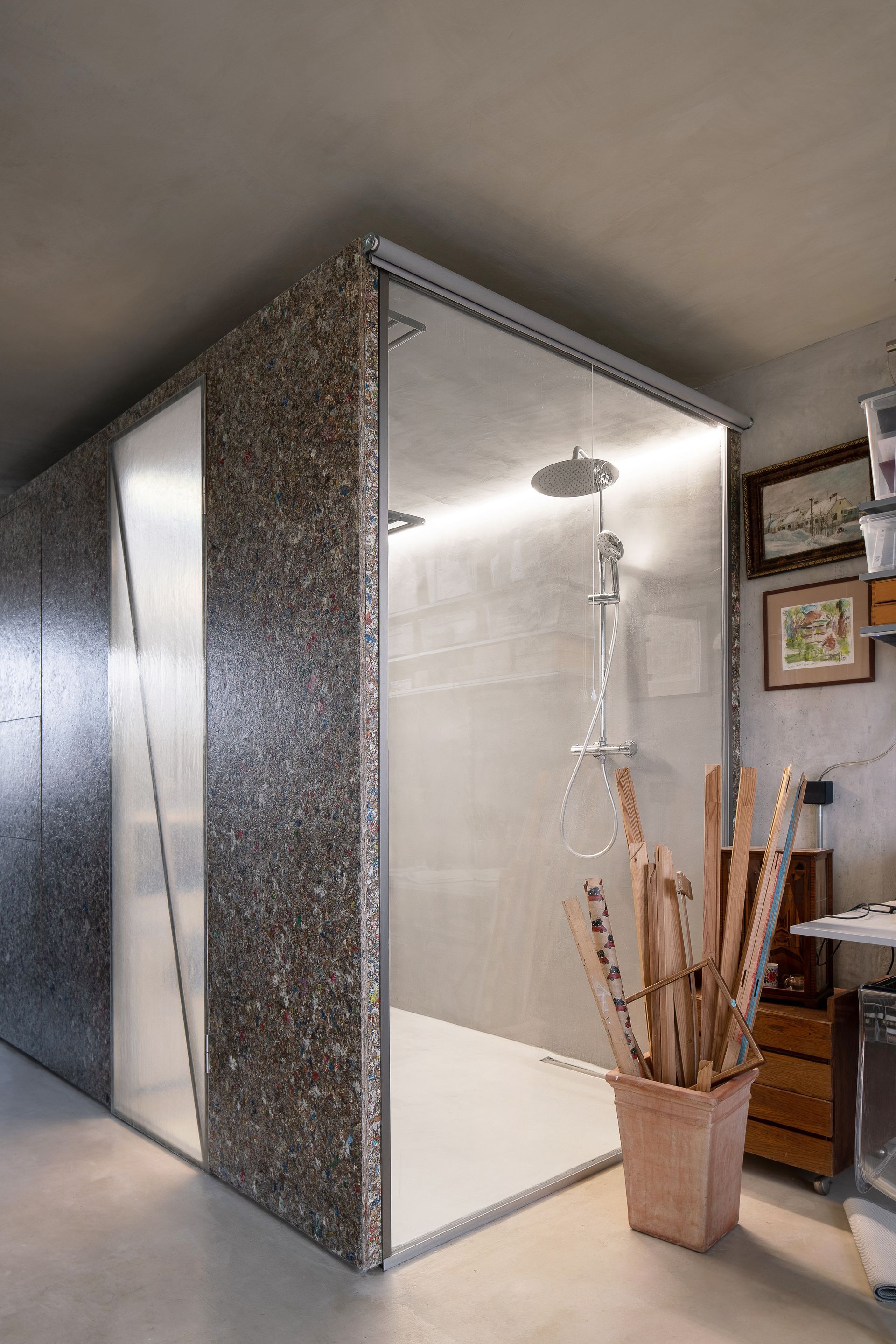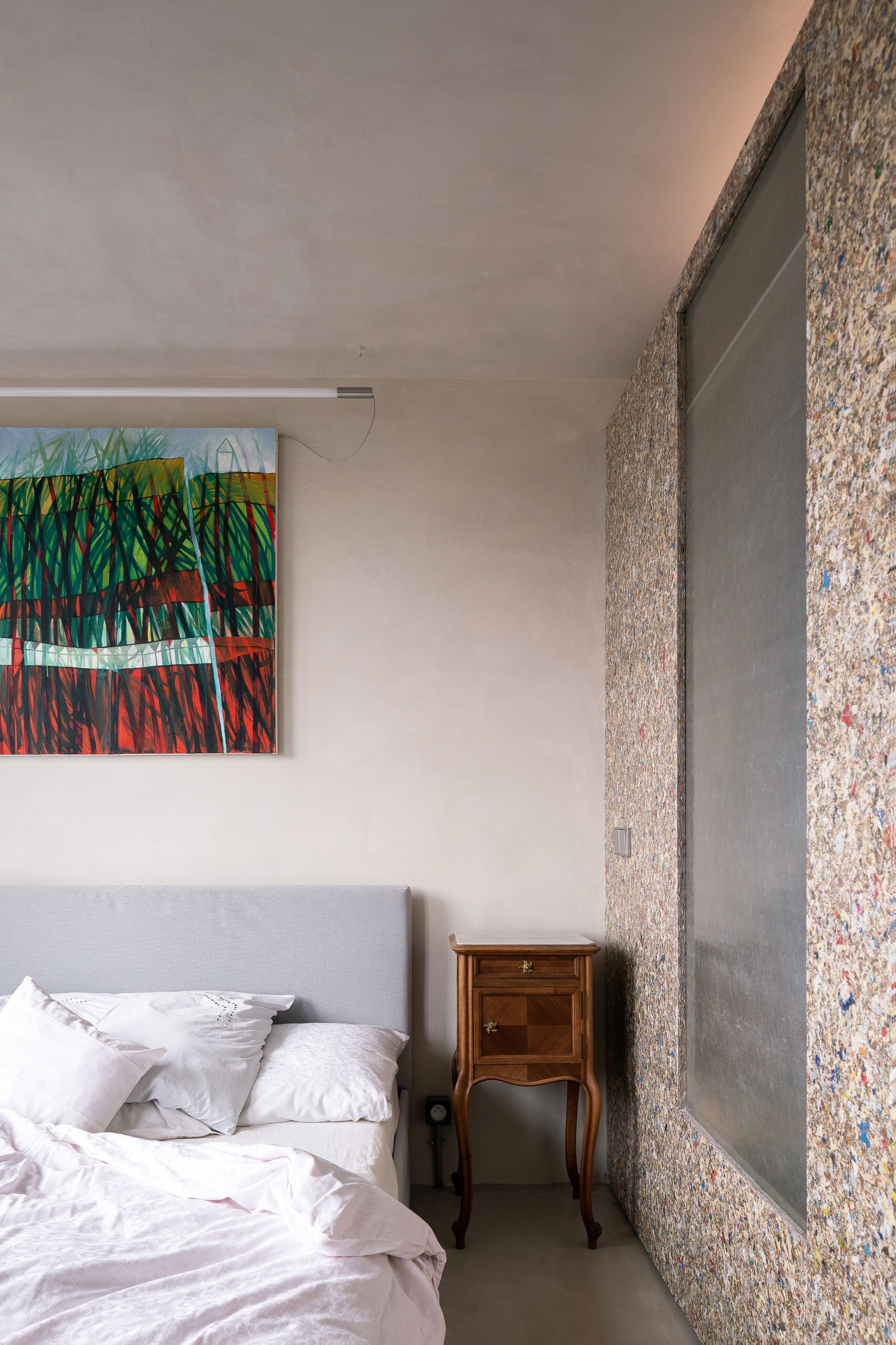 "The guests I have welcomed in my apartment are amazed by the material assembled from boards made from waste material. They perceive the workmanship as a pleasant contrast, enlivening the light grey-toned space."