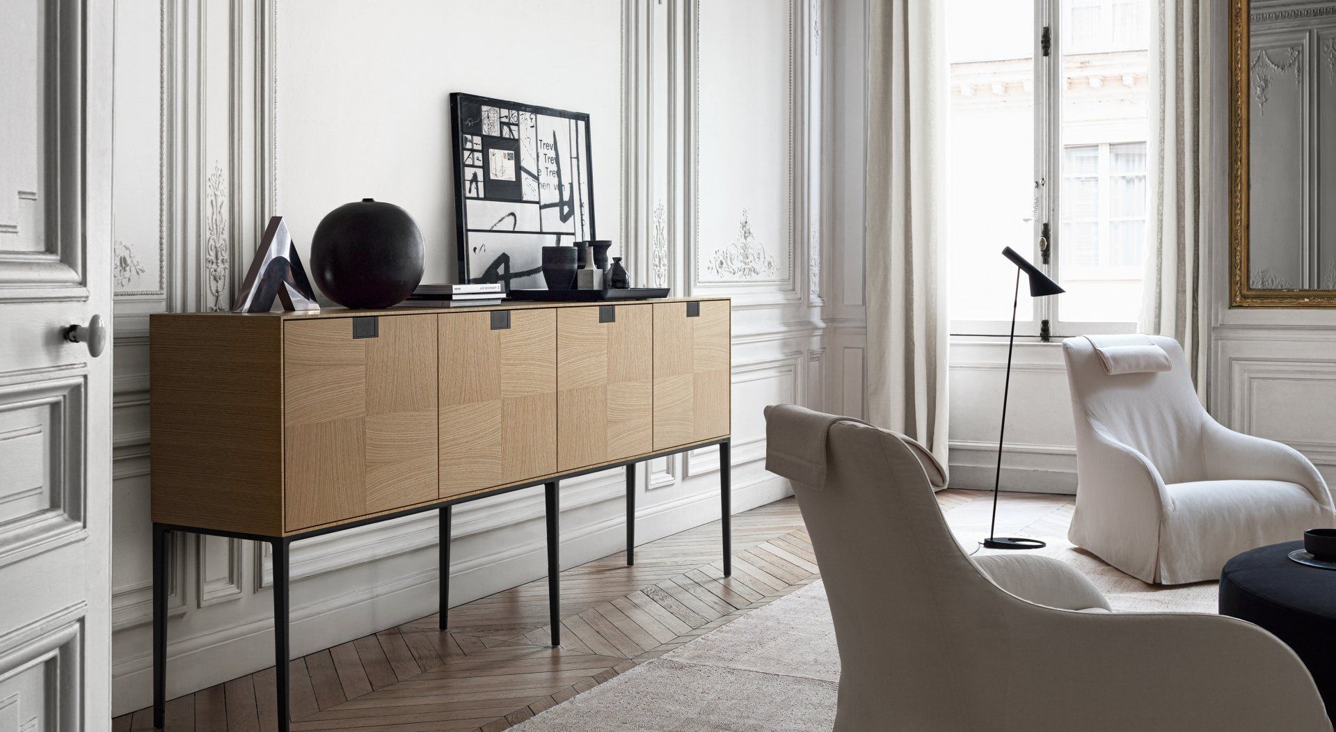 The rooms of the home may return to their traditional functions, but this does not rule out – and even stimulates – the challenge to update other types, forms and details of objects and furnishings, which together create the domestic identity. Having begun precisely with the pursuit of new forms for the creations of cabinetmaking in the great Italian tradition, over the years the production of Maxalto has shaped its identity with the perfection of fine materials: they include the use of wood, in varieties such as Wengè, which Citterio was one of the first to widely explore. Together with modern classic forms inspired by Art Deco elegance, this approach has set many of the furnishings of Maxalto apart over the long term. Nevertheless, even the most successful materials need to be taken towards new possibilities. So for the Alcor series of cabinets and tables, the latest collection reprises the use of Chilean Tineo wood, with a damier motif. There are more metal structures to support the tables and cabinets, in cast aluminium treated with finishes that make it resemble burnished bronze.