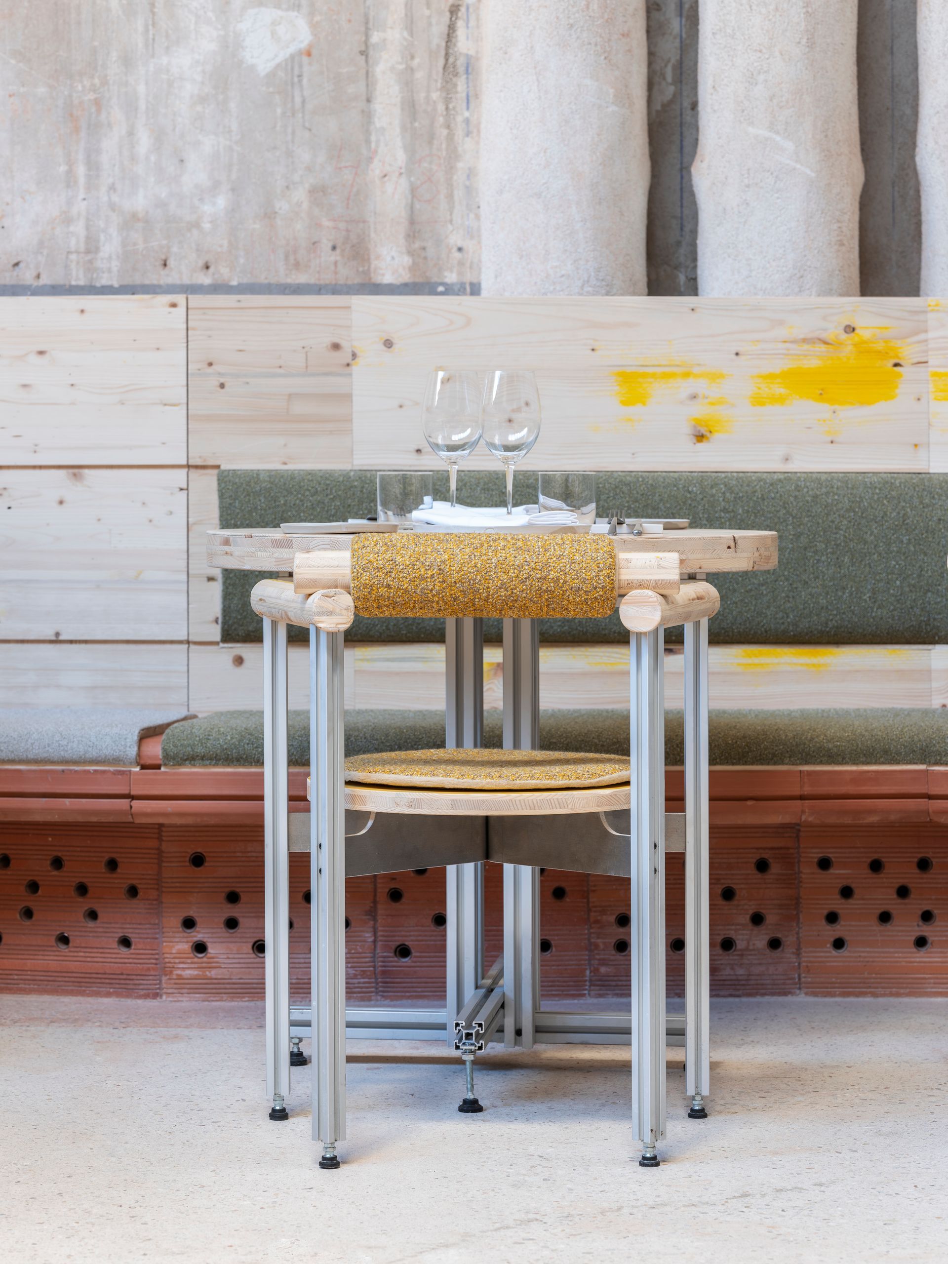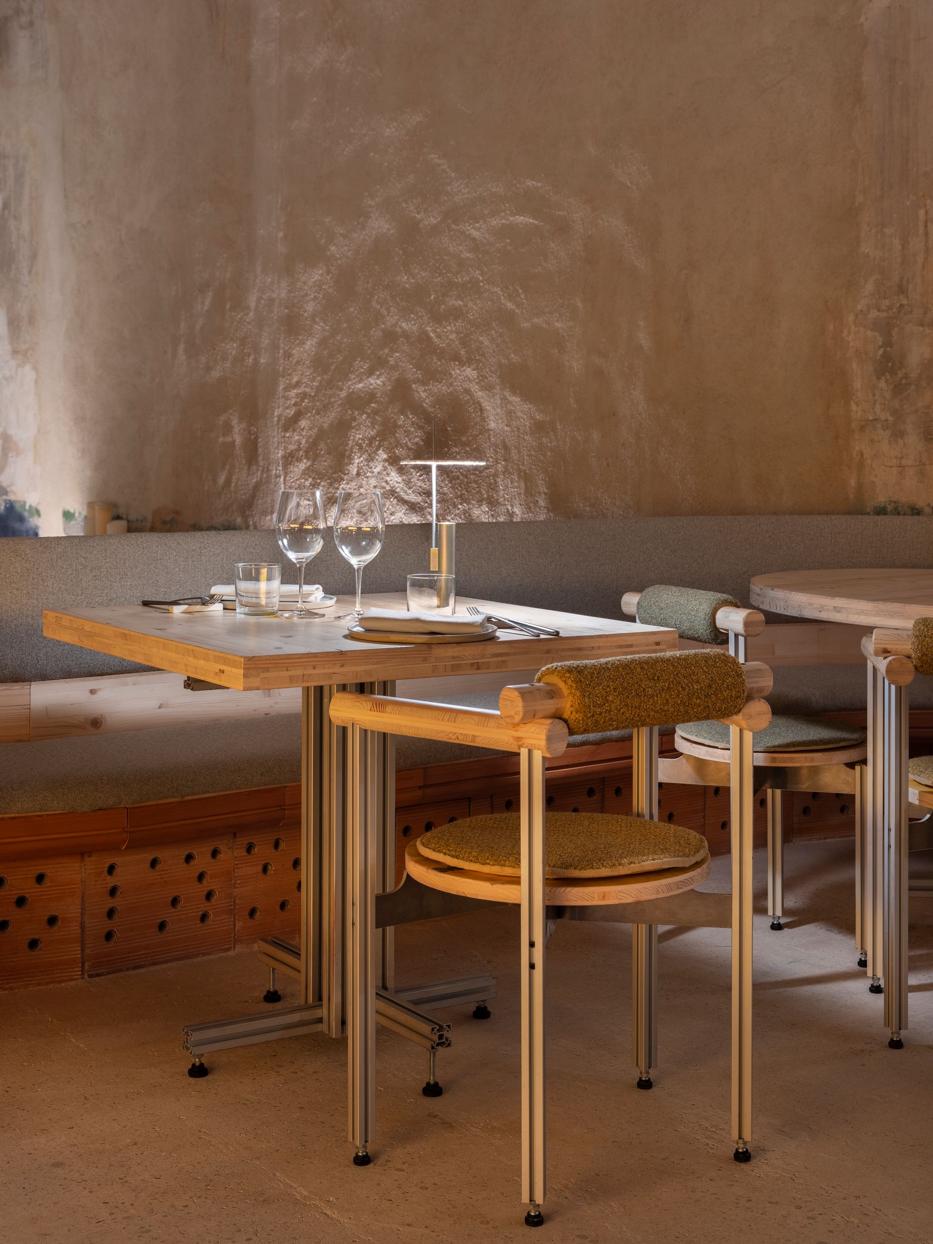 These extrusion-molded ceramic modules, produced by Ceràmiques Est, in La Bisbal (Girona), have a double role: they thermally channel air from outside, and also act as a seat for the diner. These ceramic conduits are also on a wall at the back of the space, like an adiabatic system, creating an unvarnished sculptural terracotta cloud that cools the venue and provides acoustic comfort. Modularity is an eco-design technique that is more efficient and sustainable, providing easy manufacture, repair, and scalability. In addition to the ceramic conduits, it was used with the rest of the furniture in TRAMO (chairs, tables, and lamps), with a system of extruded aluminum parts that can be assembled inside the premises, like a construction set. This material can be recycled infinitely, is very lightweight, releases no toxic emissions throughout its entire life cycle, and is both highly resistant and malleable and can be adapted for people to use it.