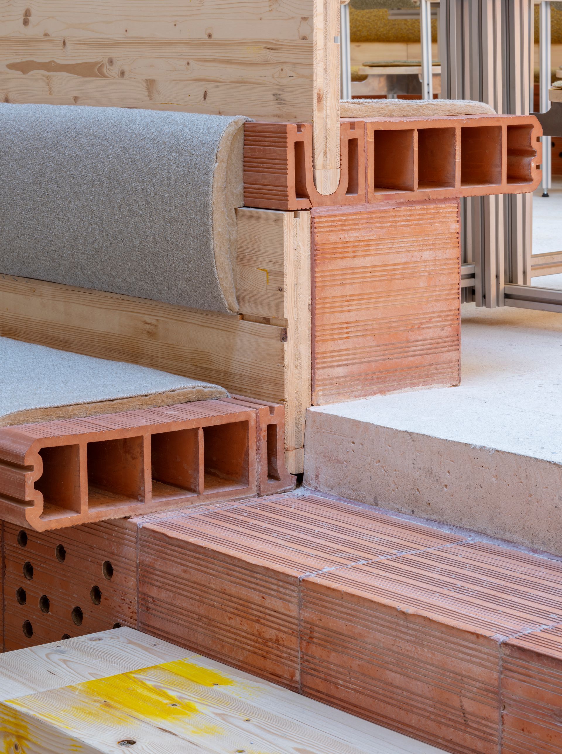 All materials used come from bioconstruction. The design team used lime mortars, cement, sand, exposed ceramic brick, and a blend of cement with anhydrite for the floor, a sort of flooring with excellent thermal transmission. Normally used as the foundation for radiant floors, on this occasion, it was left uncovered to take advantage of its performance. They ruled out environmentally toxic elements such as polyurethane foam, rock wool, acrylic paint and varnish, silicone putty, etc.