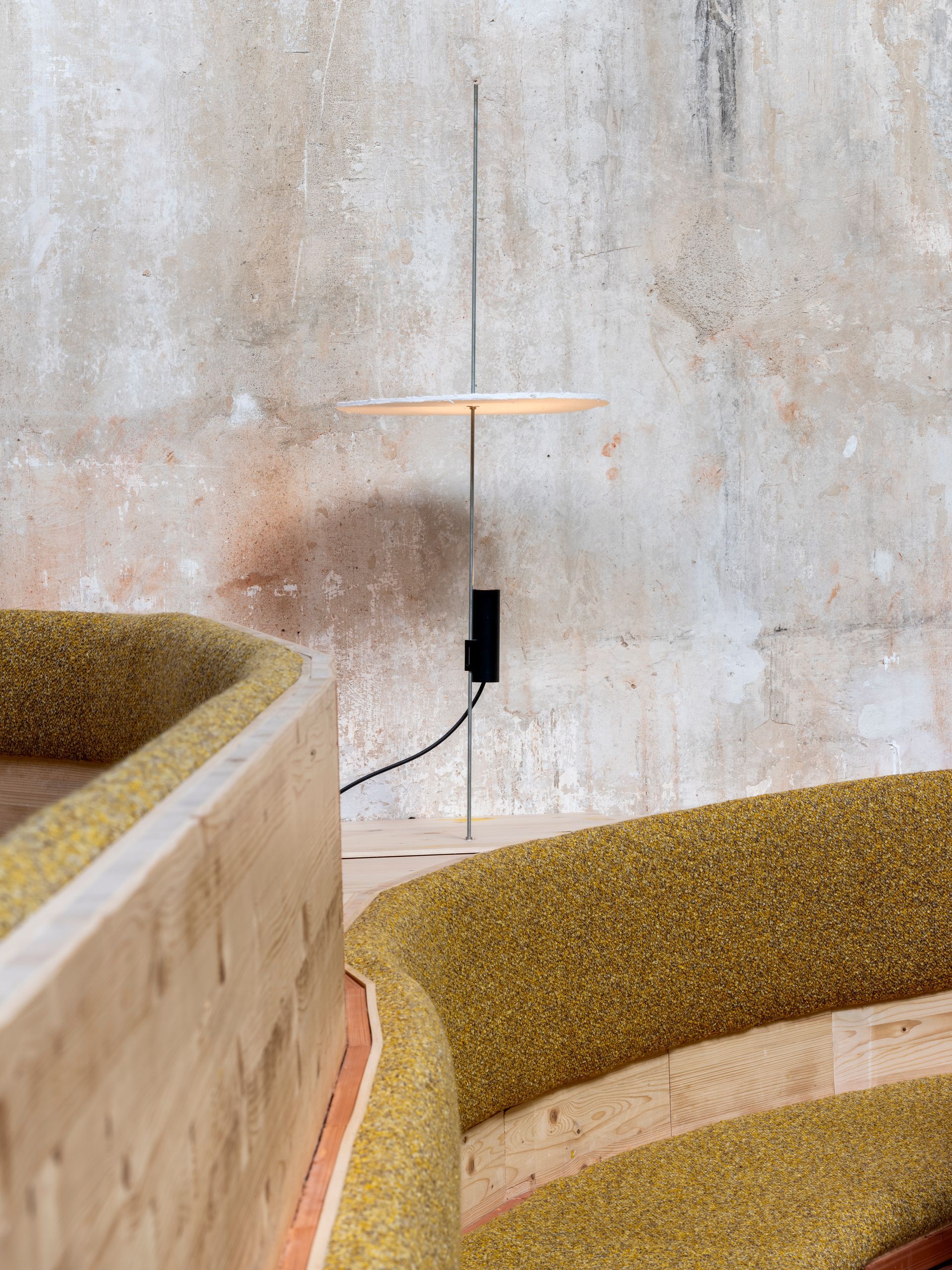 Reclaimed textiles were also used to make the lamps designed by Andreu Carulla that are made with sections of threaded rod reclaimed from construction on the venue, which are normally used in false ceilings. The light emitted by a customized LED module bounces off the surface of a paper disk with an irregular surface, providing a uniformly dim, gentle, and intimate light. The paper disk was made with recycled cotton and by hand by Sastres Paperers, a craftsman paper workshop in Molino de la Farga (Banyoles, Girona). For production, they recycle textiles like tablecloths, rags, and other pure cotton textiles that are shredded and made into fiber suitable for a new craftsman creation process, like paper disks.
