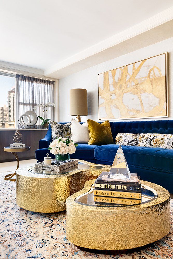 Contrary to the dining room, the living room highlights more pops of colors, such as dark-toned blue in the modern sofa and gold in the unconventional coffee tables by Boca do Lobo. A unique rug with flower motifs also grants a unique touch and rounds up the interior design.