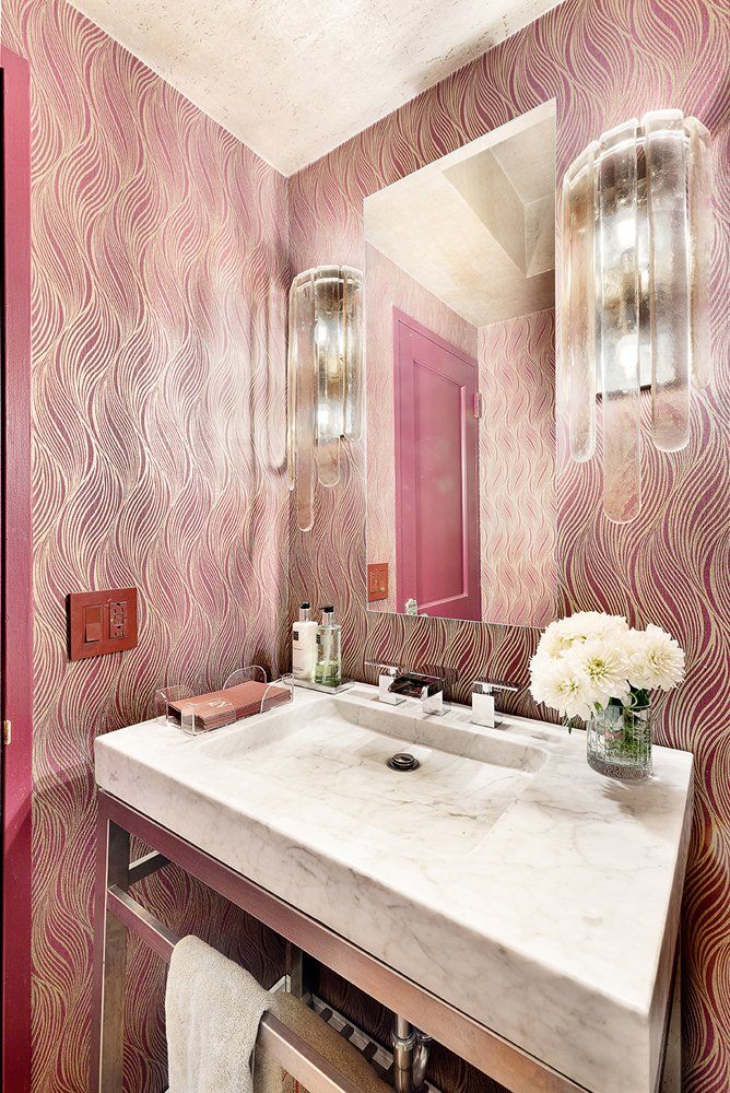 The bathroom is one of the few places that breaks away from the neutral palette, and instead, a vibrant wallpaper in pink and gold tones adds a more feminine touch and modern elegance to the residence.