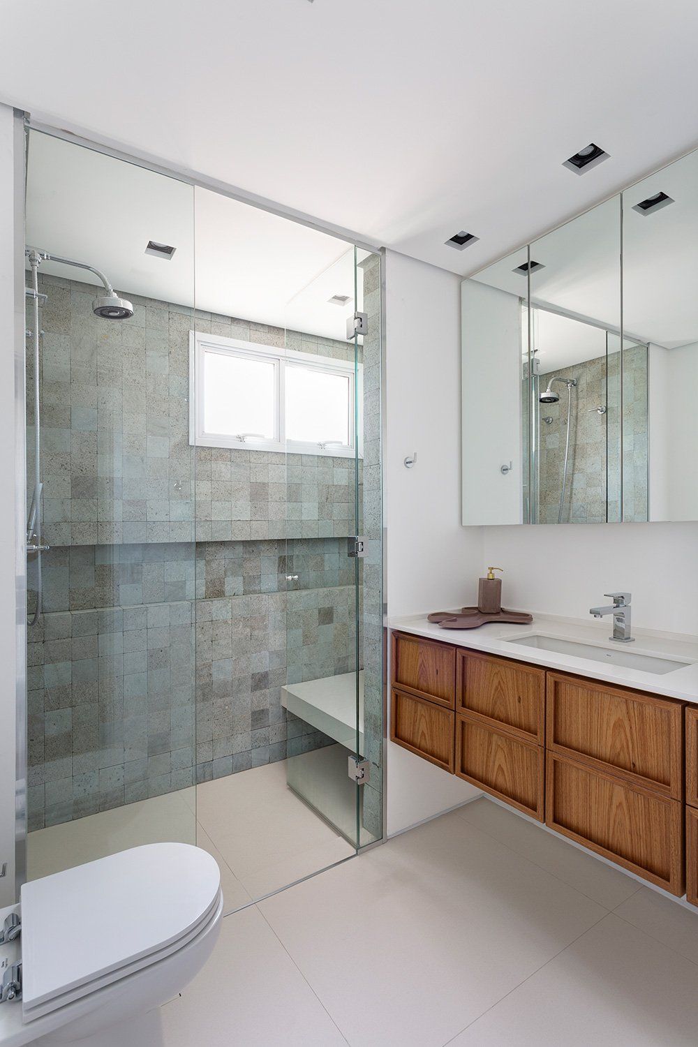 In the master bathroom, natural materials were used to bring texture and freshness, such as hijau volcanic stone on the shower area walls and in the wall to wall niche, and freijó wood in the cabinet.