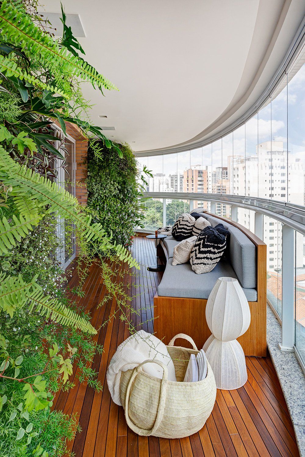 Green walls have been created and have become the protagonists of the terrace. Each one has an independent automated irrigation system. The cumaru wooden deck designs the floor, the landscaping has brought nature closer and the two large curved benches warmly welcome people. Different materials and textures have been explored, such as metal and stone, in the terrace shelves. The main challenge was about the layout of the terrace, which is curved.