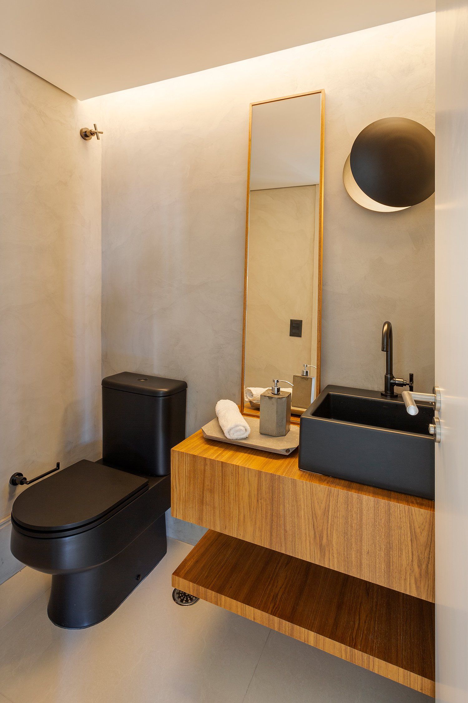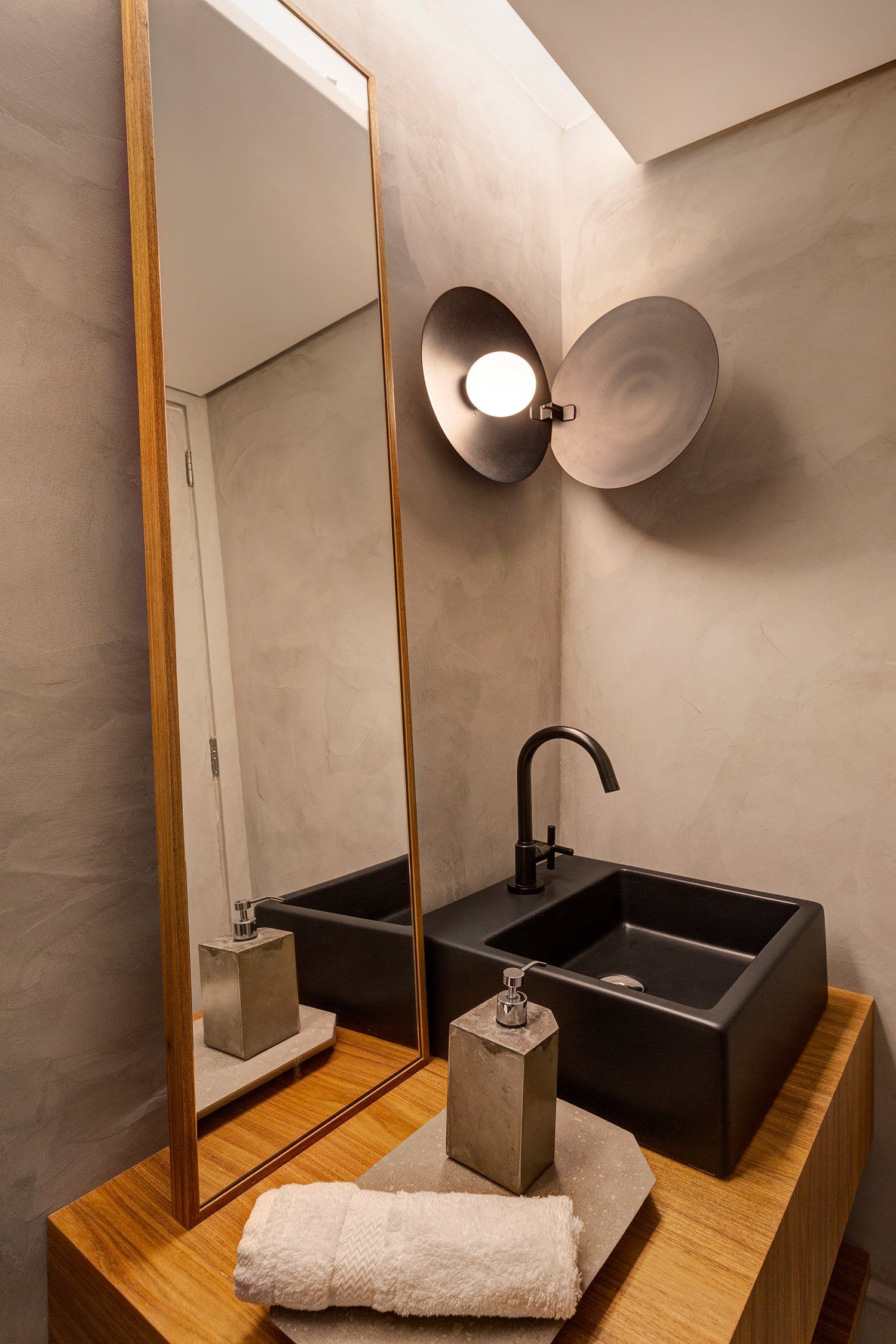The toilet has got more personality with an industrial style, using burned cement on the walls and black fixtures. The highlight is the Ostra wall light by 80e8 Design, made exclusively for Itens store.