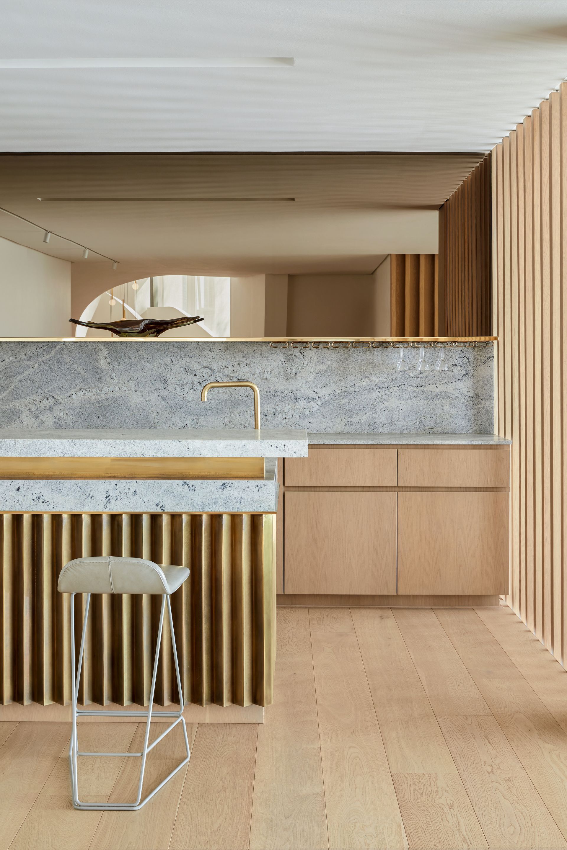 The main kitchen overlooks the back of house pool while the custom-made bespoke bar area is charachterised by Cape Granite, timber, brass, and copper elements.