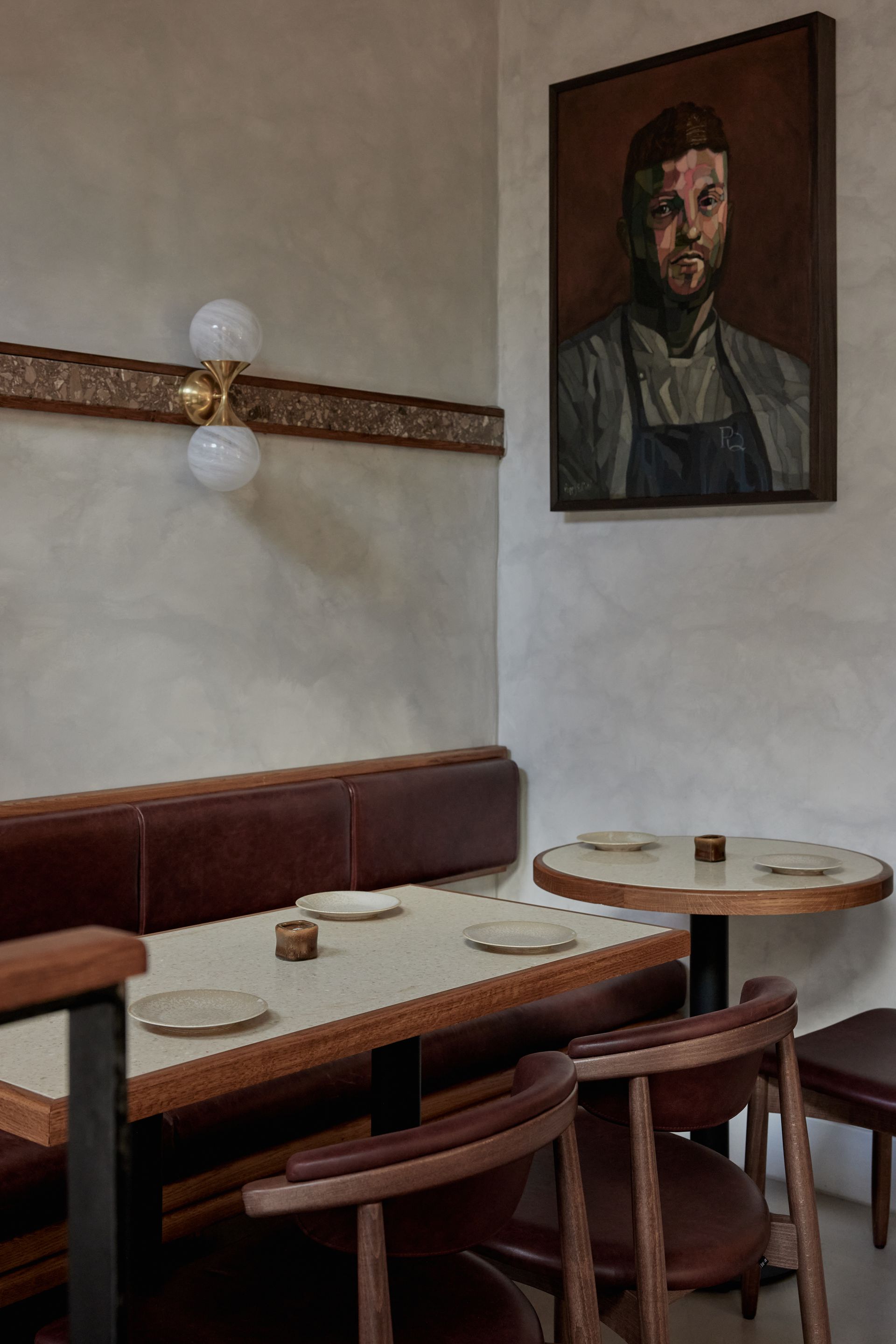 Decoration is minimal and provided by numerous pieces of art curated on behalf of A-nrd Studio by art curator Despina Watton, some of which were commissioned by chef Tom Brown. Prints, original paintings, and ink drawings on a variety of media from artists including Rugman, Fee Greening and Soozy Lipsy sit alongside two portraits by contemporary British artist Poppy Ellis, one depicting Tom and one depicting Tom’s hero Anthony Bourdain.