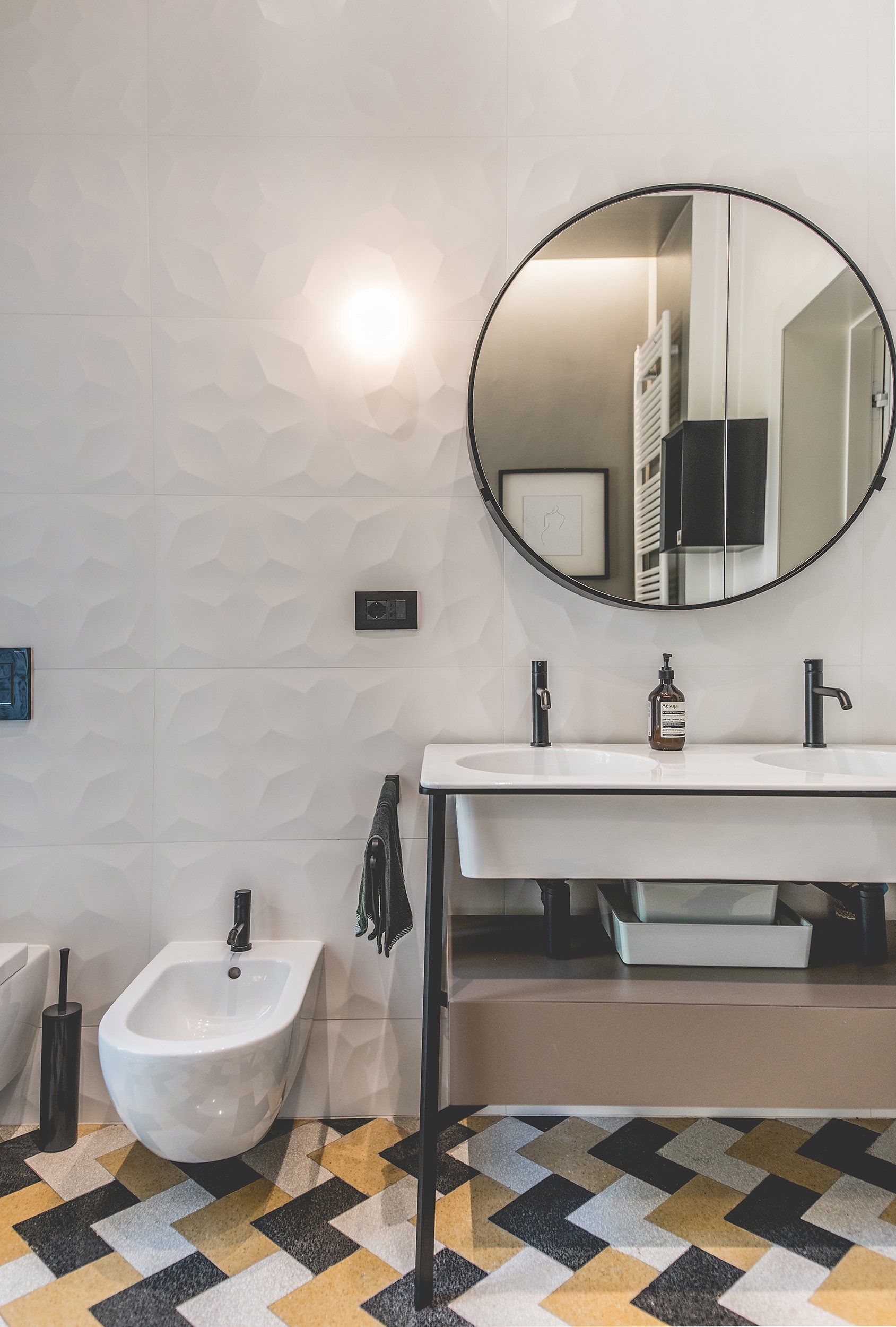 The main bathroom of the house was built keeping the original flooring of the room in which it was obtained. The existing flooring has been carefully dismantled in order to allow the construction of the new systems. Then it was placed and laid again following the original design. Here we find the Catino Doppio sink and the Cielo ceramic round mirror, Ritmonio black hardware and the Eden di Galassia bathtub inserted inside a niche.