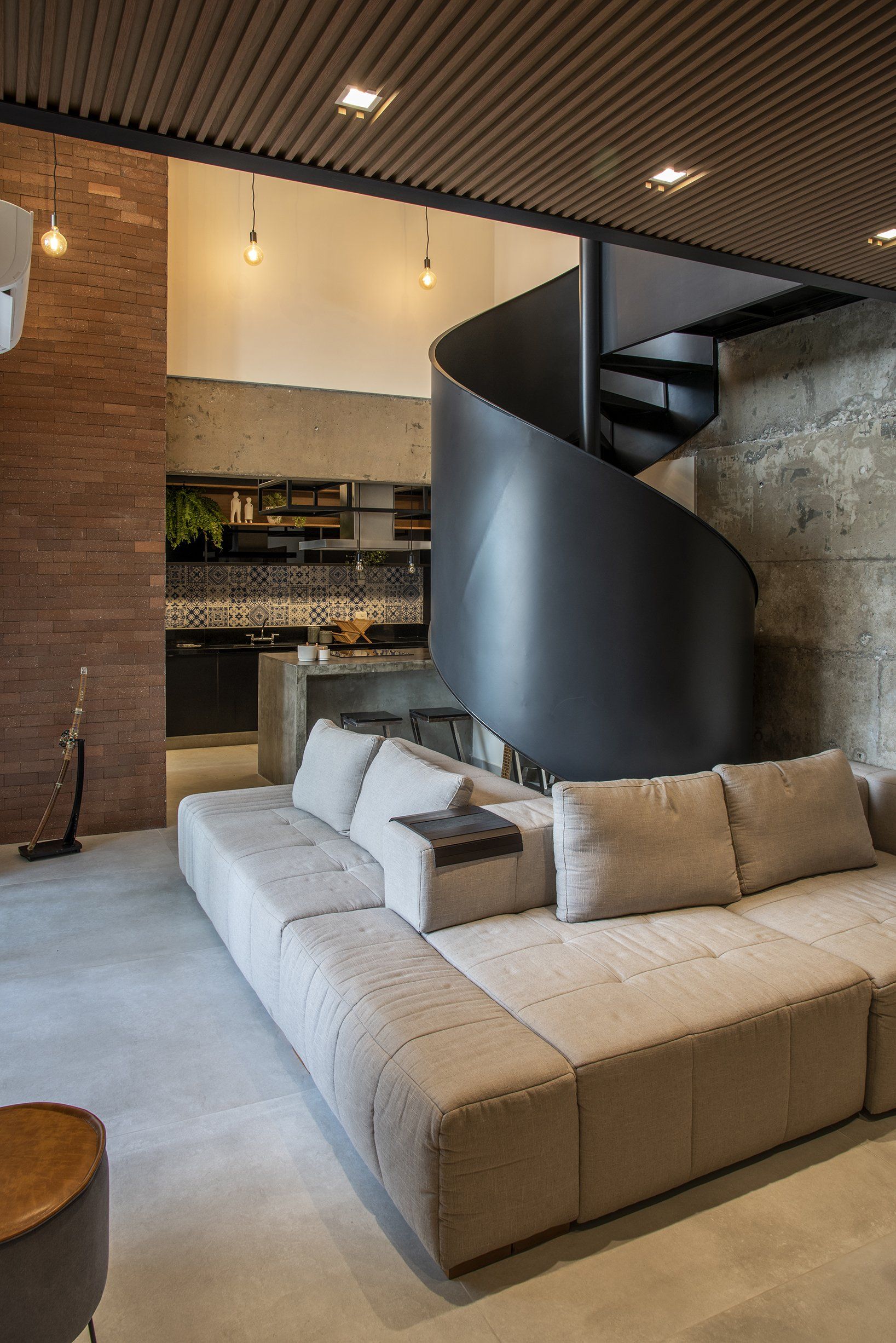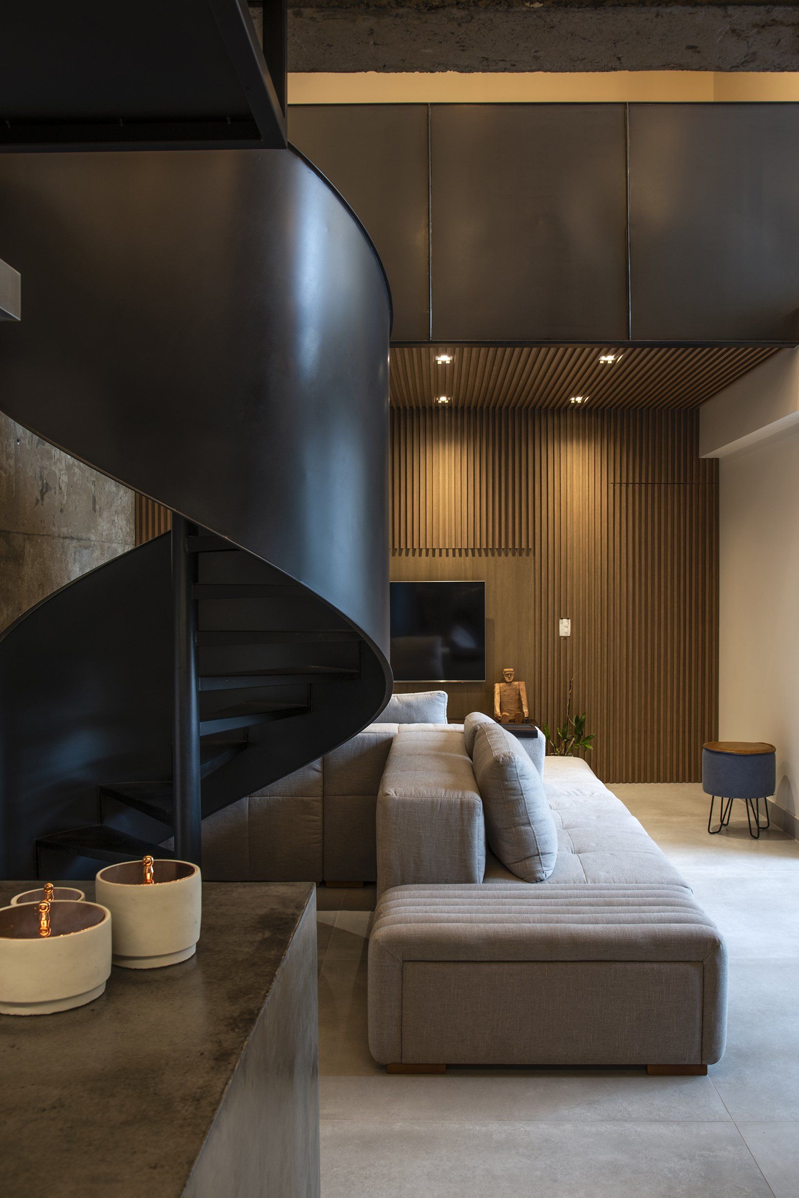 In order to meet the first demand, the structure of the building was first analyzed for the proper structuring of the new environment, then it was defined to be in metallic structure, as it allows assembly on site and is in accordance with the industrial language of the apartment, and finally the possibility of making a spiral staircase, which would serve as a large sculpture in the room. In addition to architecture, the furniture consists of pieces designed by the office itself. The sofa in the living room was designed to meet the space of the room and "embrace" the spiral staircase, serving the TV and living room, as it is connected to the balcony.