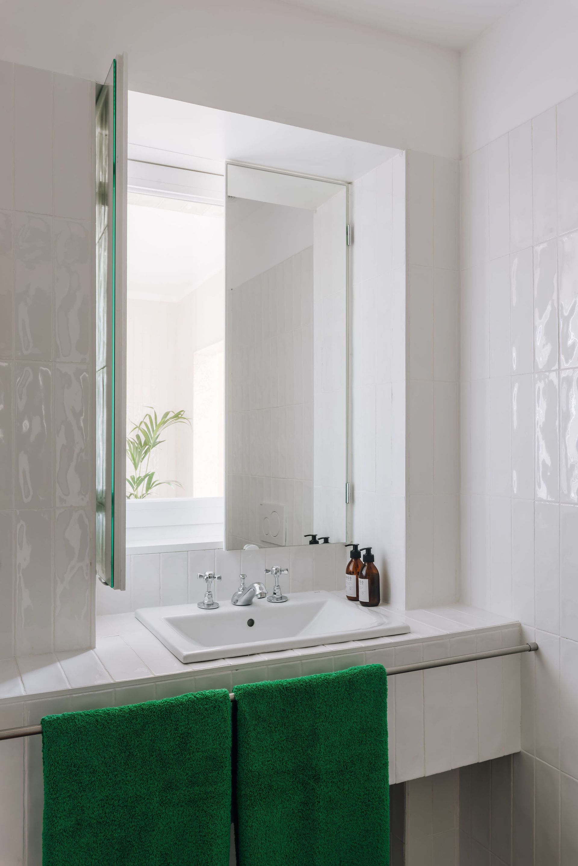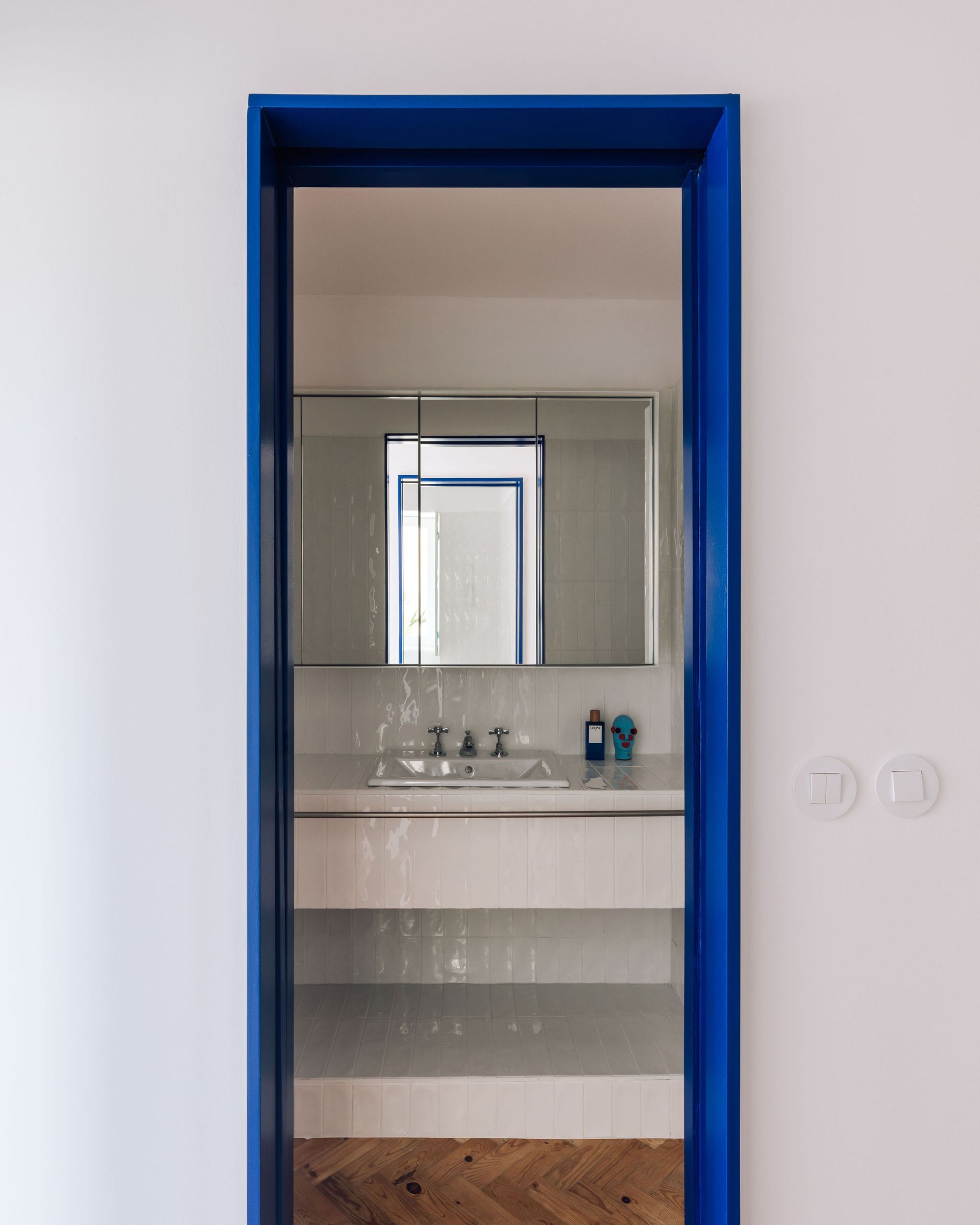 The three existing bedrooms in the private area were preserved. Taking advantage of the enclosed balcony that connects the two bedrooms and one bathroom at the back, a new exterior living area was created. The coloured tiles that fully cover the balcony reflect the natural light while the newly introduced plants bring nature into the space. The same tiles, in white, were also used in the two new bathrooms, extending from the walls to the countertop and shower surfaces, creating visual continuity in the wet areas. In addition, the doors match the striking blue of the arch in the living room, creating greater visual cohesion.