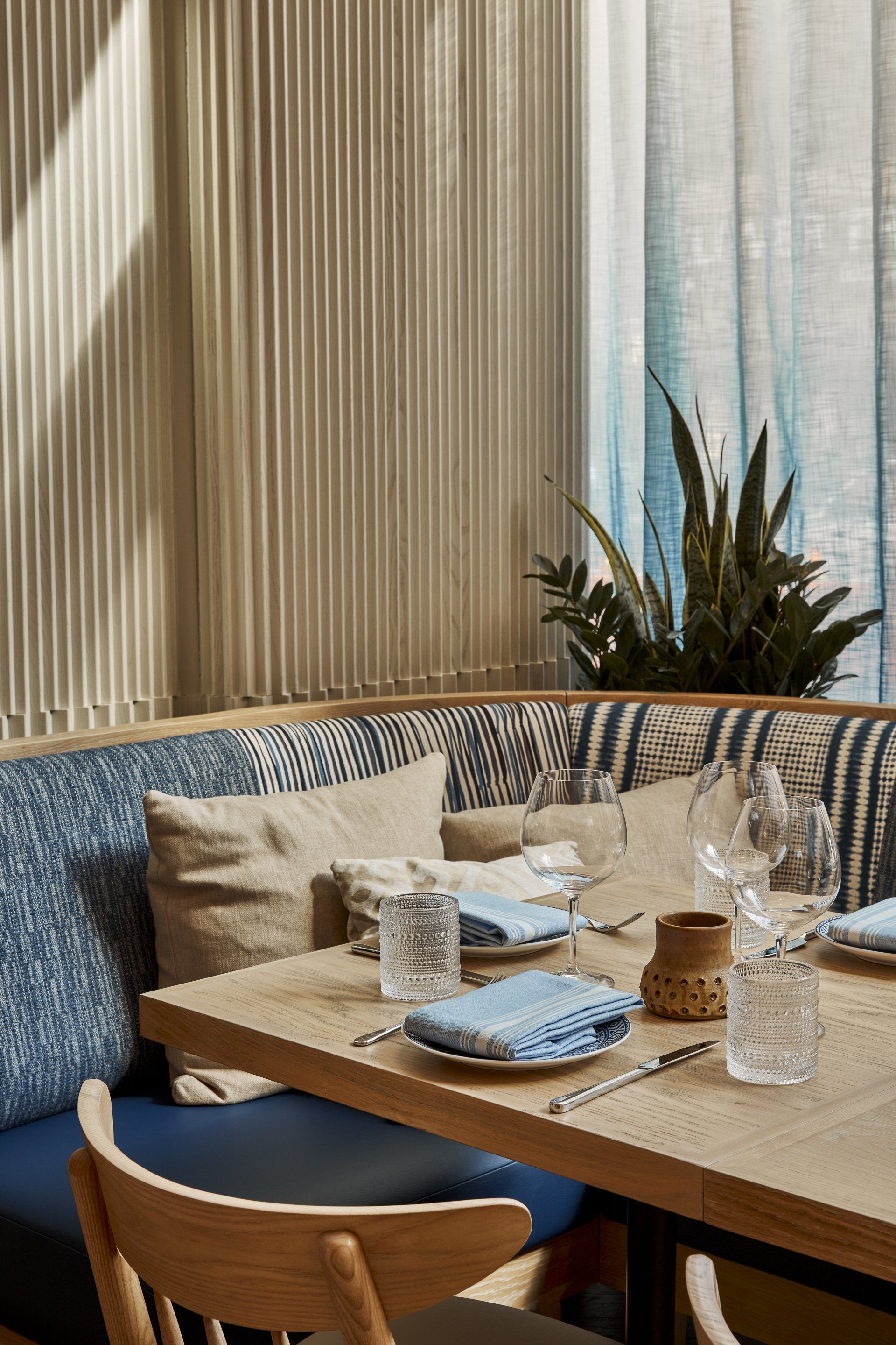 Soft and undulating curves and an assortment of textures playfully transport guests to a modern abstraction of the coast. Alluding to the fluting of columns, walls are treated with tambour details and a custom atmospheric plaster effect. Clusters of woven textile pendants in varying shapes and heights float from the high ceilings, casting a generous warm glow in the main dining room.