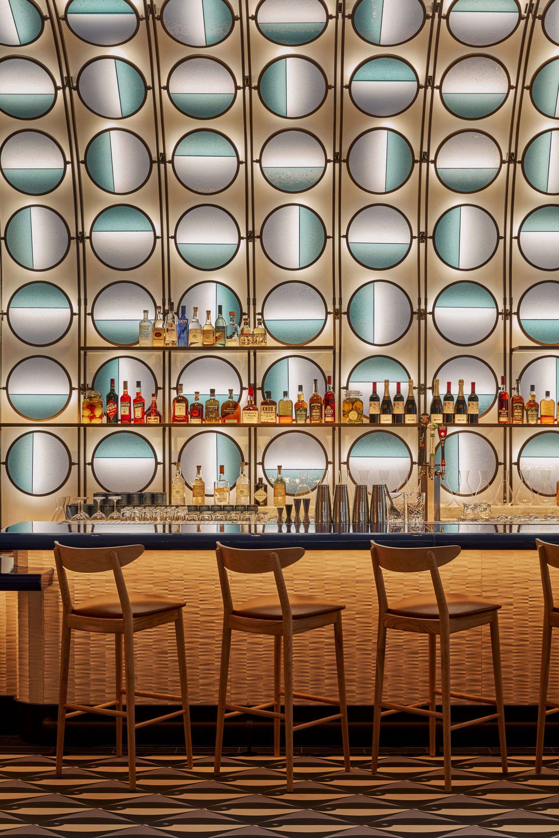 The bar occupies a vast portion of the back wall of the space and has been built with a blue lavastone top and chiselled stone bar die. A custom backlit backbar screen draws the eye and is made of two-toned blue glass discs inspired by the Evil Eye “Mati,” the magical and protective talisman. This eye-catching design curves right up to the high ceiling with impressive sculptural effect. A custom Gio Ponti-inspired tiled floor depicting an abstracted olive and leaf surrounds the bar and provides a visual connectiveness to the Evil Eye patterned backbar screen.