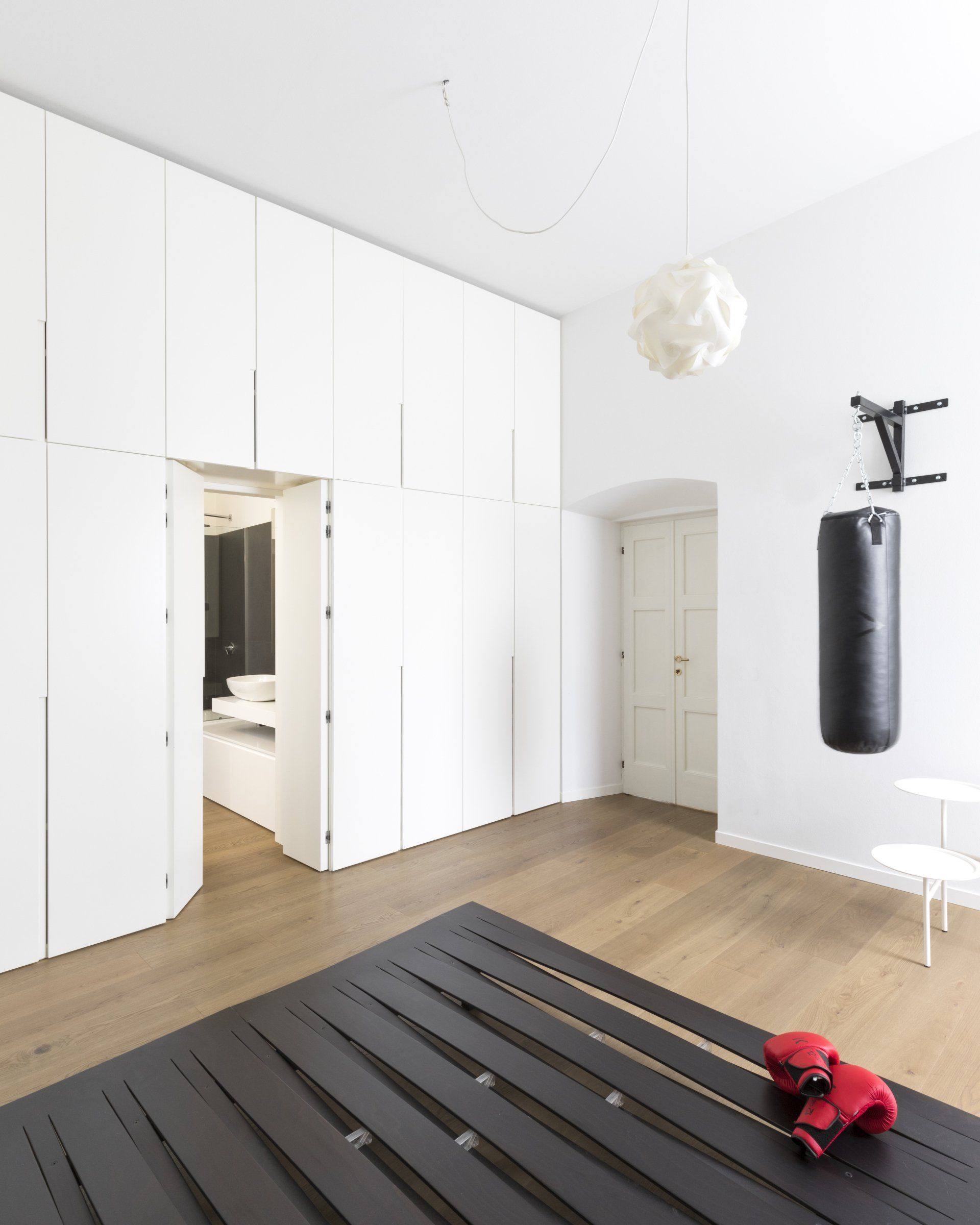 The bedrooms are to the two sides of the main rooms, in a rhythmic sequence created by thick walls and white varnished wood fixtures and fittings. The main bedroom includes a home gym area while the bathroom is in line with the design's minimal and contemporary choices with the use of anthracite ceramic slabs and white ceramic bathroom fixtures.