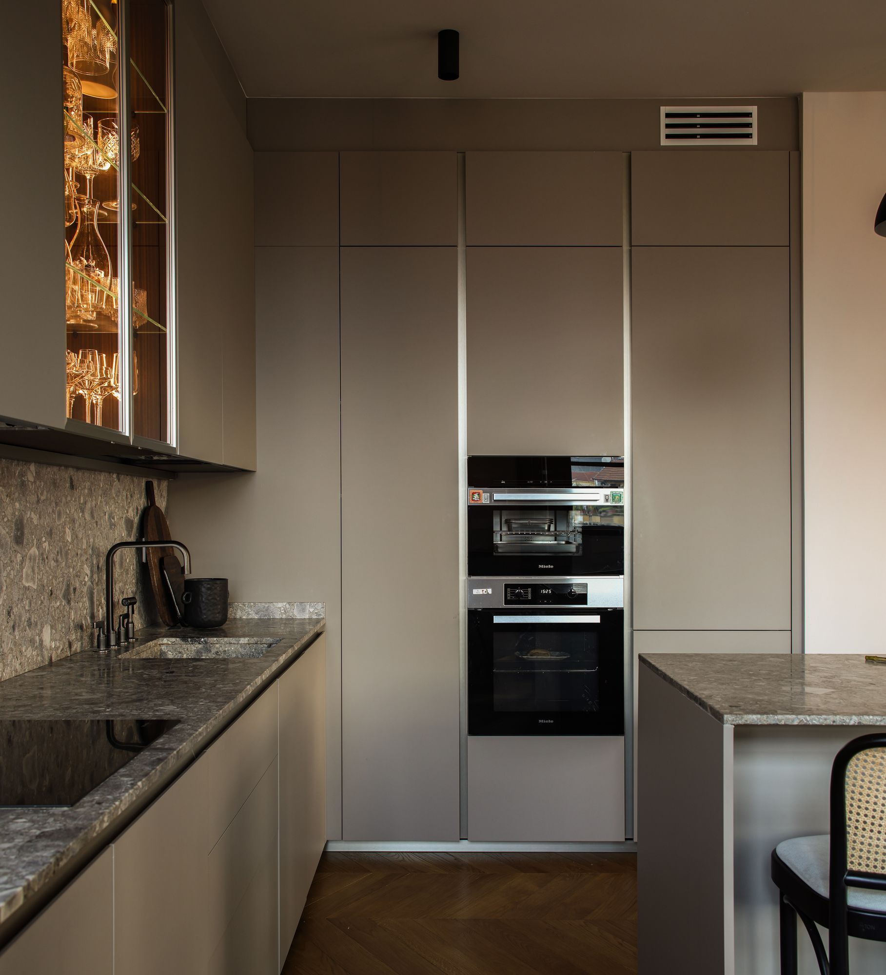 Bordered by a glass structure with custom-made metal profiles, the dining room is an intimate corner in visual continuity with the rest of the room. With glass doors that slide open without cluttering the passageway, it is furnished with a dark-coloured Audo table and comfortable upholstered Verpan chairs with a minimalist design in a light grey fabric, coordinated with the interior. The Tooy chandelier provides dedicated light on the table, while LEDs in the structure create atmospheric lighting. This area is served by a Molteni&C/Dada kitchen with an L-shaped configuration that integrates the hob and sink and optimises the space outside the 'vitrine' to the maximum. A combination of tall, base and wall units in lacquer and glass integrates Miele appliances while also offering plenty of storage space. The linearity of the kitchen top in Ceppo di Grè stone becomes, at the window, a comfortable wooden shelf, made to measure by Tisettanta, which serves as a small desk for work from home. The kitchen area is illuminated by spotlights and LED under-cabinet lights, the home office area by the Atollo table lamp by O'Luce, the island by Gubi pendant lamps that create a visually unique grouping with the kitchen. The scenic monolithic volume of the island with a Ceppo di Grè top is surrounded by TON's 811 stools whose Vienna straw inserts add a touch of warmth.