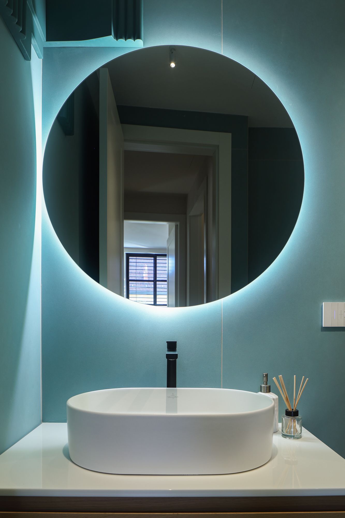 The two bathrooms in the house remained in their original location and were customised with fibreglass and 3D ceramic elements. The studio also custom-designed the furnishings in the laundry room. The shades in the main bathroom are dark. The combination of materials creates surfaces with a change of emphasis: plain stoneware with a plaster and marble effect, 3D ceramics, taps in a gun metal finish, light wood. The children's bathroom, on the other hand, introduces a lot of colour. Stoneware is combined with fibreglass and 3D ceramic elements, making this bathroom very distinctive.
