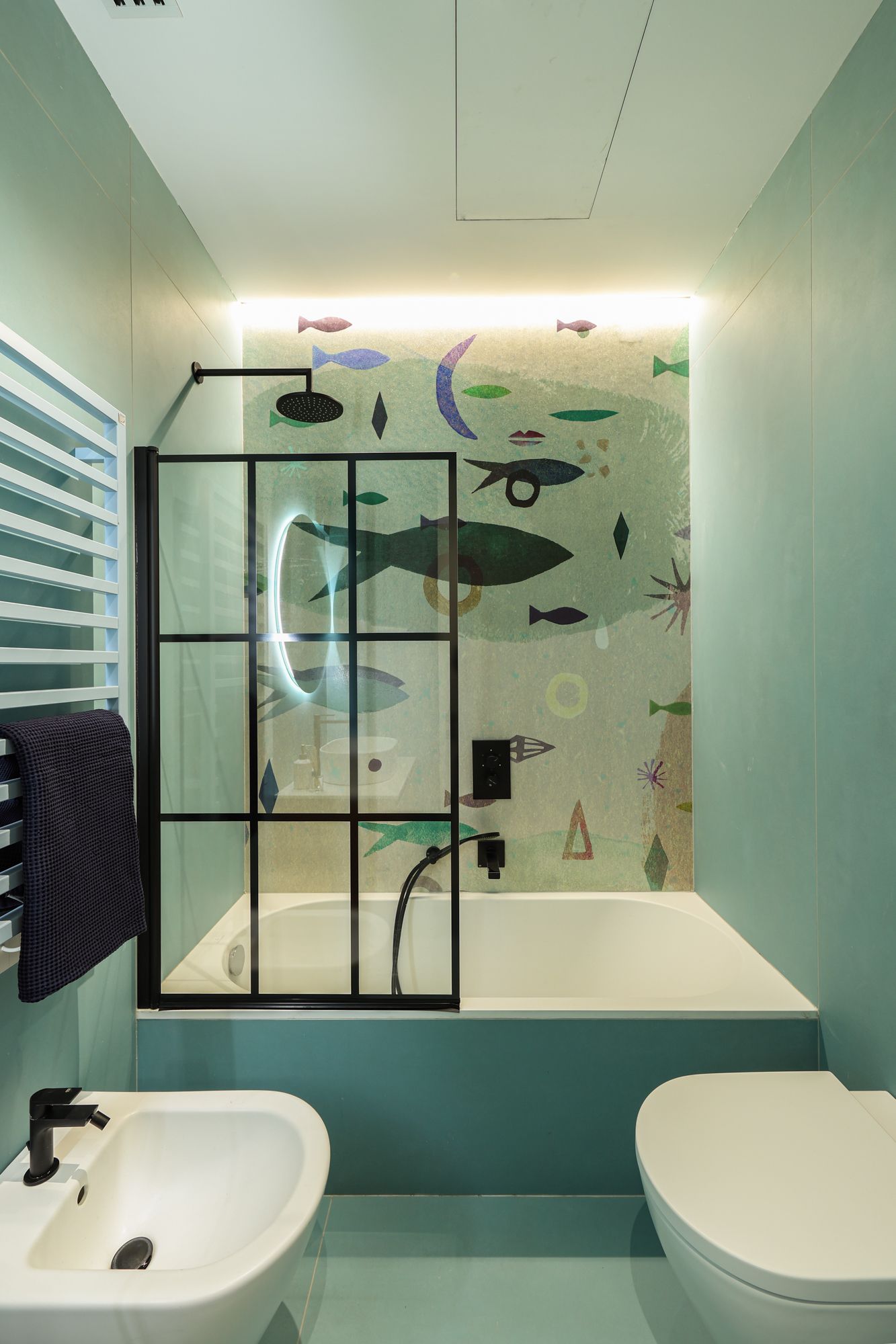 The 126 m² apartment is situated on the top floor of the building and is well light thanks to the large industrial-style windows that run along the two main fronts. Archventil worked on the layout, finishes, lighting and furnishings, mixing classic materials, contemporary furniture and iconic design pieces, including some vintage, all stitched together by a light colour base in the living area and children's rooms, dark in the master bedroom. Colour becomes the protagonist, however, in the details, especially in the children's bathroom.