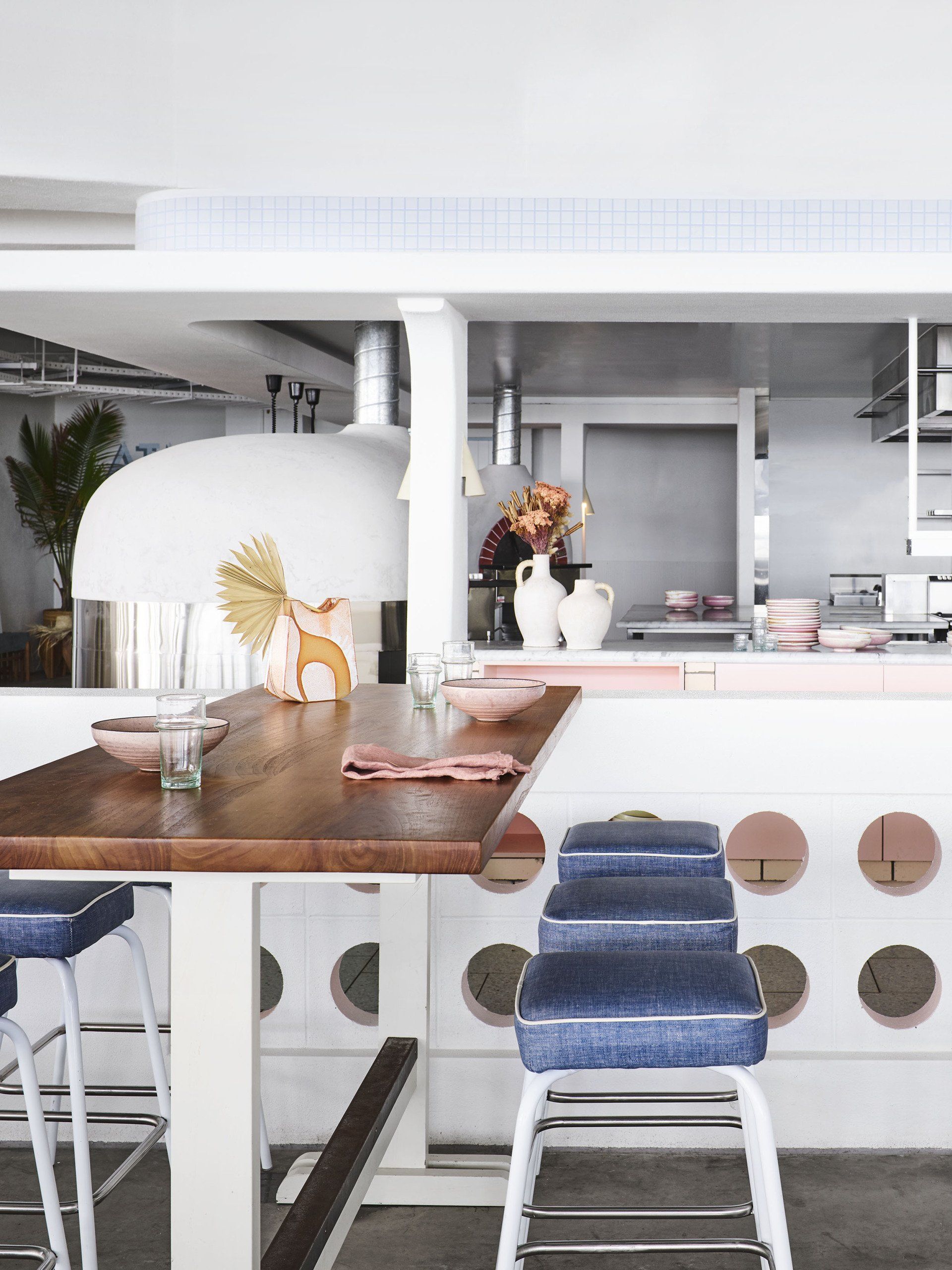 Inside, a large central open kitchen with two pizza ovens and a fire pit, pushes patrons toward an ever-reaching view where various furnishings encourage them to eat, stand and drink. It is hive of gastronomic energy built within a curving masonry arbor, a nod to past pavilion structures once dotted up and down the coast.