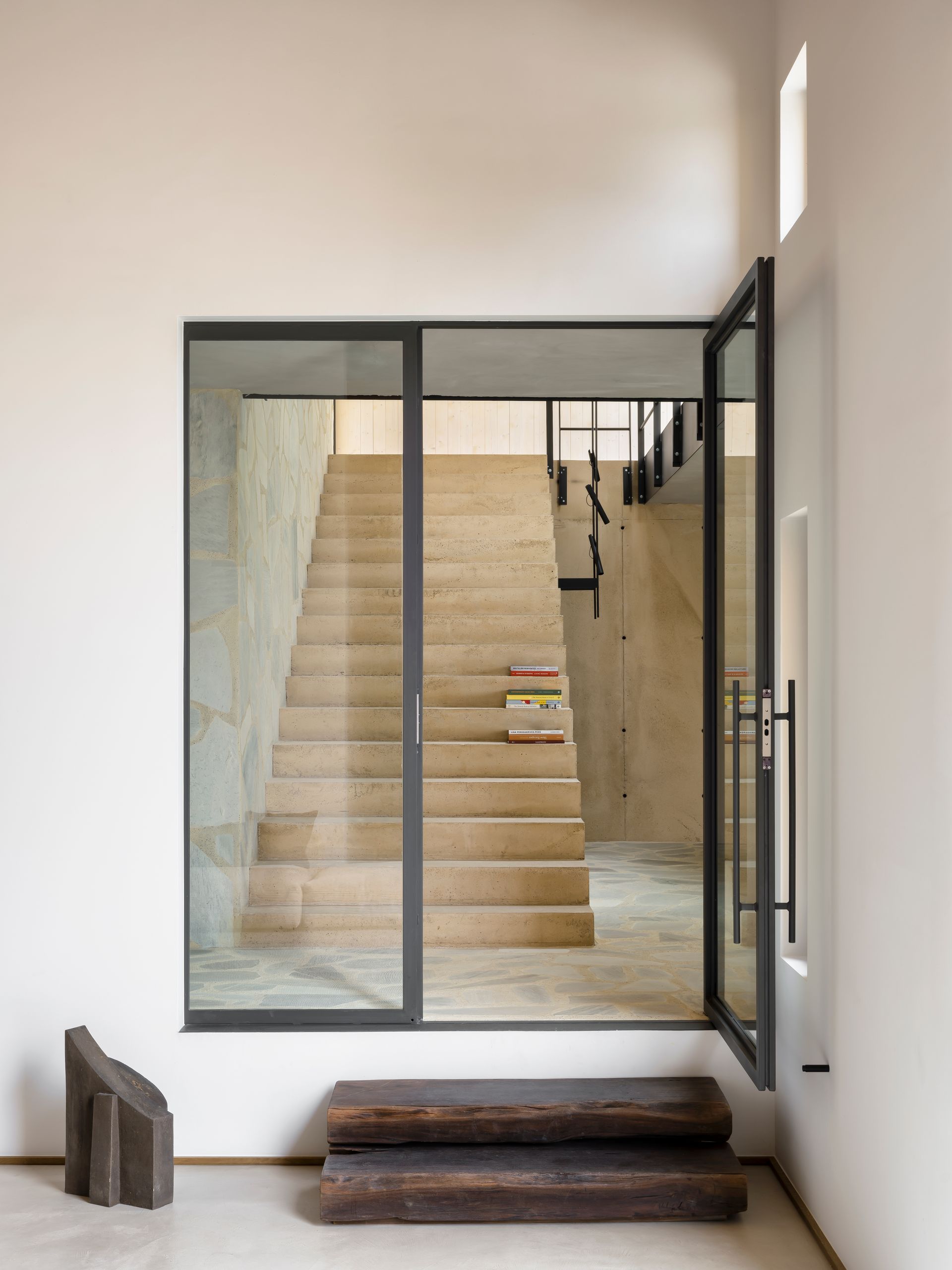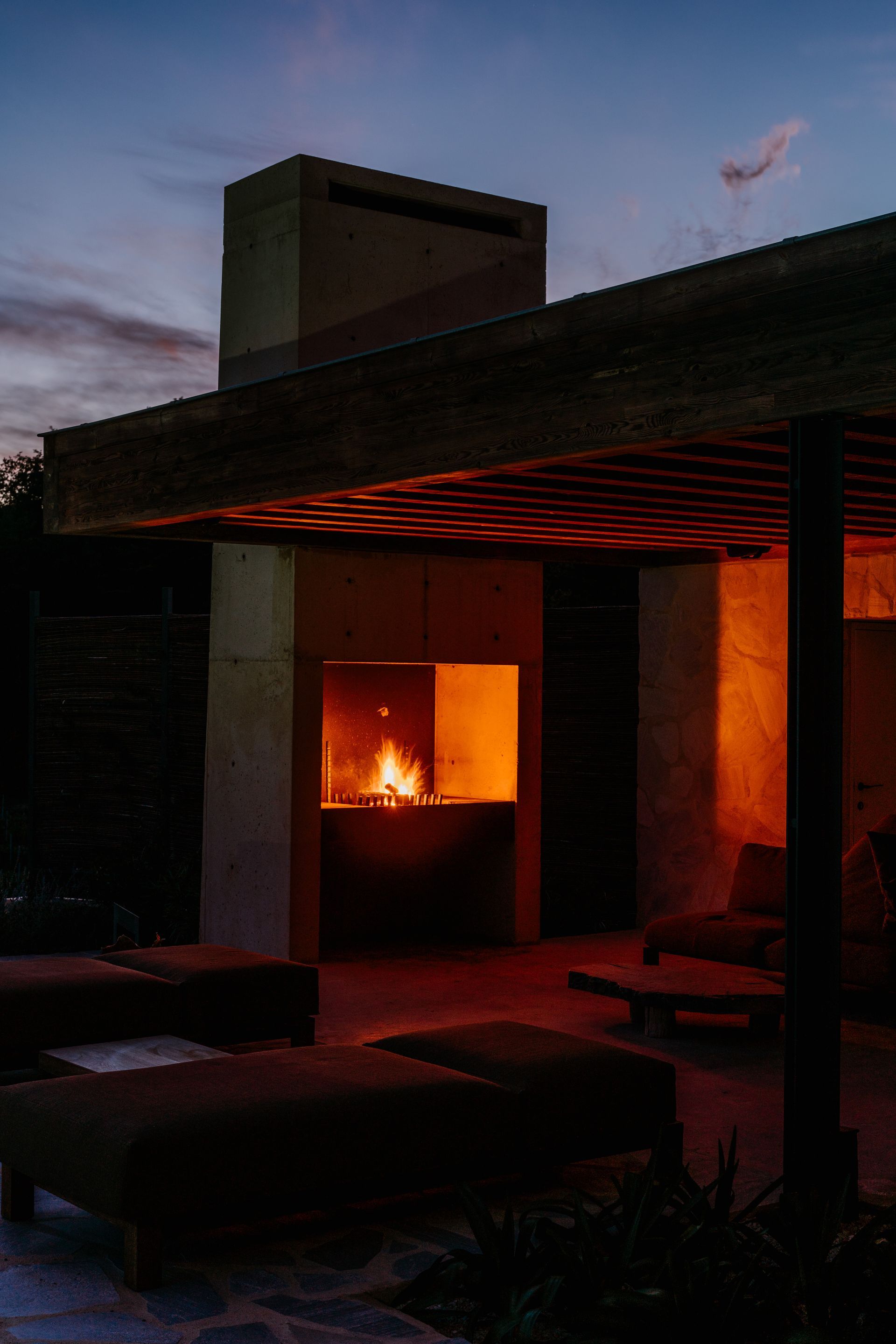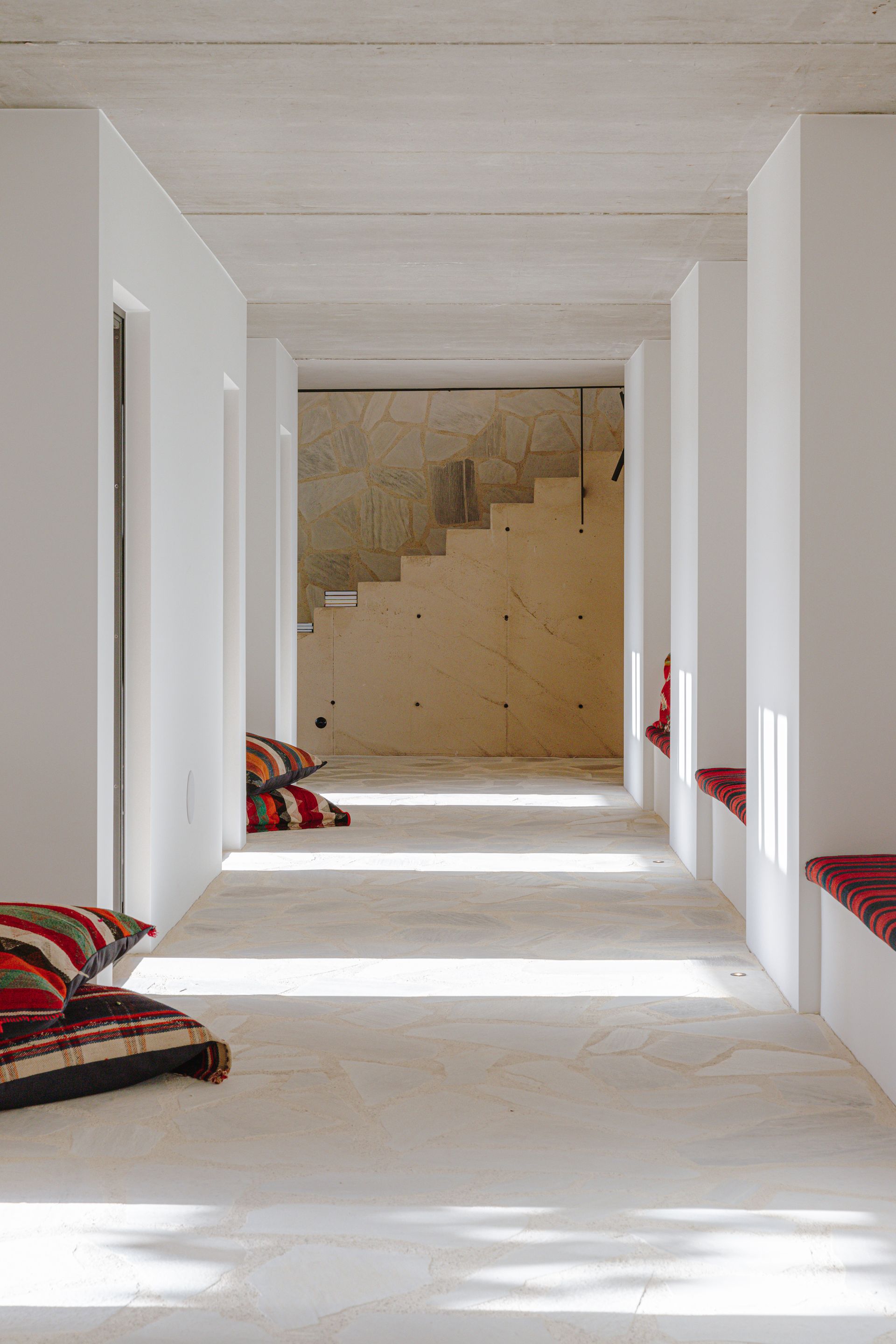 The gentle conversion from a traditional hamlet into a contemporary group of guesthouses has been carried out by fellow Belgian architects Sam Peeters and Toon Martens and their Antwerp-based interior design studio, Contekst. Their precise knowhow of transforming historic interiors with sensitivity and an eye for the essential has offered the vernacular construction a new purpose by accentuating its original features and charm. Small pathways and hidden connections between the spaces, indoor as well as outdoor, create suspense and an intriguing circulation. Privacy has been given special attention, making it possible for every guest to enter solitude whenever needed. Rammed earth, concrete and Opus Incertum stone floors and walls have been used throughout the property, tying the volumes together and obtaining a coherent atmosphere throughout. Together with Lebanese lighting experts PSLab, custom lighting solutions have been integrated in the main entrance as well as in the bedrooms.