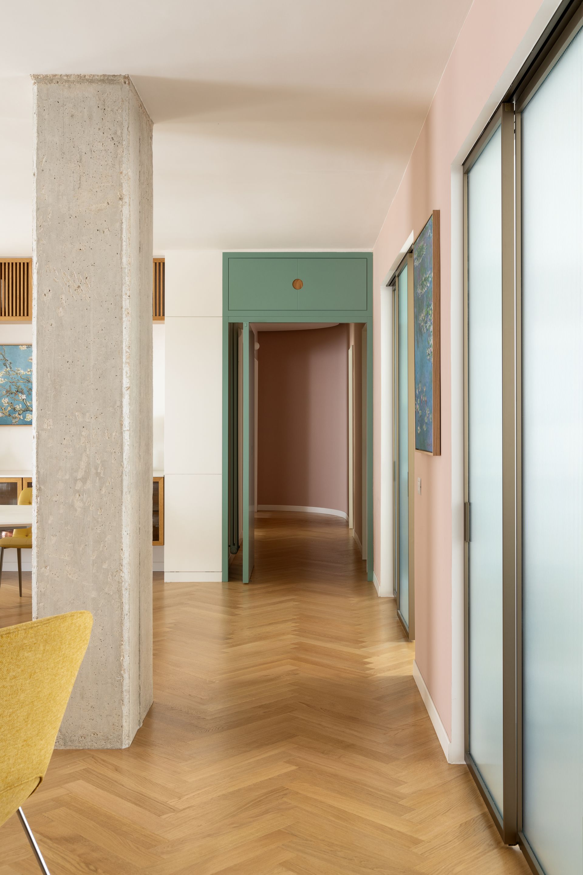 A soft blush-colored wall, rounded on both sides, begins its journey at the entrance and ends in the master bedroom, conceptually dividing the apartment into two: on one side, the kitchen, study, and bathrooms feature terrazzo flooring; on the other, the living area and bedrooms have Italian herringbone oak parquet.