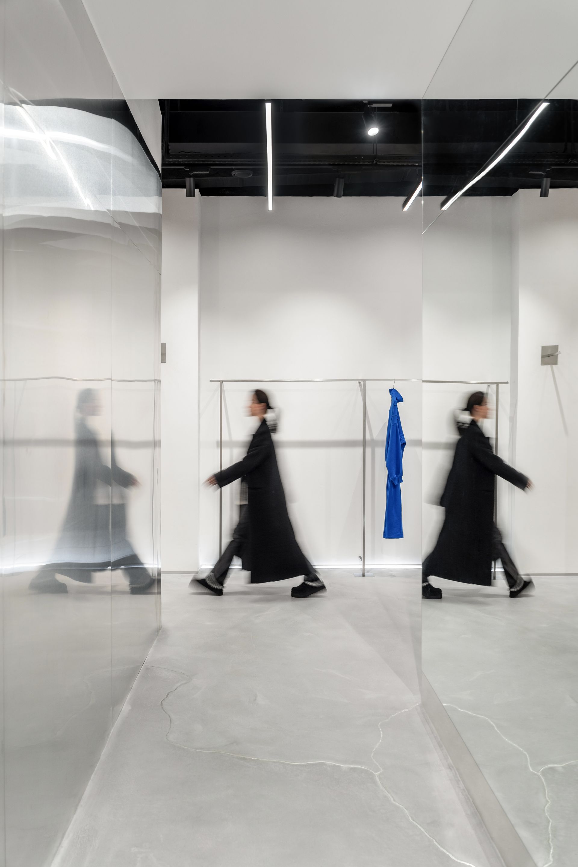 The design concept arose from the digitalization trend in the fashion industry. There are many stores with online showrooms and virtual fitting rooms. Virtual clothes that you can wear while inside the meta-universe are gaining popularity. The virtual space forms its own aesthetics, characterized by minimalism, playing with the proportions of objects and bold accented colors. The CHER'17 store is a physical interior created in the aesthetics of a virtual space.