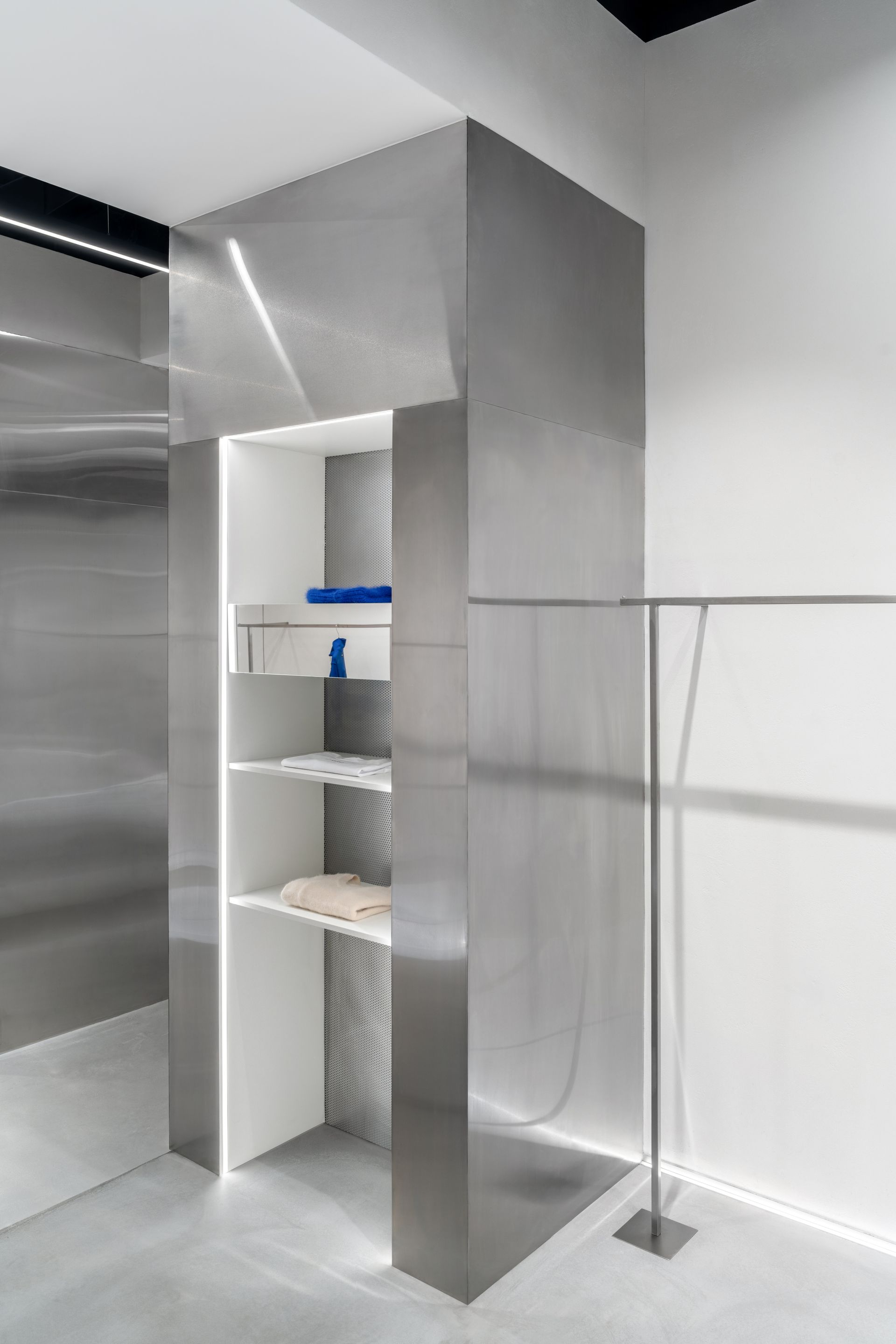 The second hall ("Boudoir") has pale pink walls and a podium. In the middle of the hall stands a pink marble sink with two faucets: one with water and one with sparkling wine. Shopping with friends is not only about trying on and buying clothes but also about socializing and enjoying life.