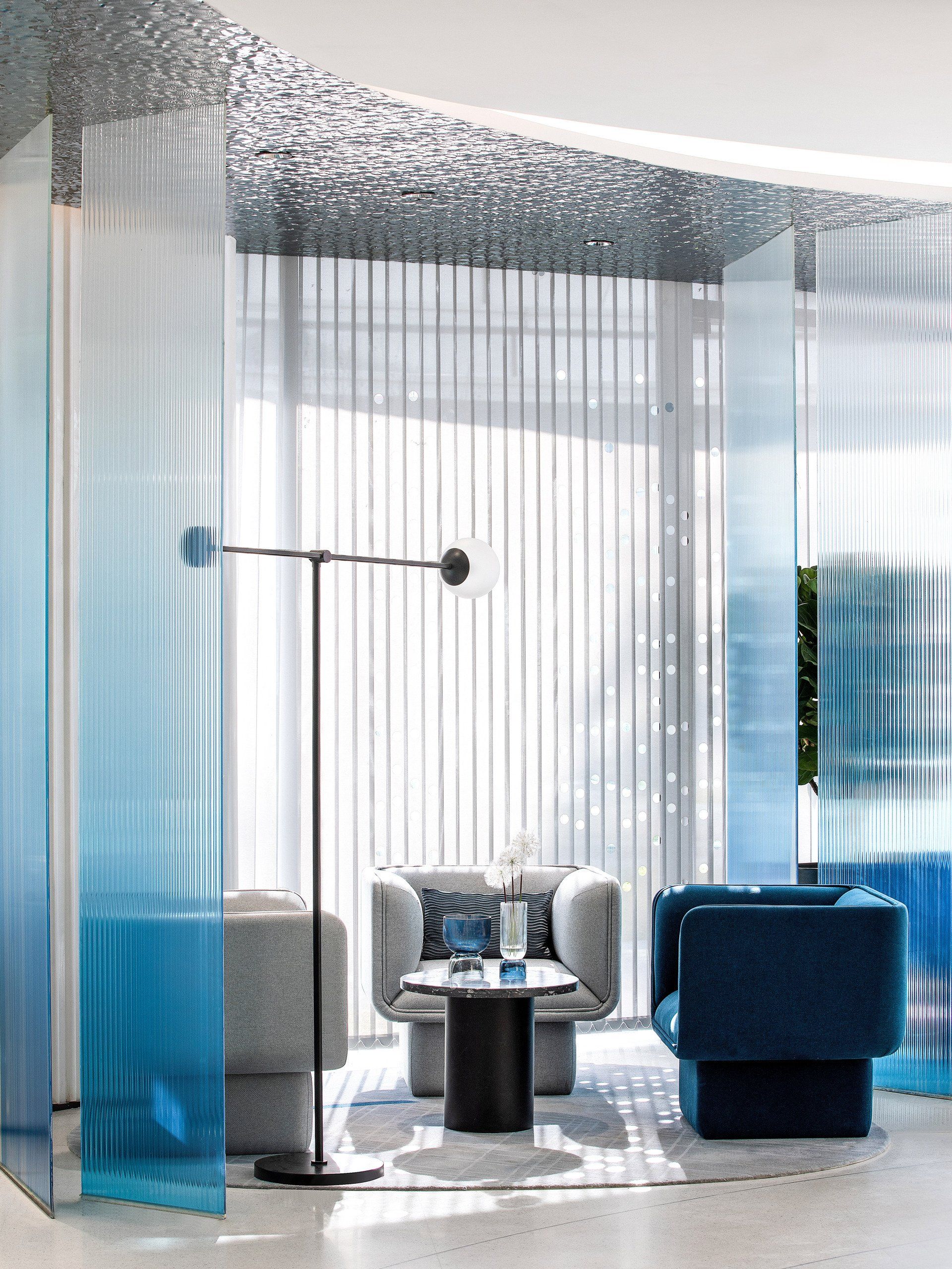 The sales centre makes a spectacular impression, a first even for China, with a sunken plaza dominated by a towering artificial waterfall. The flowing water symbolises the moment of change that visitors experience when they embark on the potential purchase of an apartment: Letting go of the old, welcoming in the new with energy and joy. The well-composed customer journey begins here in an oasis of green with lots of water. Inside, a fluid, elongated space is revealed, continuing the softness of the outside façade. Layered white and blue tones, and a playful use of texture and structure give the space depth. The interplay of shapes and materials in the space, from structured glass to curved ceilings, cites the endless flow and magic of water. The effect is one of soothing calm without any loss of vibrancy.