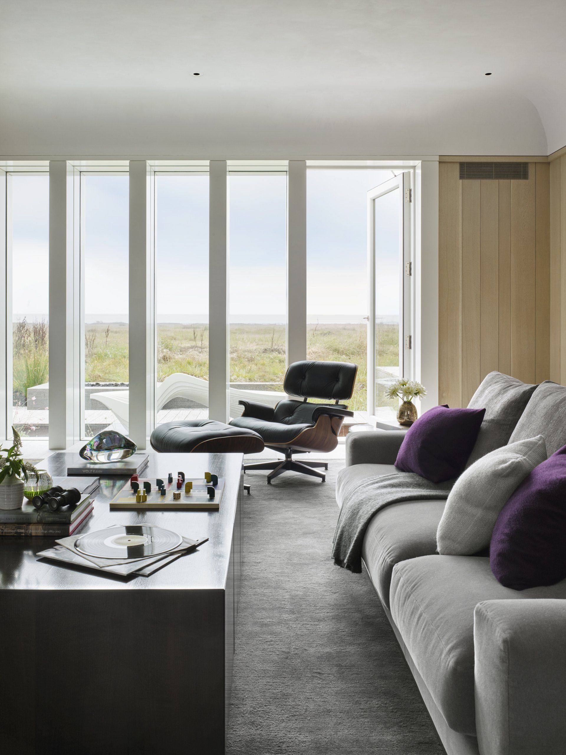 The interior lets the outdoors in with large expanses of frameless windows and sliding glass doors. Architectural details are kept spare to allow special design moments to shine.