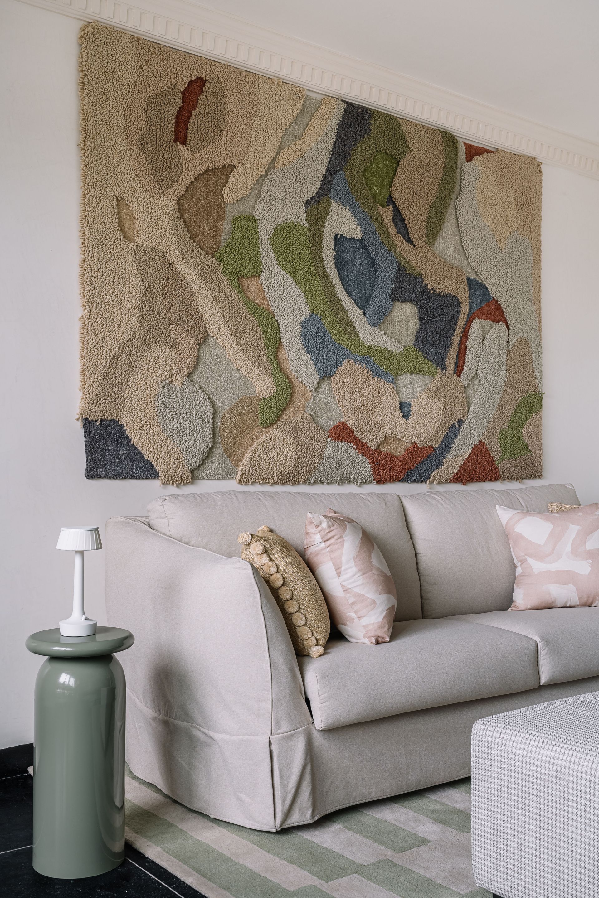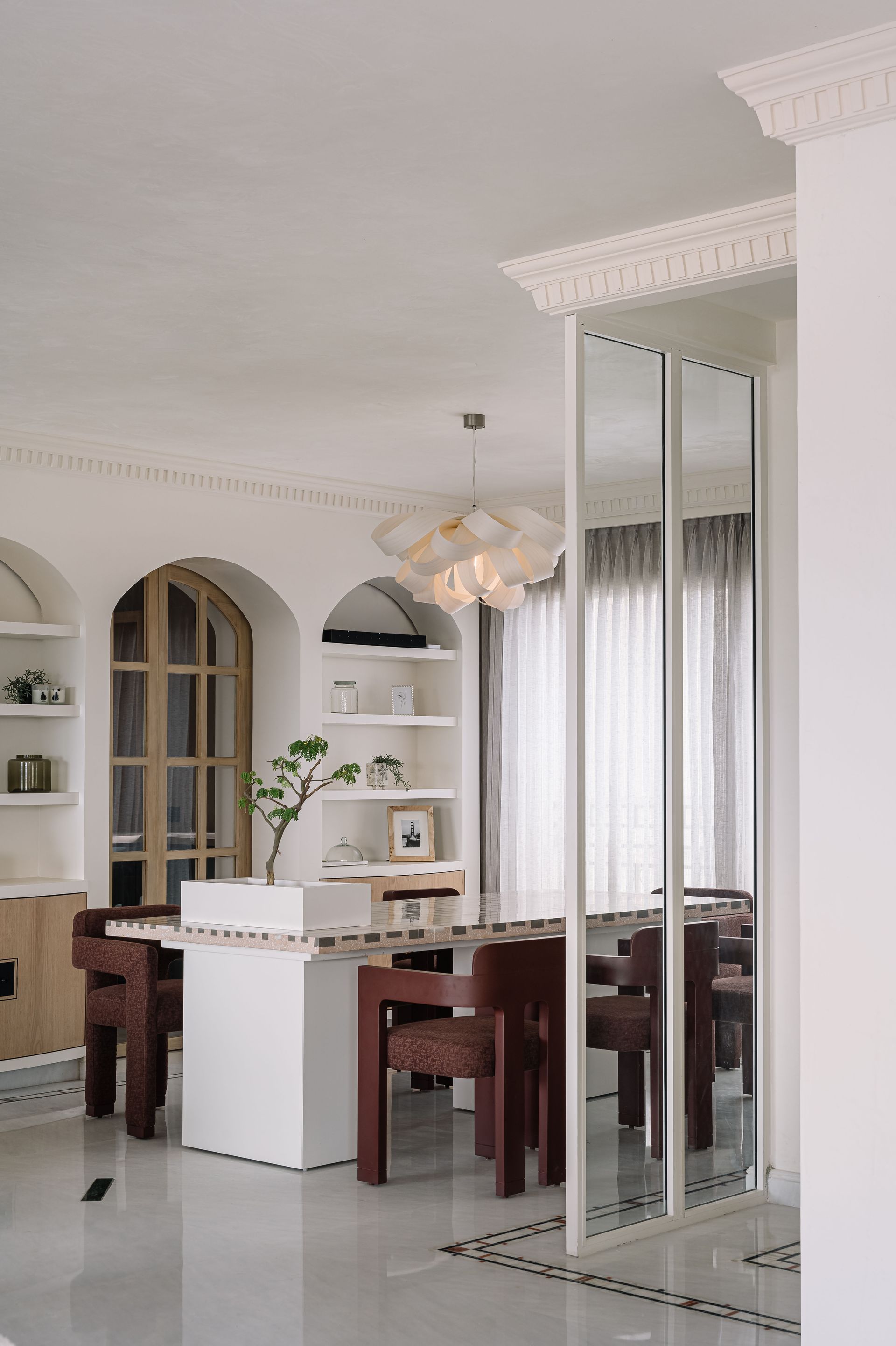 The dining space ties the entire floor together through its central location and connection to both the kitchen and living room. Echoing the careful details that make for the rest of this home, a custom terrazzo-in-situ dining table by Rawsteen mixes perfectly imperfect organic shapes and multiple tones for depth. Above, a pendant light designed by LZF resembles unfurling spools of ferns, complementing the au naturel theme. A series of arches behind hold objets and design pieces while also concealing storage. A single arch between these leads to the dusty teal modular kitchen. Together, the spaces are meant for gathering, celebrating and creating memories over meals and conversations.