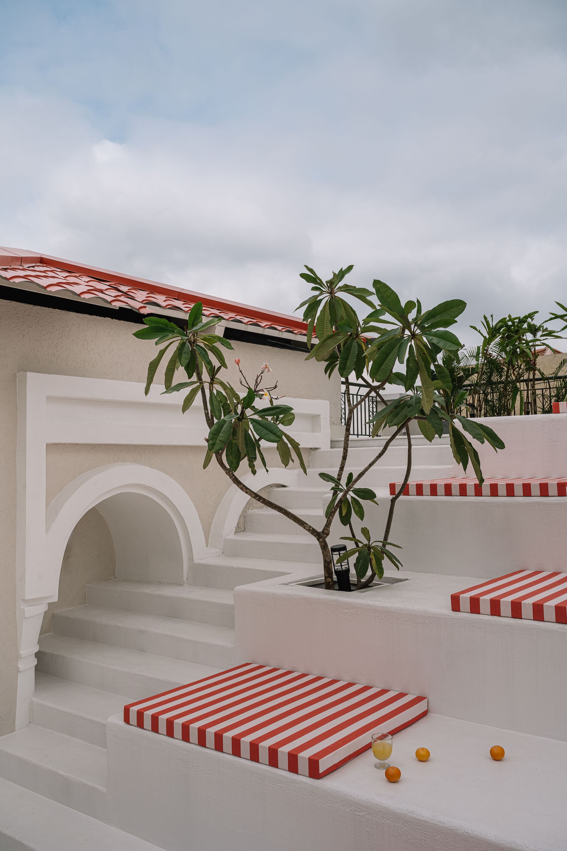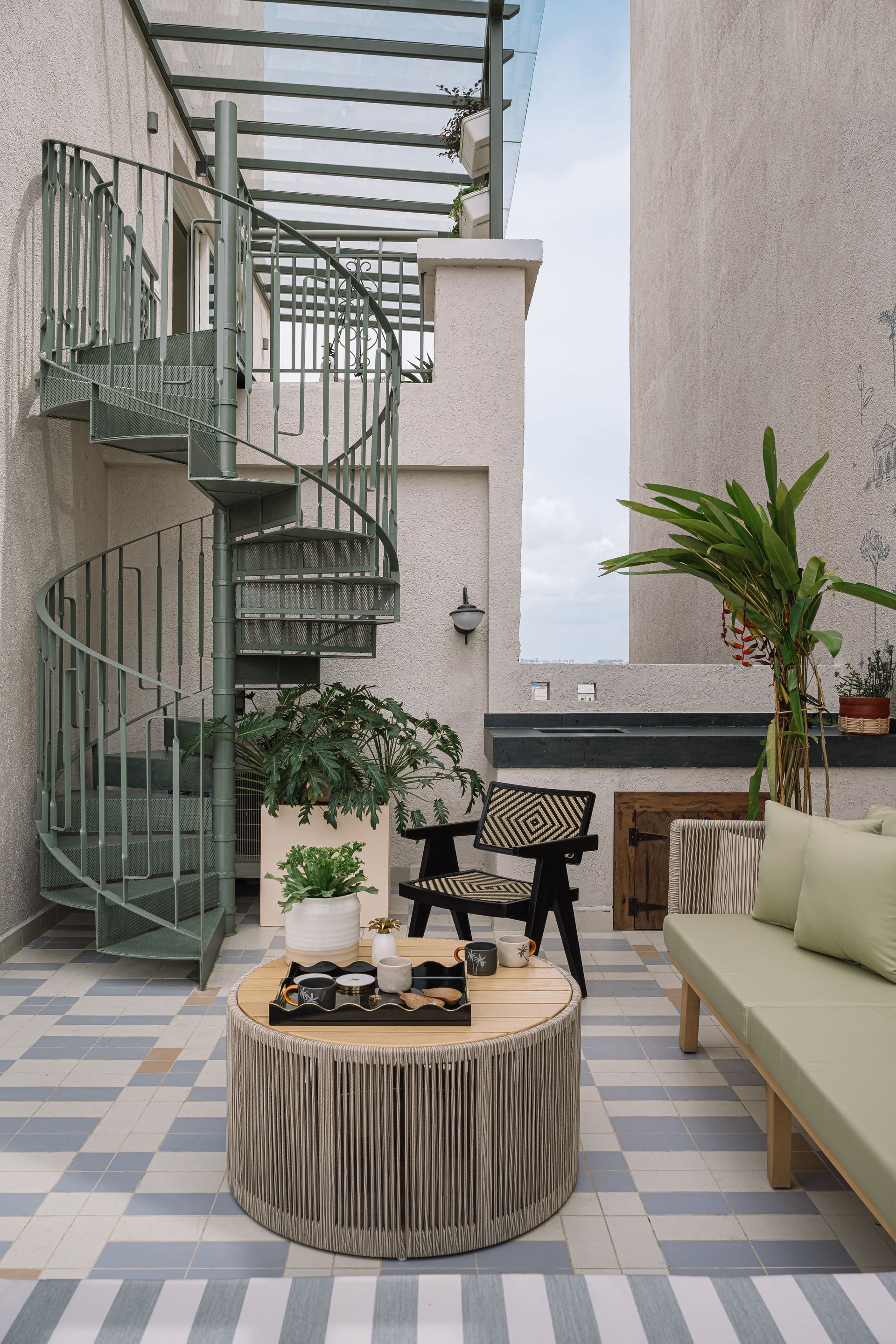 On the terrace balcony outside, a winding staircase leads the way to the master bedroom. A charming hand-painted mural displays nostalgic motifs of the city. The overarching verdant colour palette elevates the greenery here, while a bougainvillea-lined arch frames a picturesque seating nook in one corner - also serving as a focal point when looking out from the cottage-living inspired guest bedroom across.