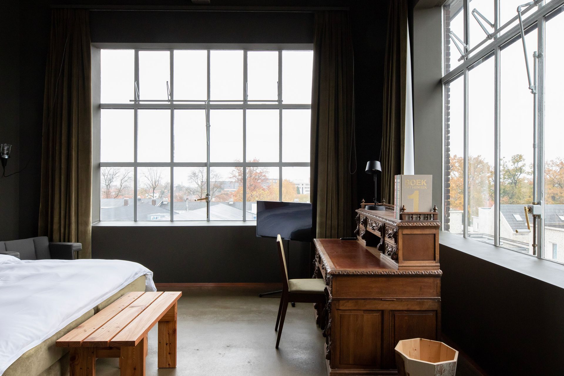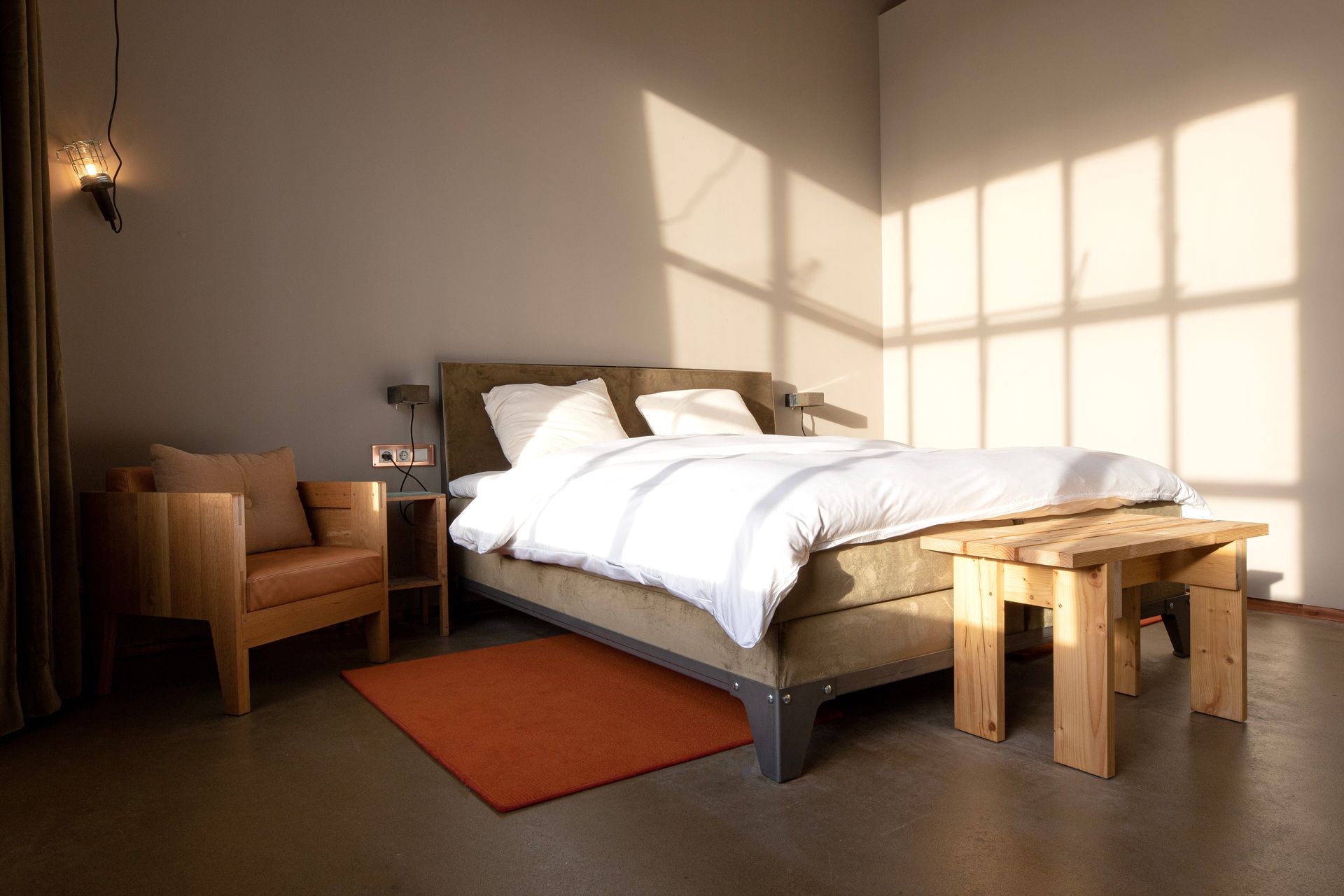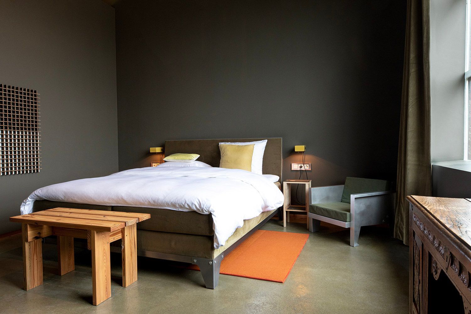 Within the field of interior design for hospitality, Piet Hein Eek represents a distinctive voice. His approach moves away from conventional luxury and instead proposes a more narrative and sensory experience, where design tells stories of materials, time and human work. The Hotel Piet Hein Eek occupies the third floor of the designer’s complex and features 13 distinctive rooms. No two rooms are the same: they differ in colours, materials, details and furniture, often designed in dialogue with artworks. On the floor below, the reception, restaurant and bar form a vibrant open space that also hosts the WonderRoom, where art, antiques and design objects are displayed. Guests can also access the rooftop terrace Dakbar, offering panoramic views over the industrial landscape of Eindhoven.