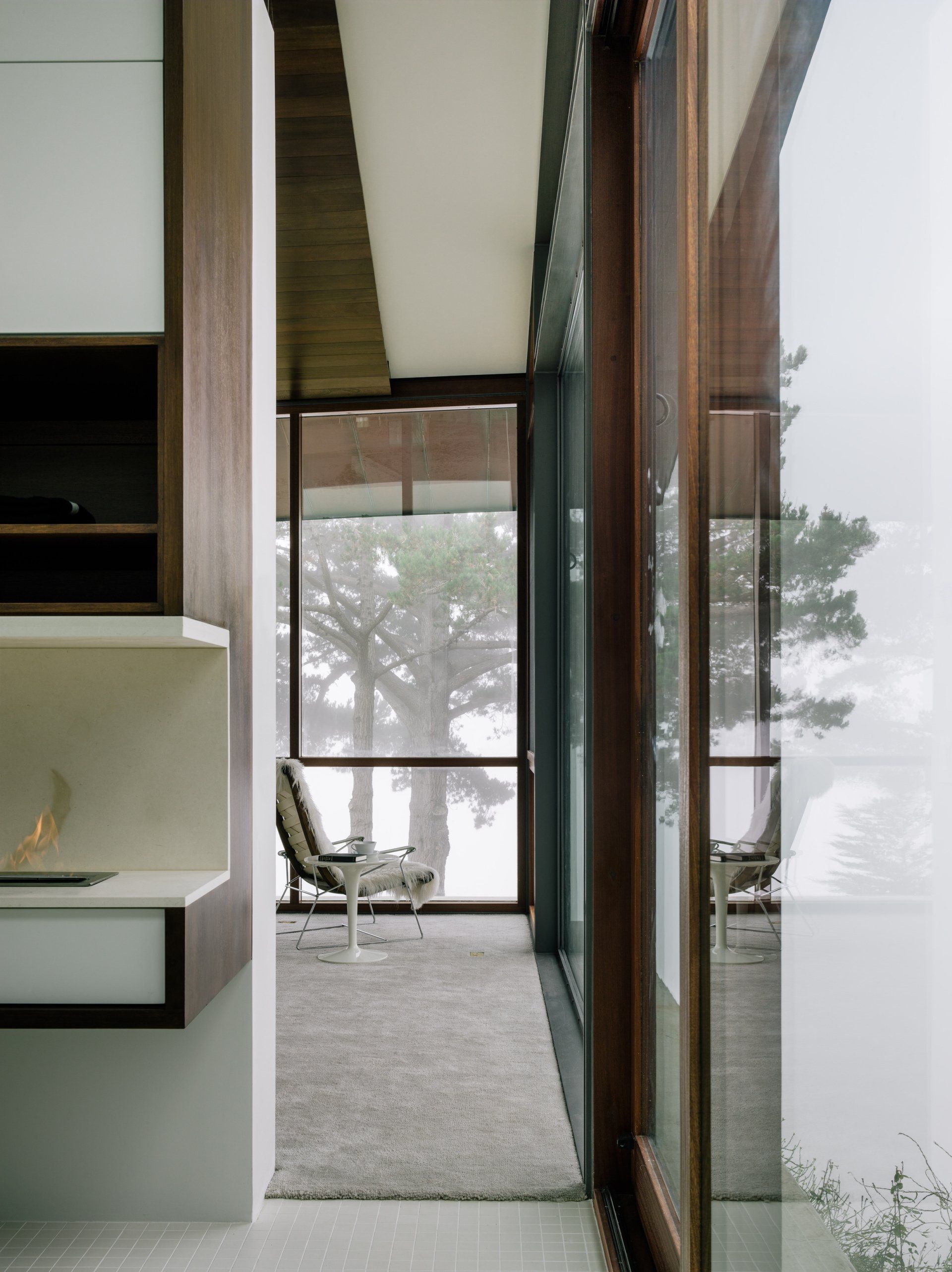 The long, thin volume conforms and deforms to the natural contours of the land and the geometries of the bluff, much like the banana slug native to the region’s seaside forests. In this way, the complex structural system applies and defies natural forms to accommodate the siting. The house is cantilevered 12 feet back from the bluff, both to protect the cliff’s delicate ecosystem and to ensure the structure’s integrity and safety. The interior is a shelter, a refuge in contrast with the roughness and immense scale of the ocean and cliff. The house also shields the southern outdoor spaces from the powerful winds that blow from the northwest.