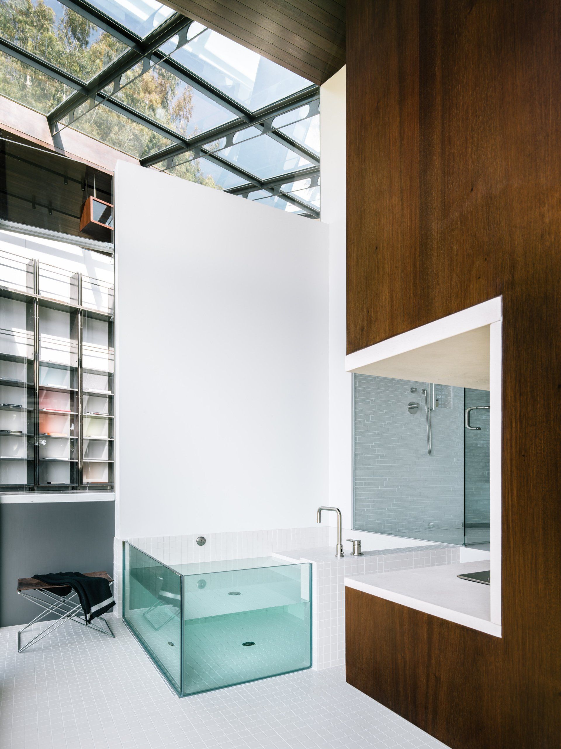The lower volume, a double-cantilevered master bedroom suite, acts as a promontory above the ocean, offering breath-taking views from its floor-to-ceiling windows. The link between these two volumes is the glass library/den; it is the hearth of the house, a room that unites the house inside and out both with its geometry and its transparency.