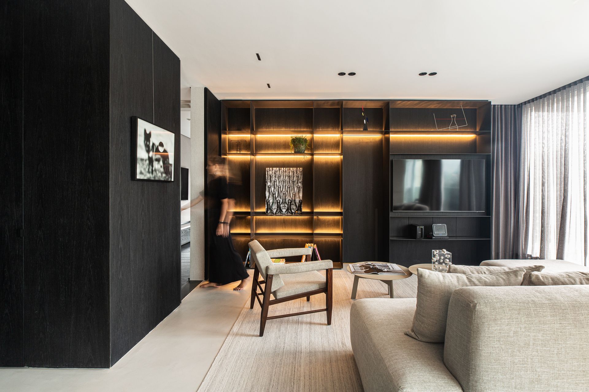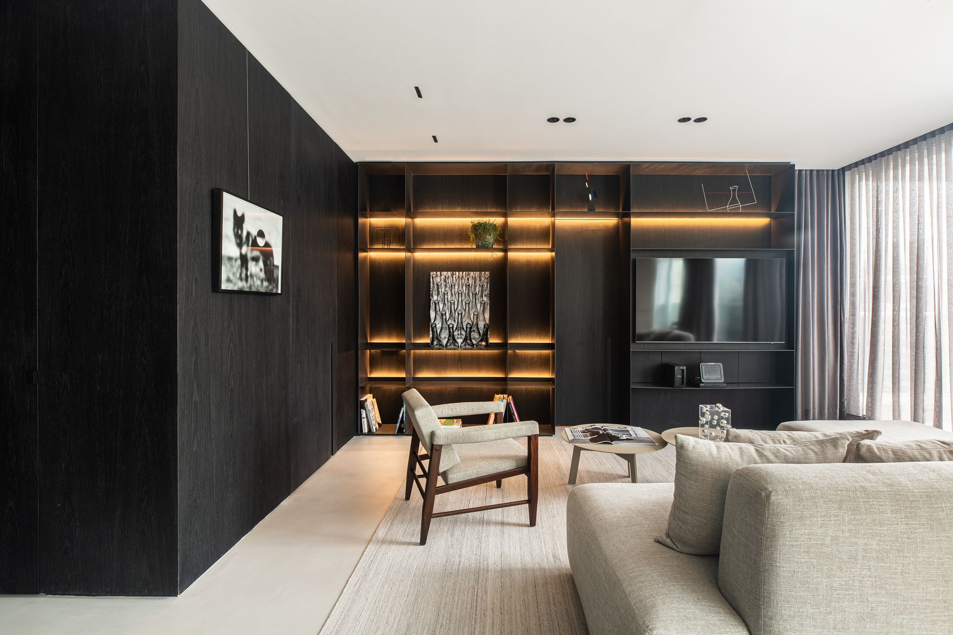 In the living area, the lounge, TV, dining, and kitchen zones merge into a single, naturally lit space. On one side, a large glazed façade connects the interior with the city; on the other, continuous ebonized wood panels line the walls, housing storage and seamlessly concealing doors to the powder room, laundry, and pantry. The millwork is meticulously crafted: joints and proportions create a uniform visual rhythm, while the deep, satin ebonized finish reinforces the cosmopolitan sobriety befitting a bachelor’s residence. At the far end of the living area, a slender steel shelving unit, offset slightly from the wall panels, supports the TV zone. Rear LED lighting casts a soft halo, highlighting the homeowner’s art collection and personal objects, including works by Raul Mourão (1967) and Alexander Calder (1898–1976). On the side wall, another painting completes the composition. At night, when only the shelving is illuminated, the space takes on the aura of a private gallery.