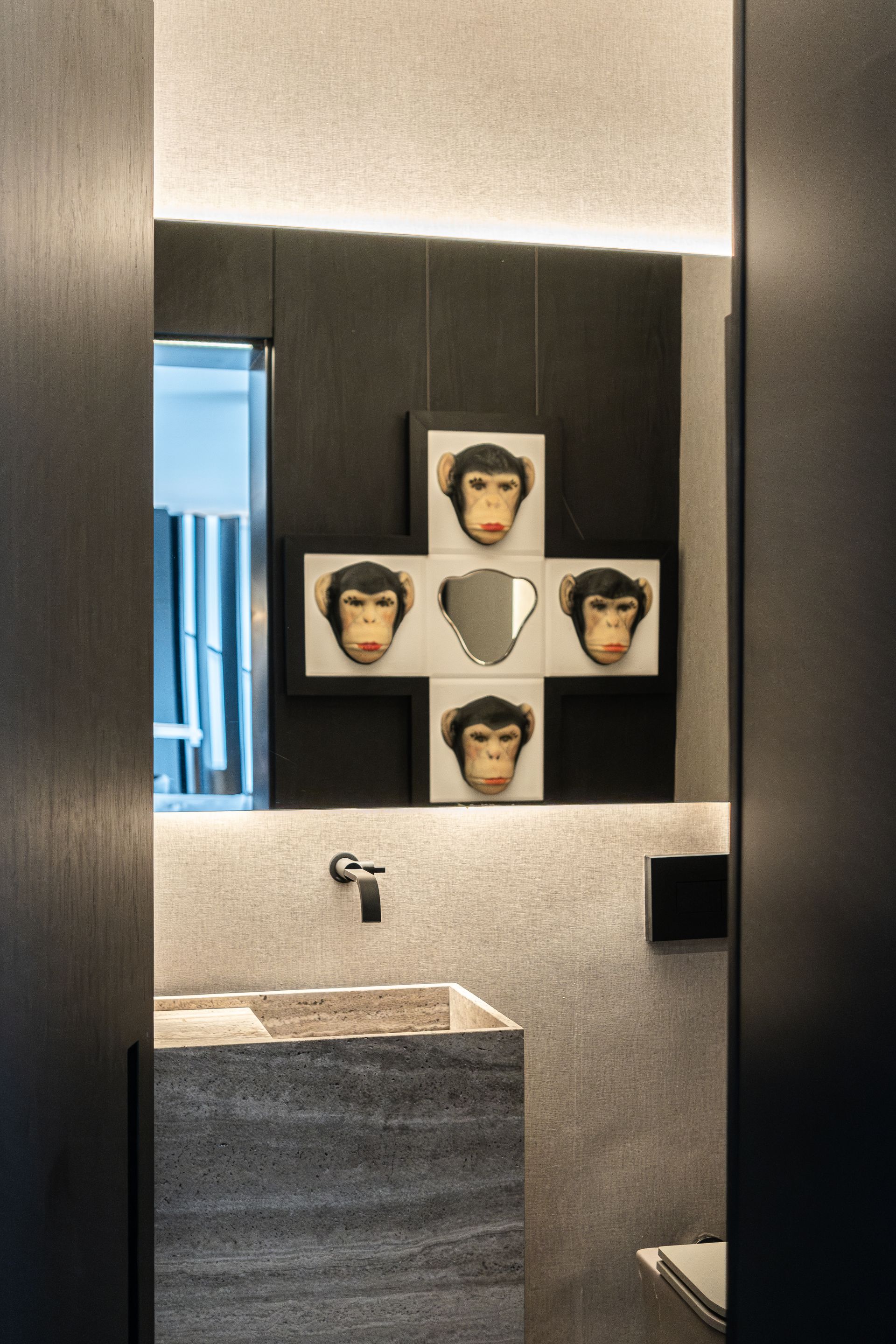 the enclosure. Its walls are covered in fabric, and the gray travertine marble sink assumes a sculptural role. Indirect lighting emphasizes textures and creates an atmosphere of introspection, complemented by a work by Nelson Leirner.