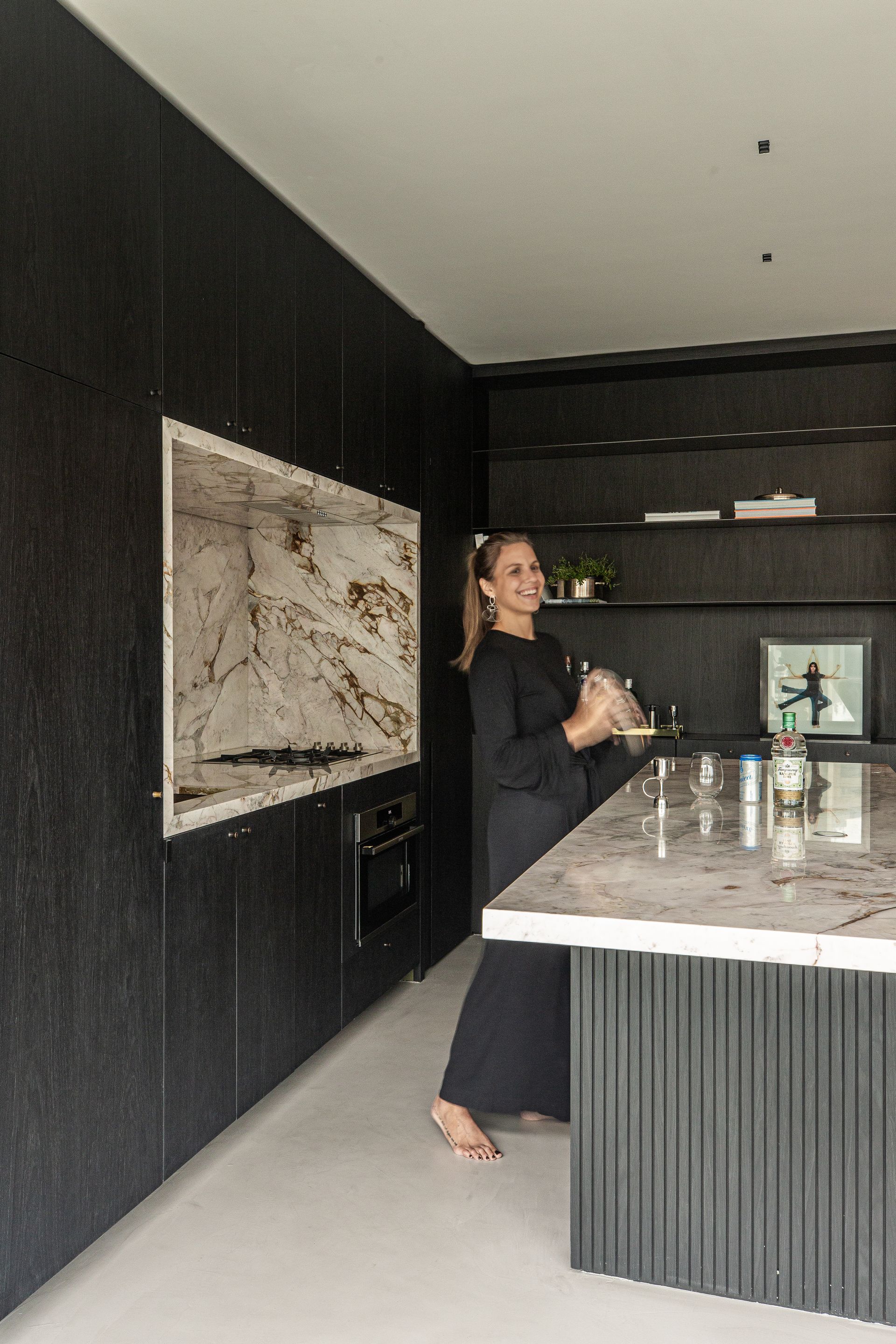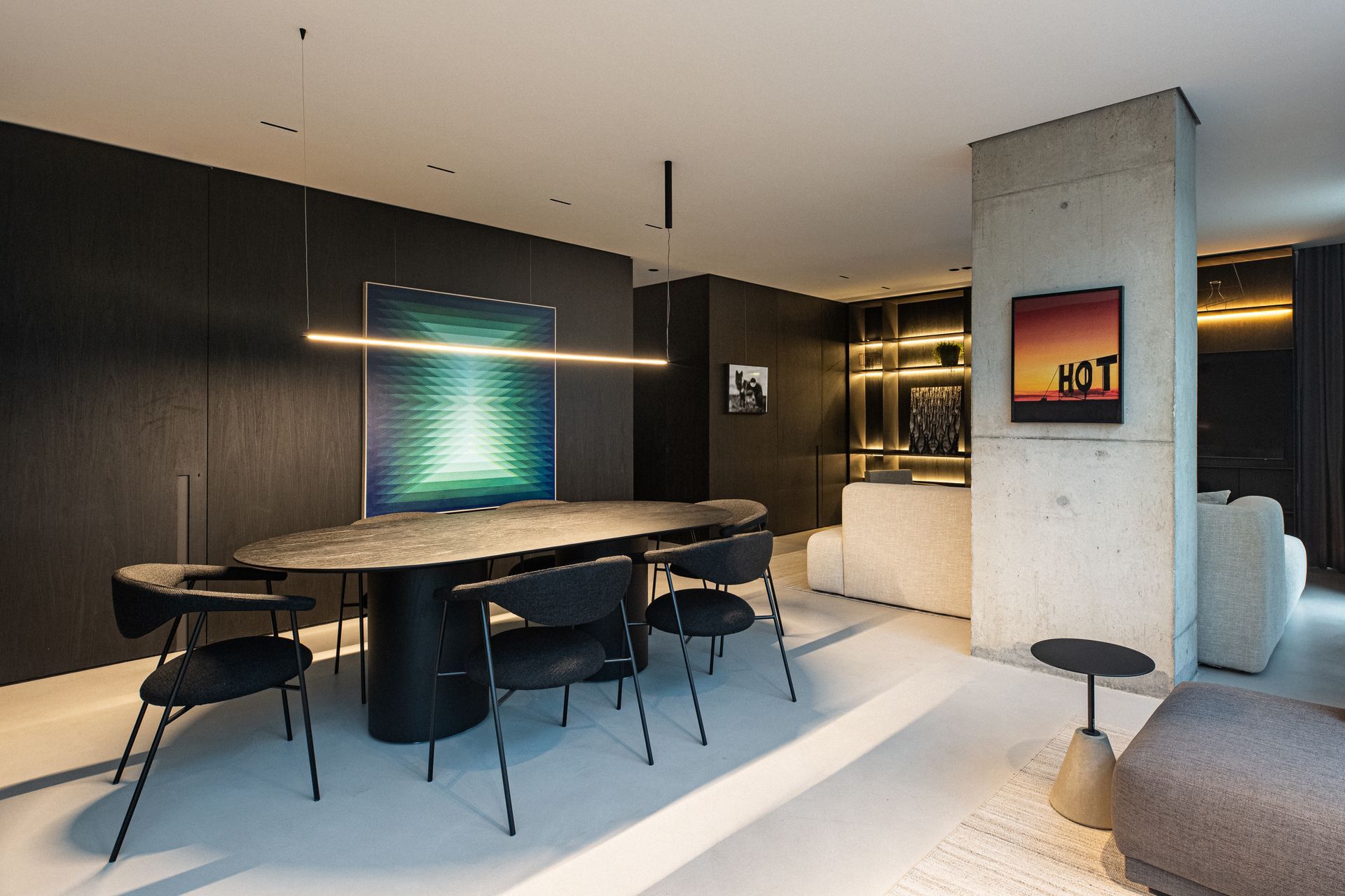 Upon exiting the elevator, visitors are immediately immersed in the residence’s atmosphere. The entry hall, far from conventional white, is clad in Tresuno, a material that mimics the texture of concrete cast in wooden forms, offering tactile comfort. The ceiling and walls share the same finish, while a recessed light line traces a subtle path. Burnished concrete flooring extends throughout the social areas, reinforcing the visual continuity.