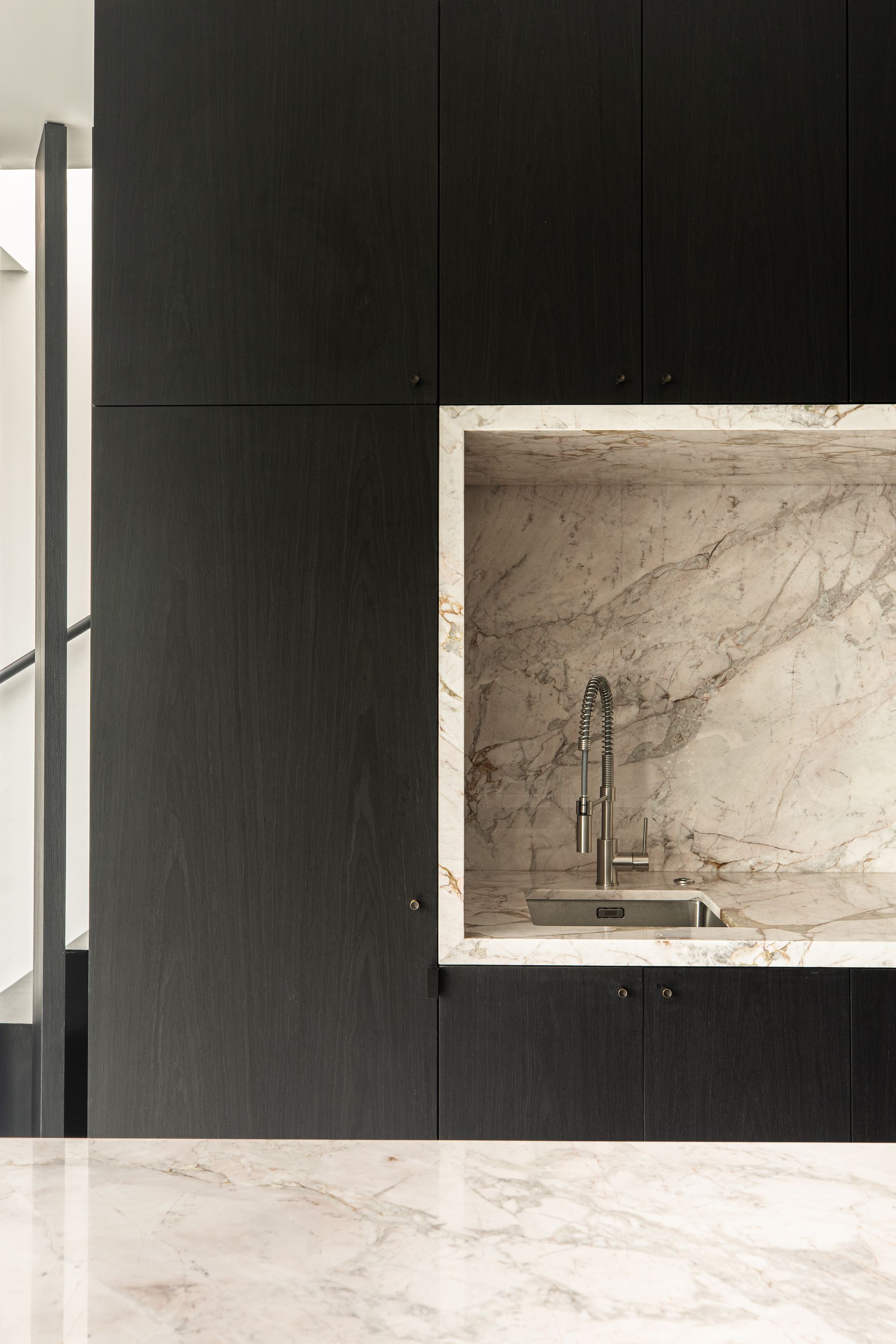 The powder room, discreetly integrated within the millwork, does not have a dividing wall; the panel itself serves as