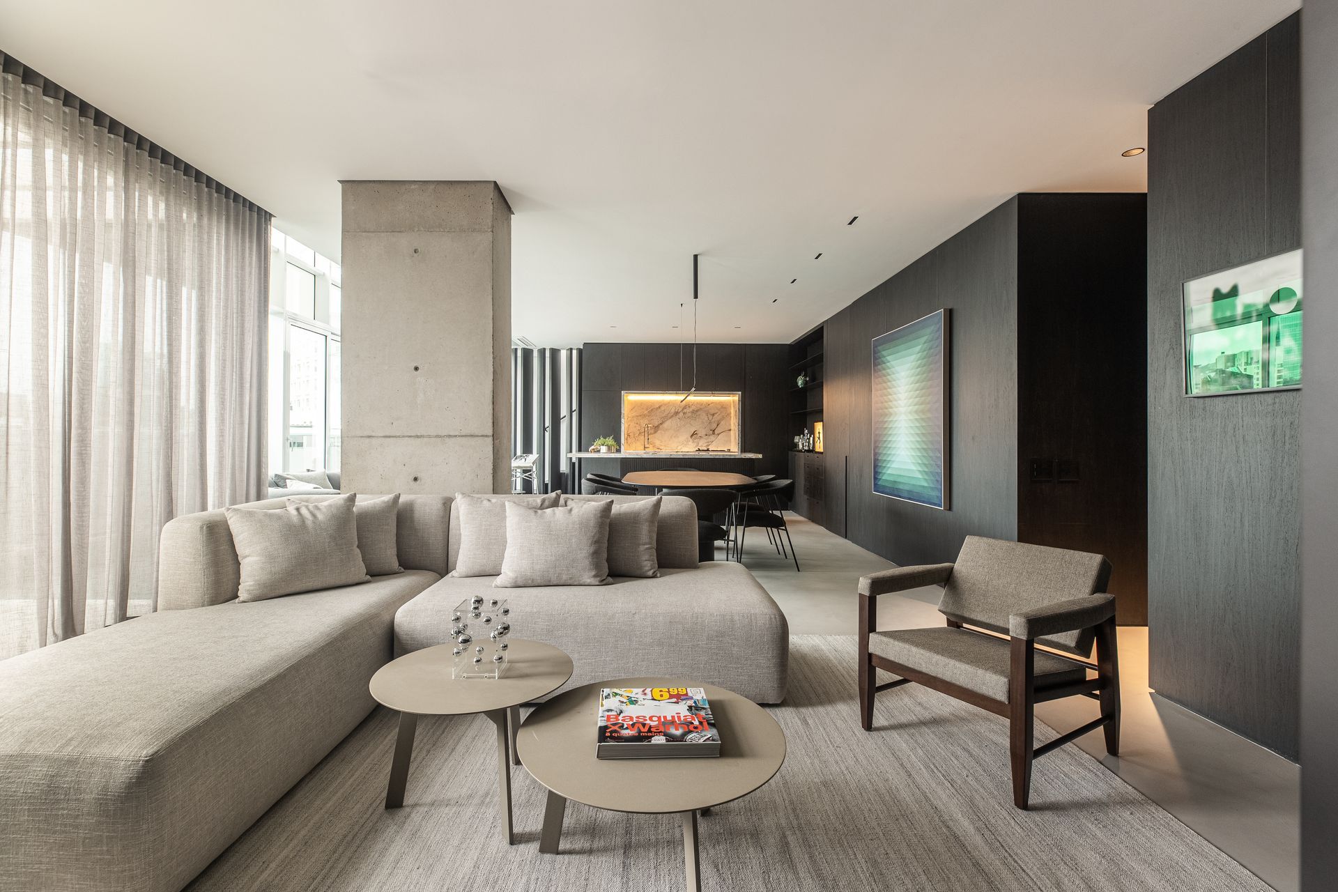 At the opposite end, the kitchen and dining areas harmonize seamlessly. In particular, in the dining area we find the Round table from Folio Living is surrounded by Curva chairs by Zanini de Zanine for 31 Mobiliário, with a linear pendant reinforcing the horizontal flow. On the wall, a painting by Daniel Mullen (1985), suspended by steel cables, injects color into the neutral palette. While the kitchen was designed as an extension of the social zone, suitable for family gatherings or business meetings. Wood panels extend to conceal access to support areas. Appliances (including refrigerator, wine cooler, oven and hood( are neatly integrated, maintaining visual continuity.