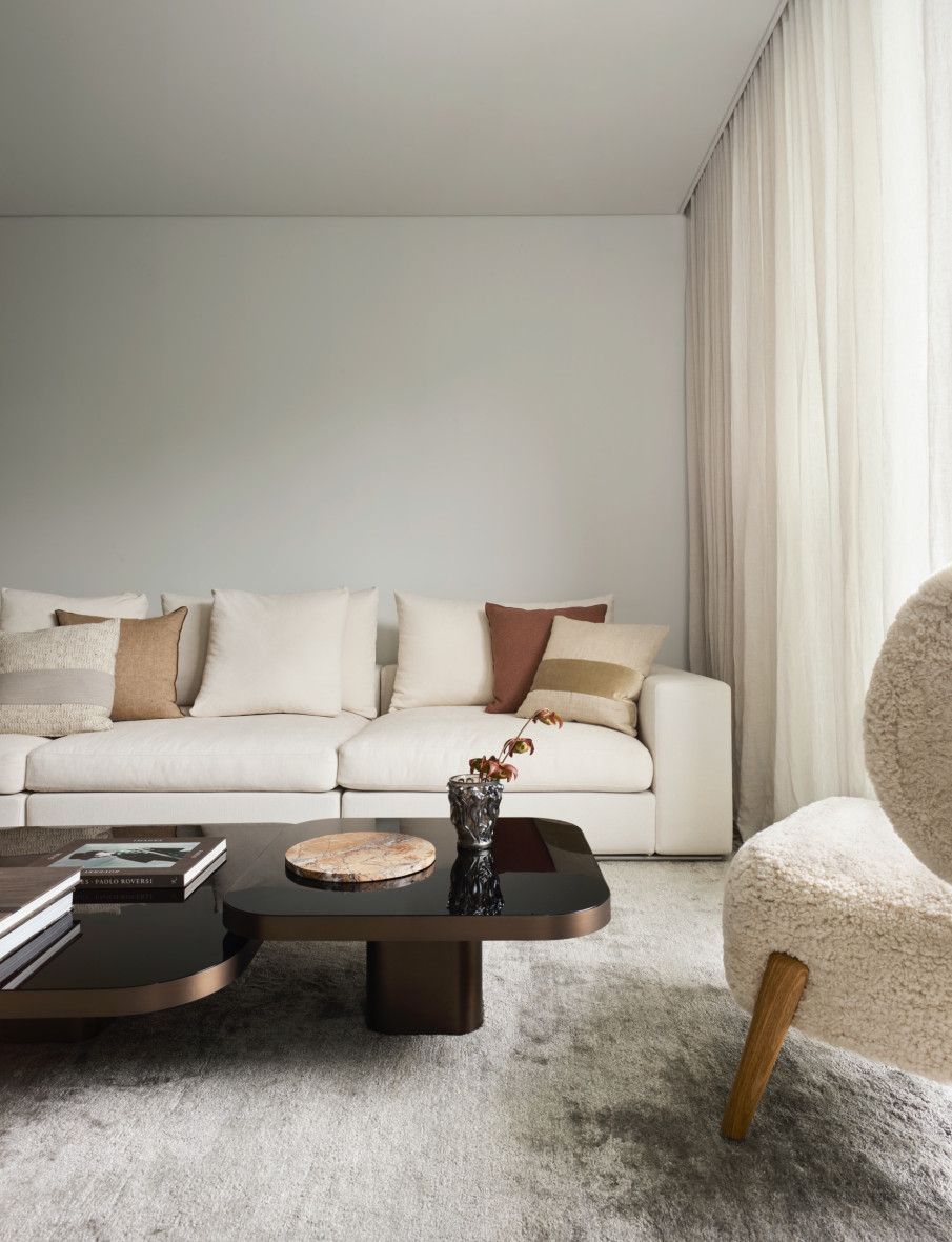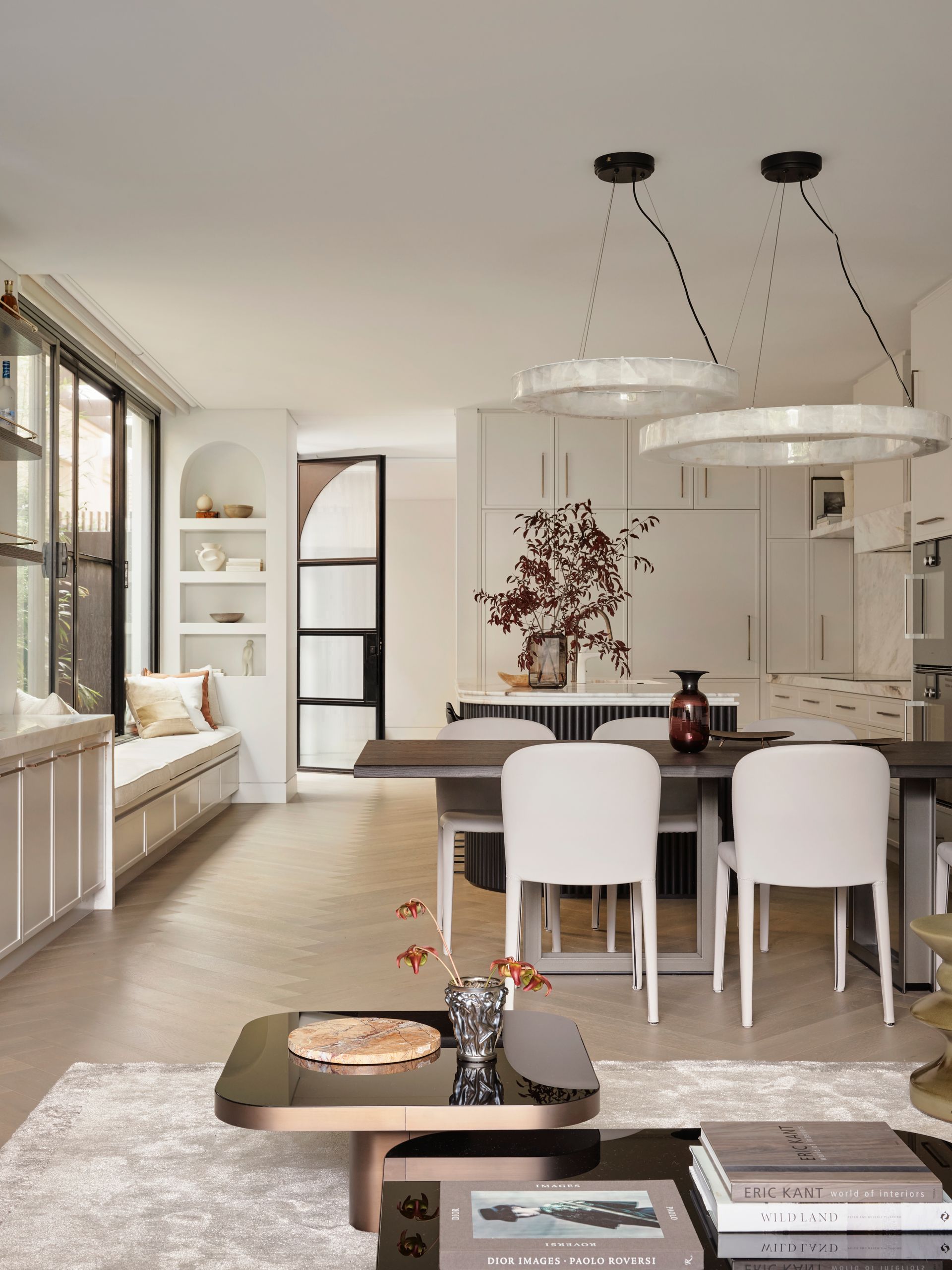 Next to the kitchen there is the dining area including a mirrored bar, and then the living room. The entire space is flooded with natural light: the designers changed around all the windows and the configuration. And that enabled them to open all these side passage windows, which had originally been designed as high- level windows.